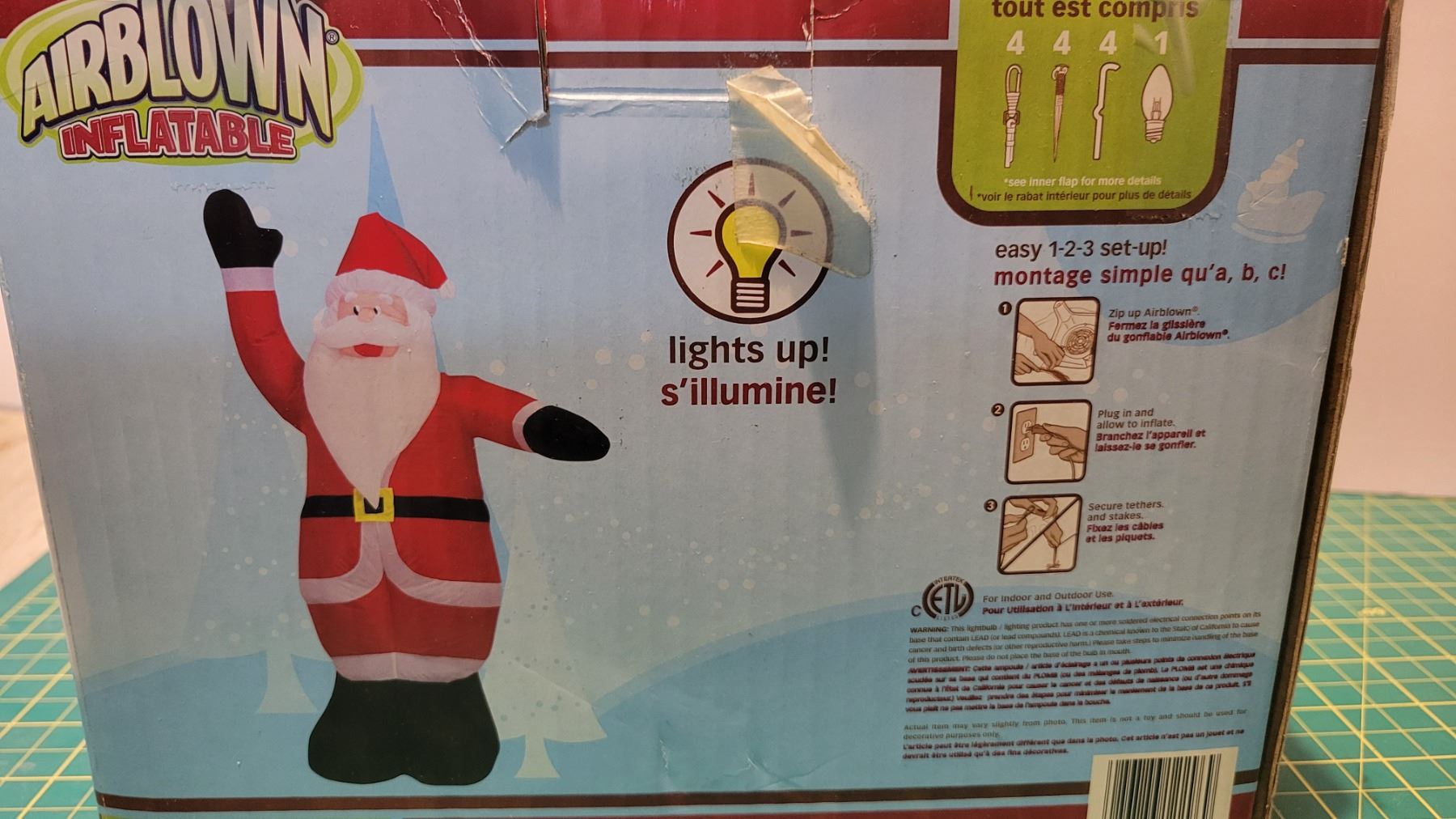 Working inflatable Santa with box and all accessories. Need to tap fan to get it to start, but works fine once it gets moving.