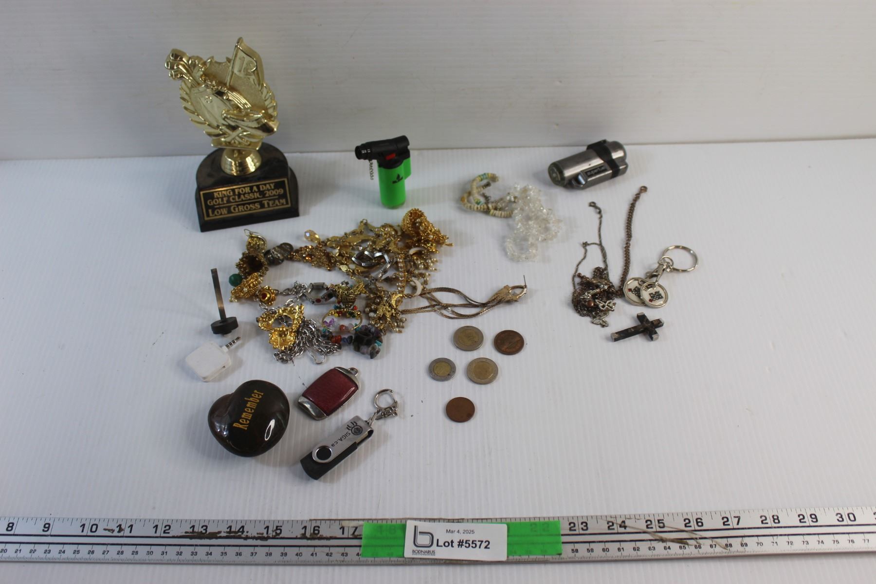 International Coins, Assorted Jewelry, Key Chains, Lighters, Flash Drive, King for a Day Golf Classic 2009 Low Gross Team Decor and Misc