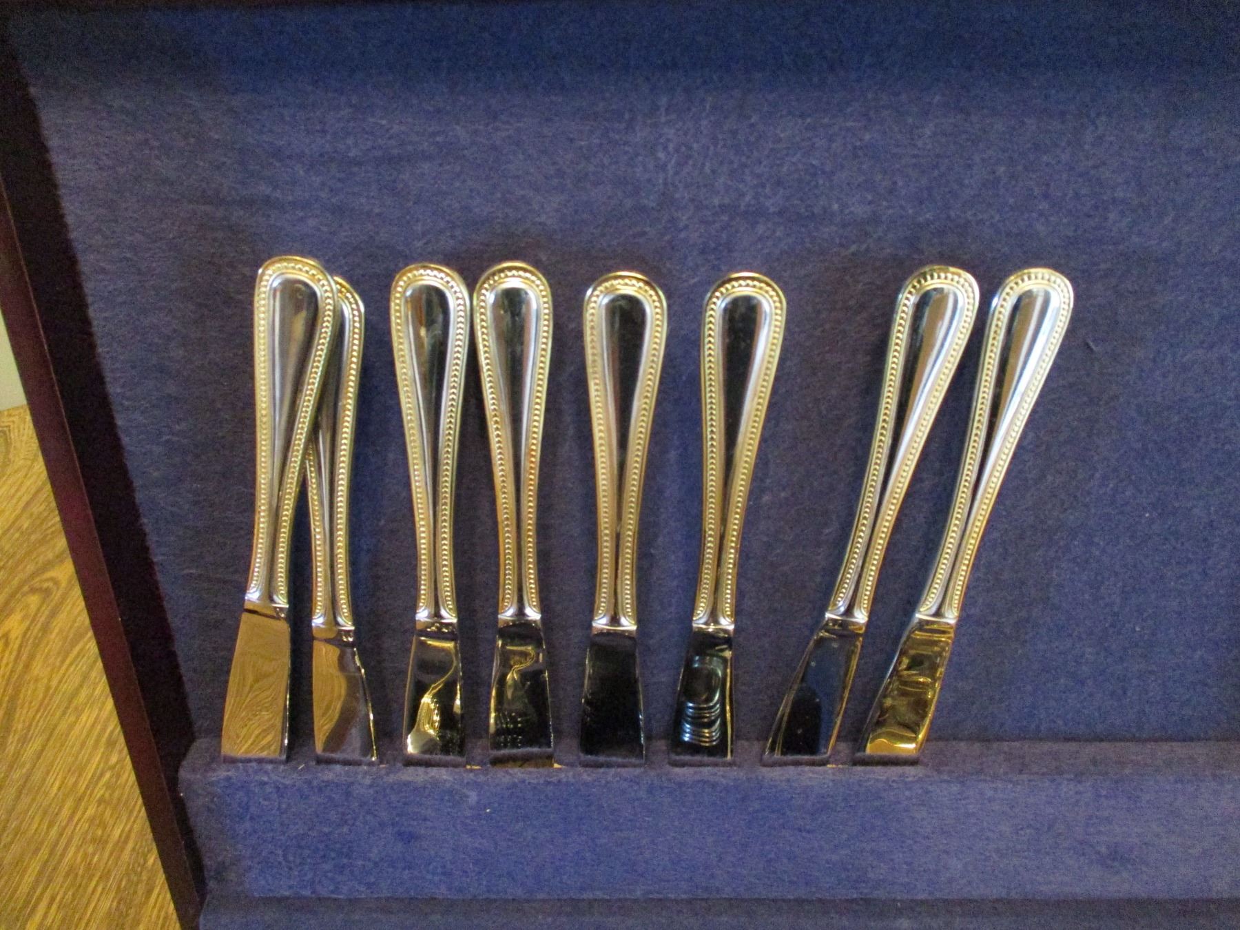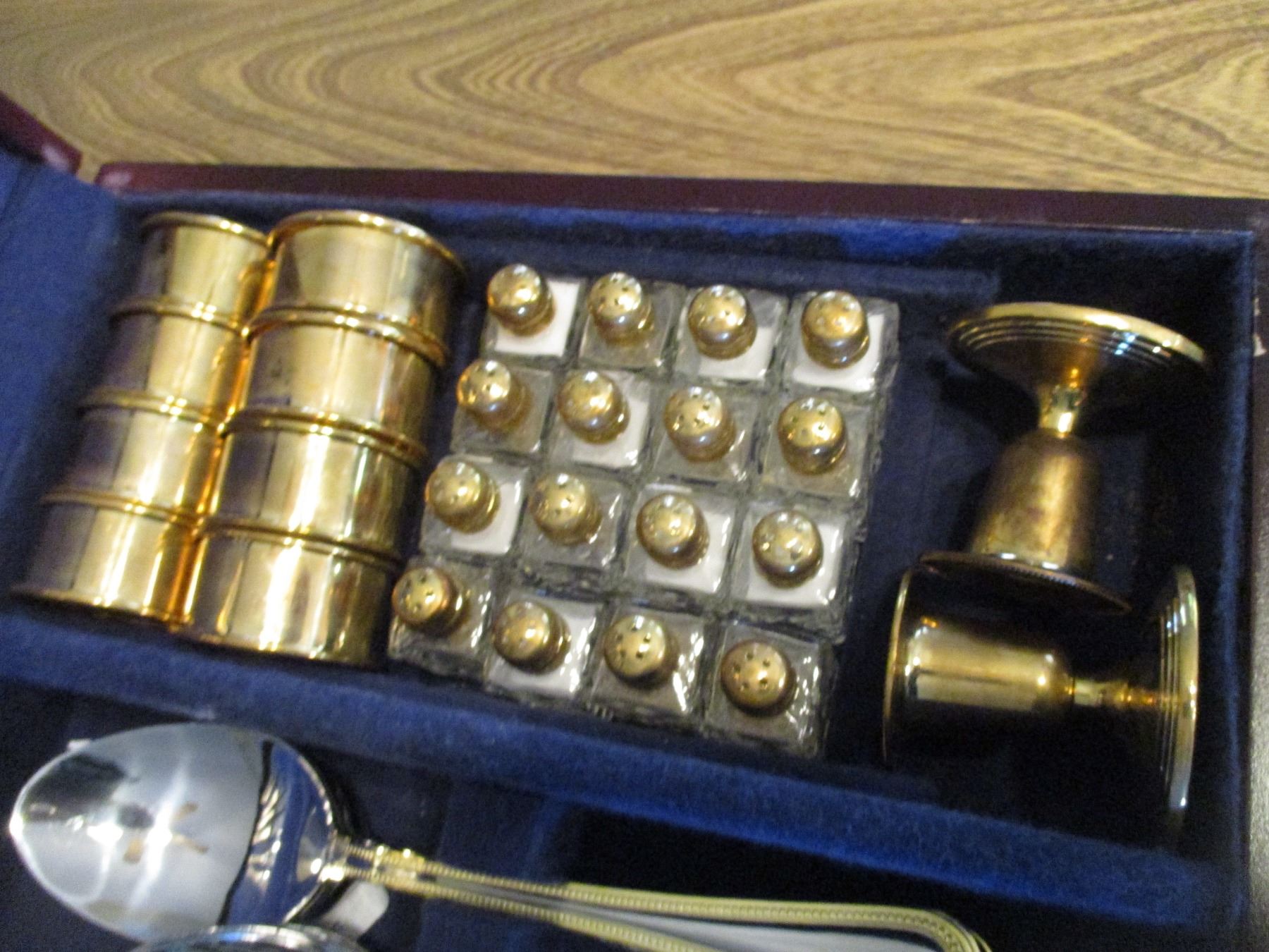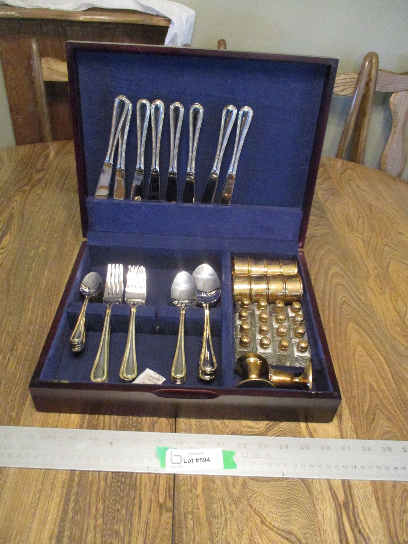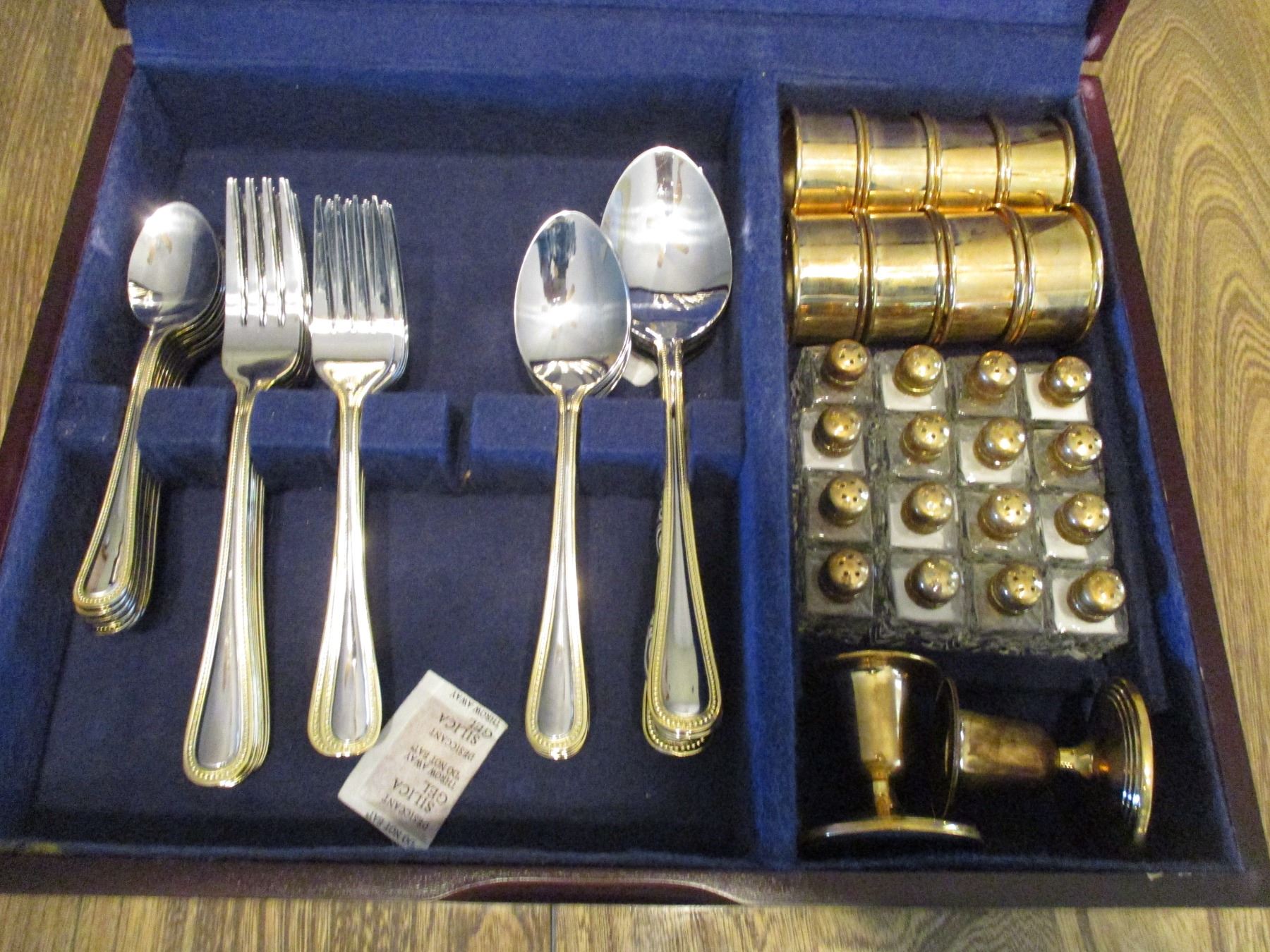 International Stainless Steel Flatware Set w/Wooden Box , S & P Shakers, Napkin Rings, Candle Holders etc.
