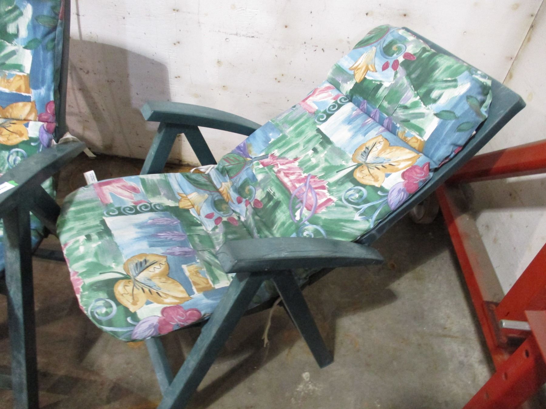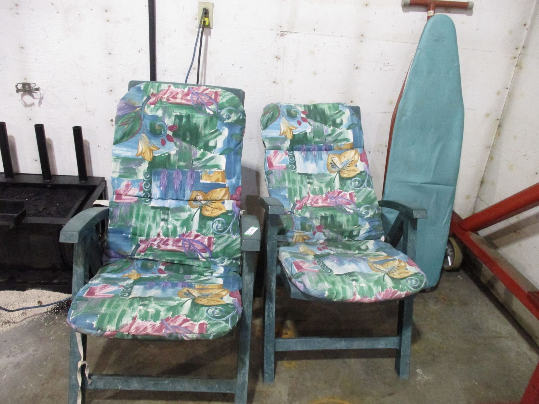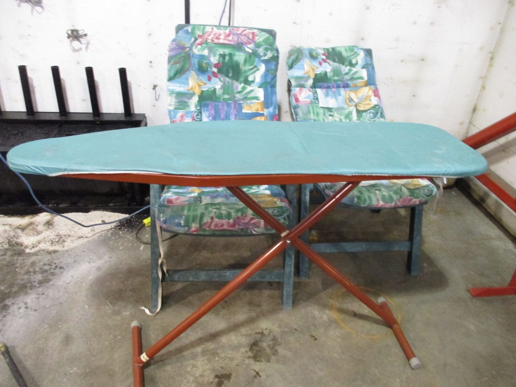 Ironing board + (2) plastic chairs