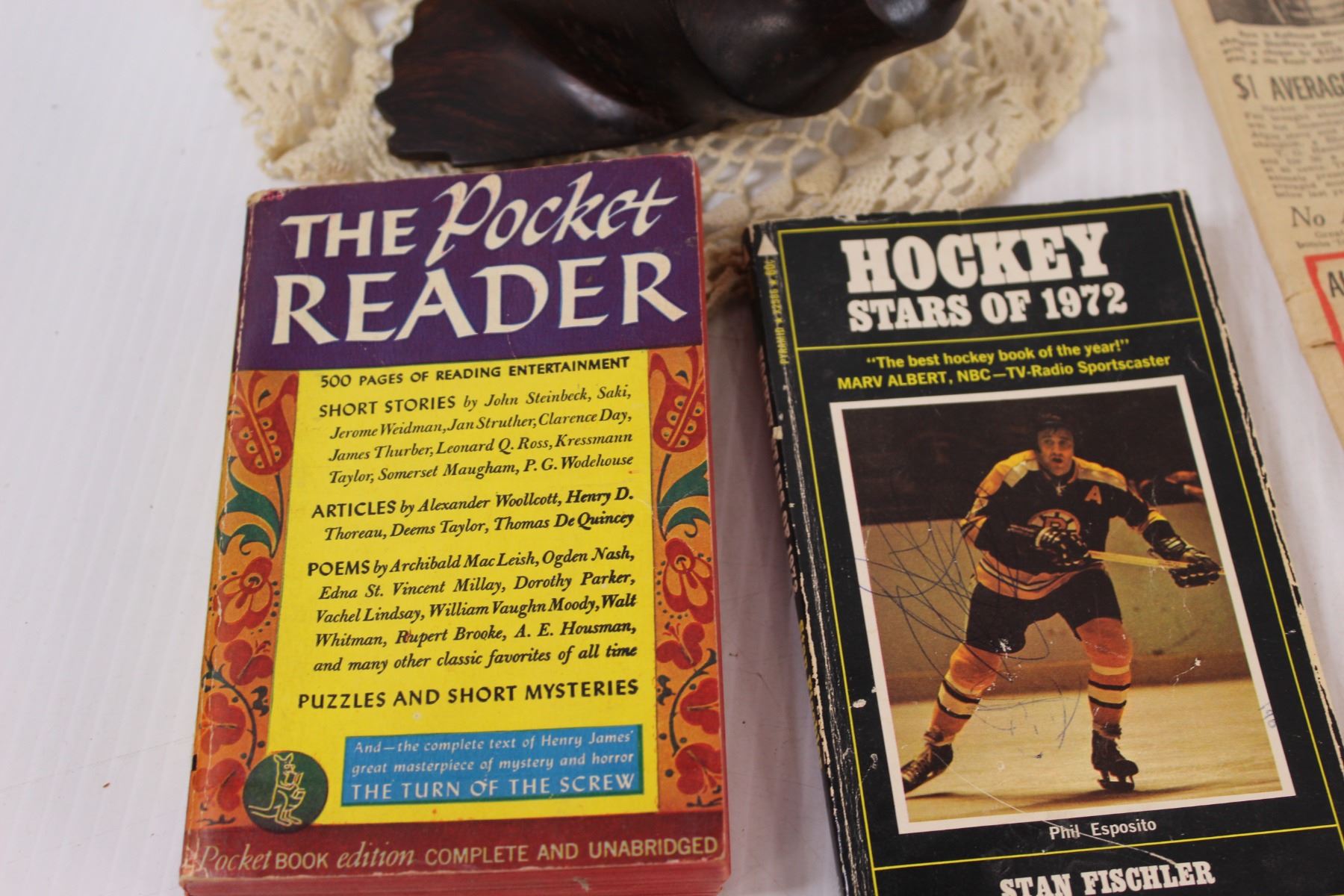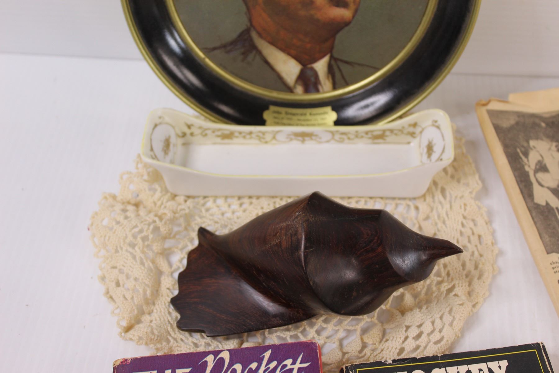 JFK Memorial Plate, 1954 Prairie Farmer Newspaper, Wood Carved Shell, Hockey of 1972 Book, Misc.