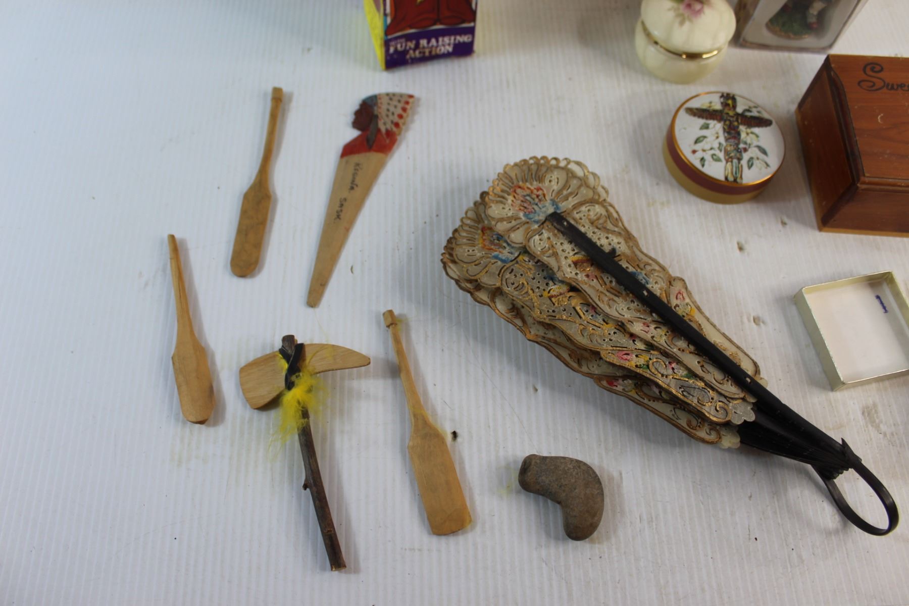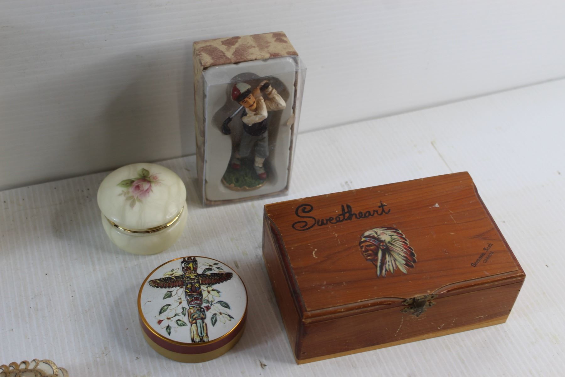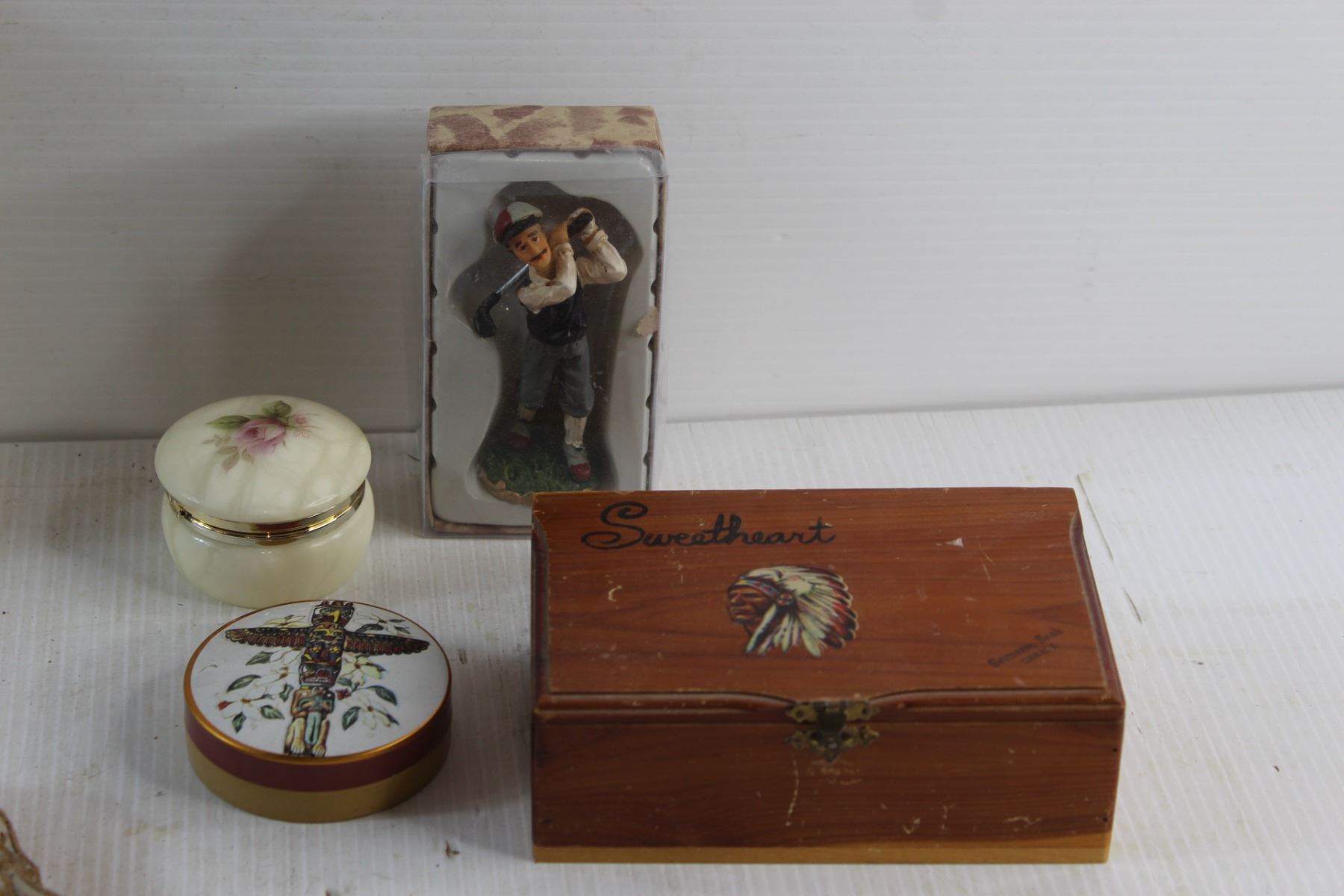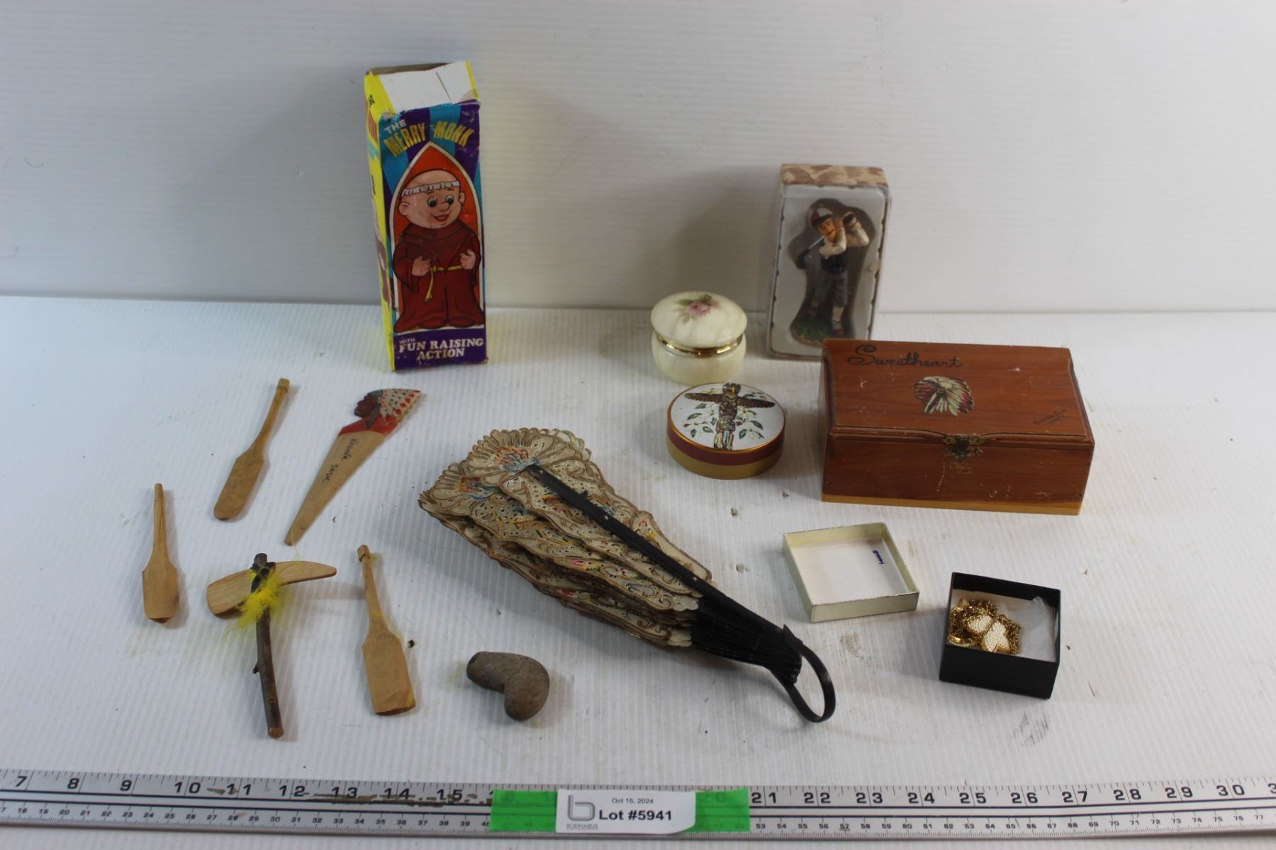 Japanese Hand Fan. Indigenous Ornaments, Golfer Figurine, Jewelry Storage Boxes. Necklace & Earrings Set and The Merry Monk