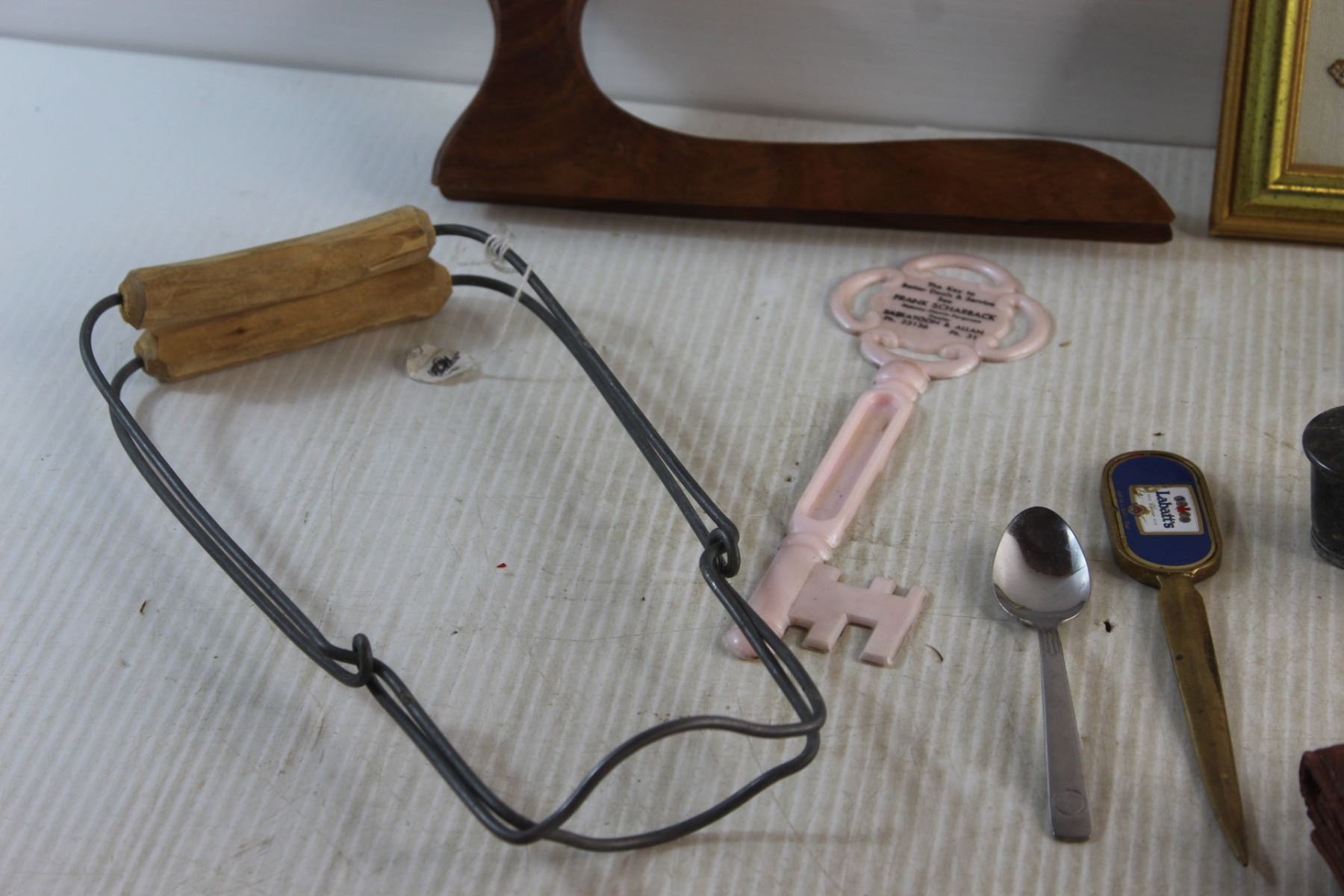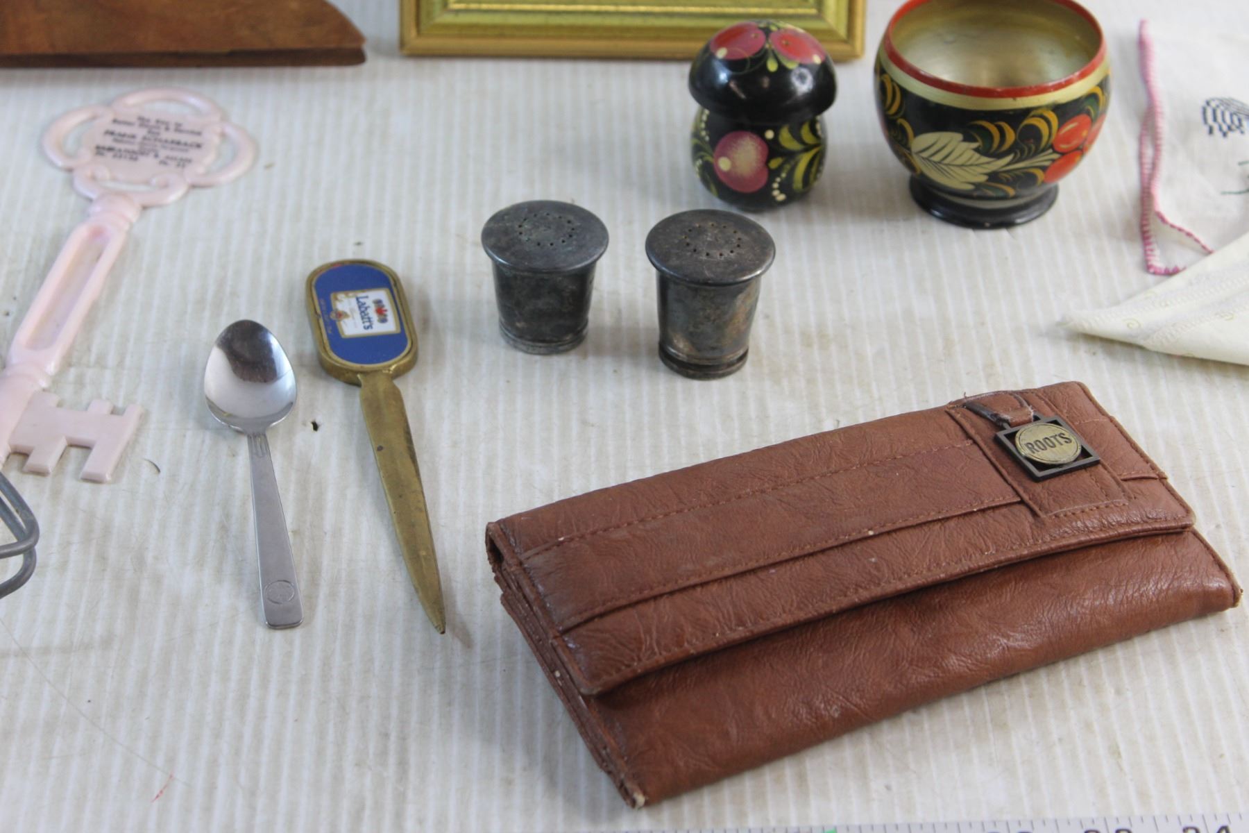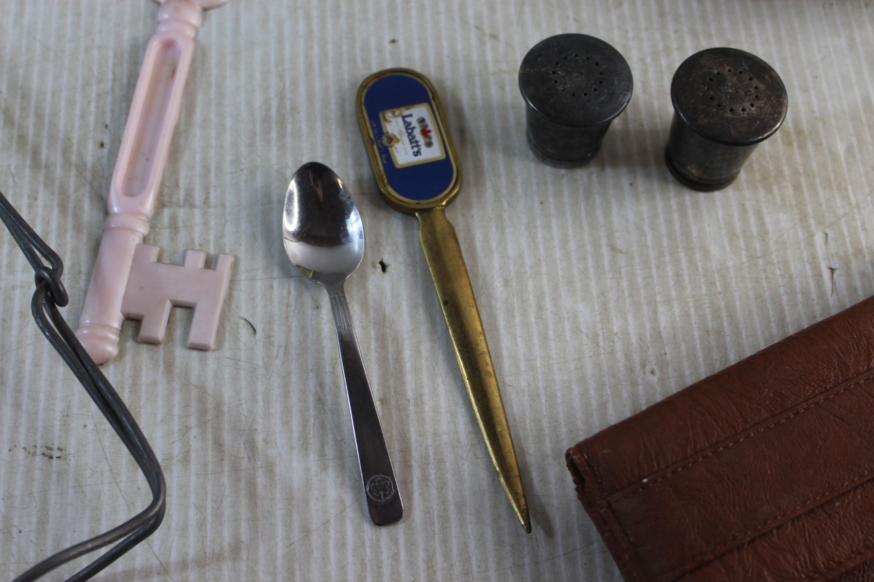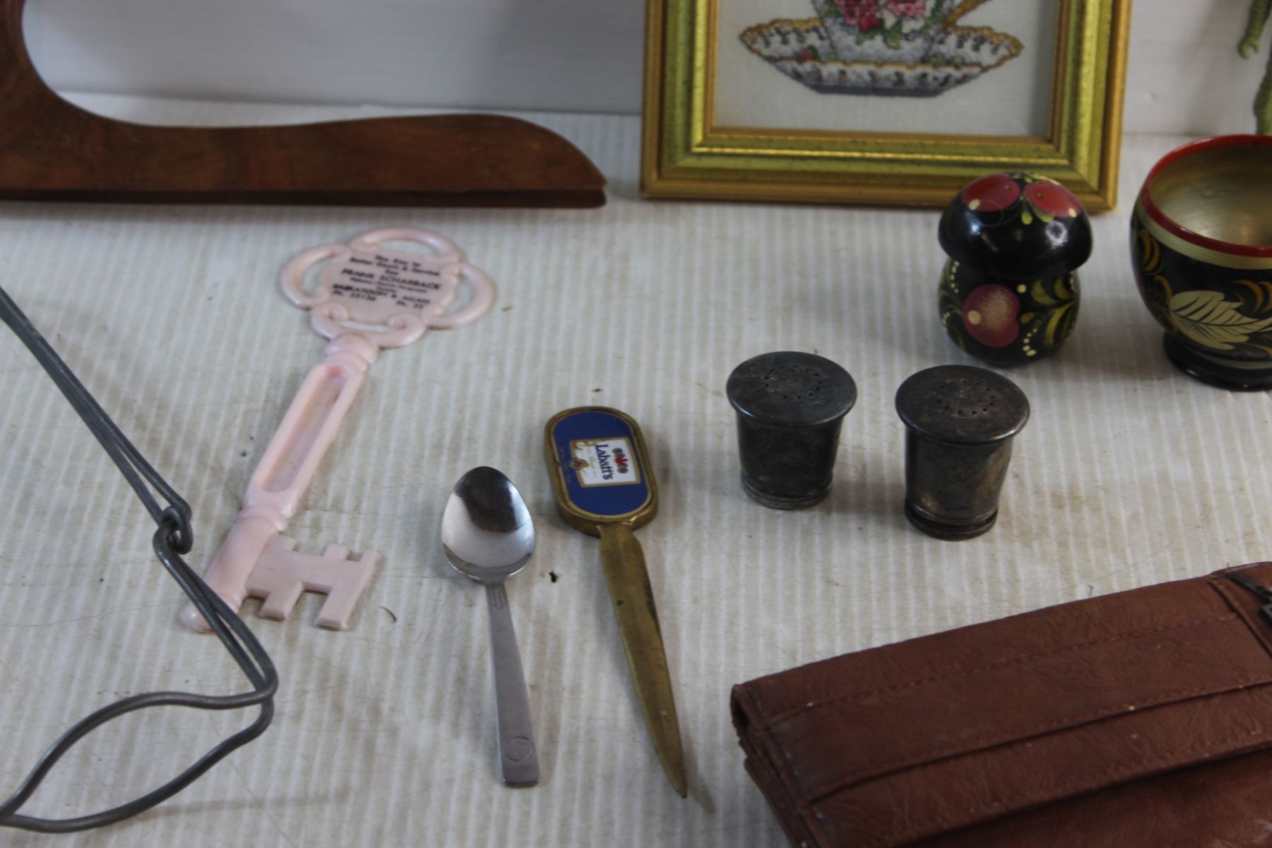 Jar Canner, Framed Needle Point Art, Labatt's Envelope Brass Opener, Salt & Pepper Shakers, Faux Leather Wallet and Assorted Items