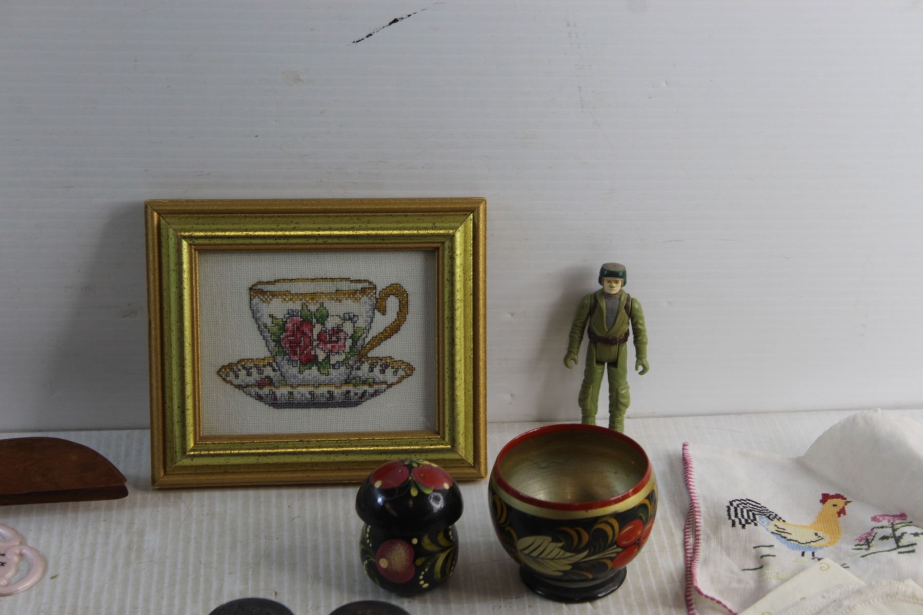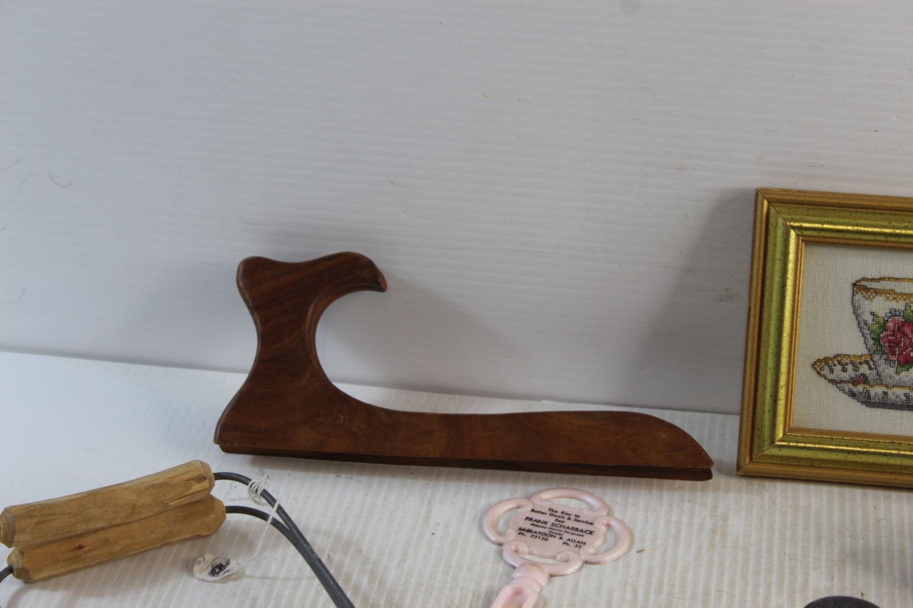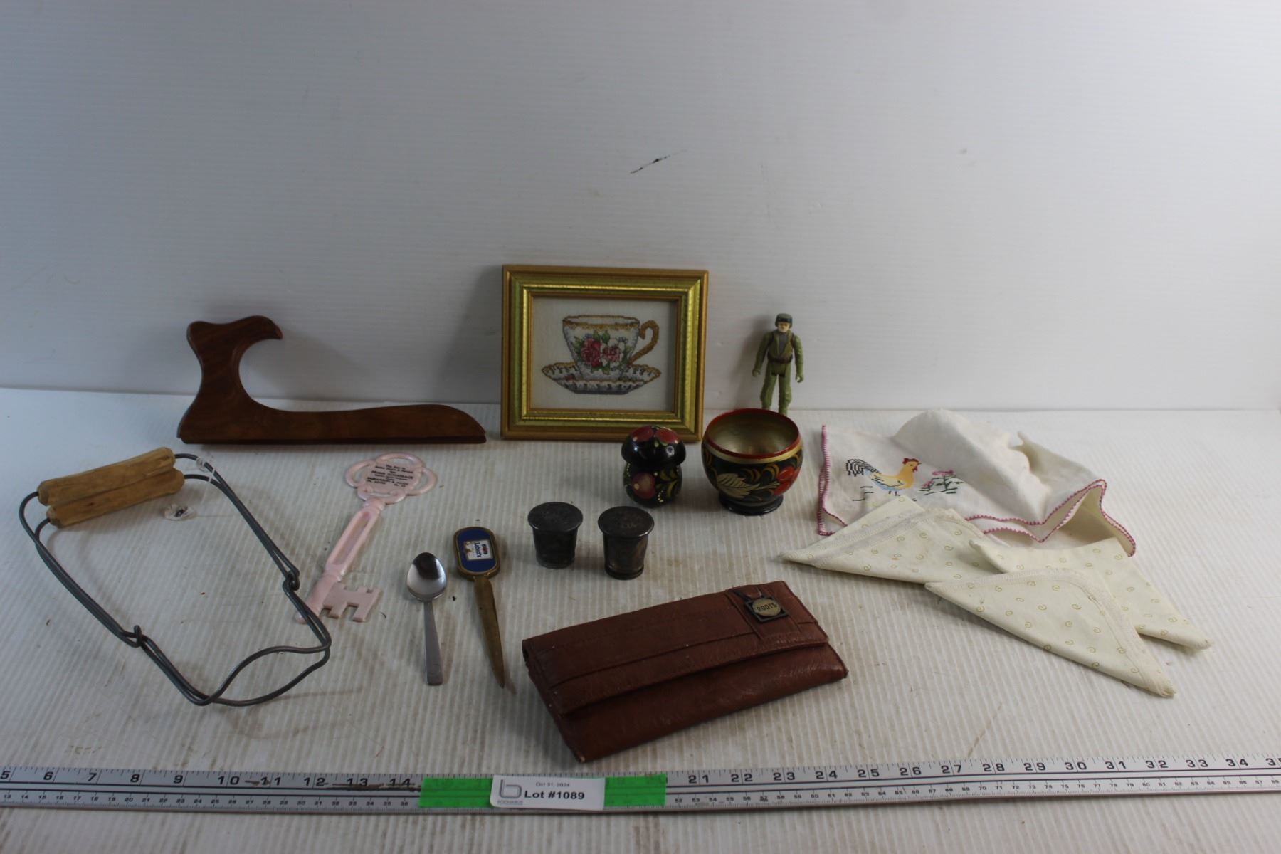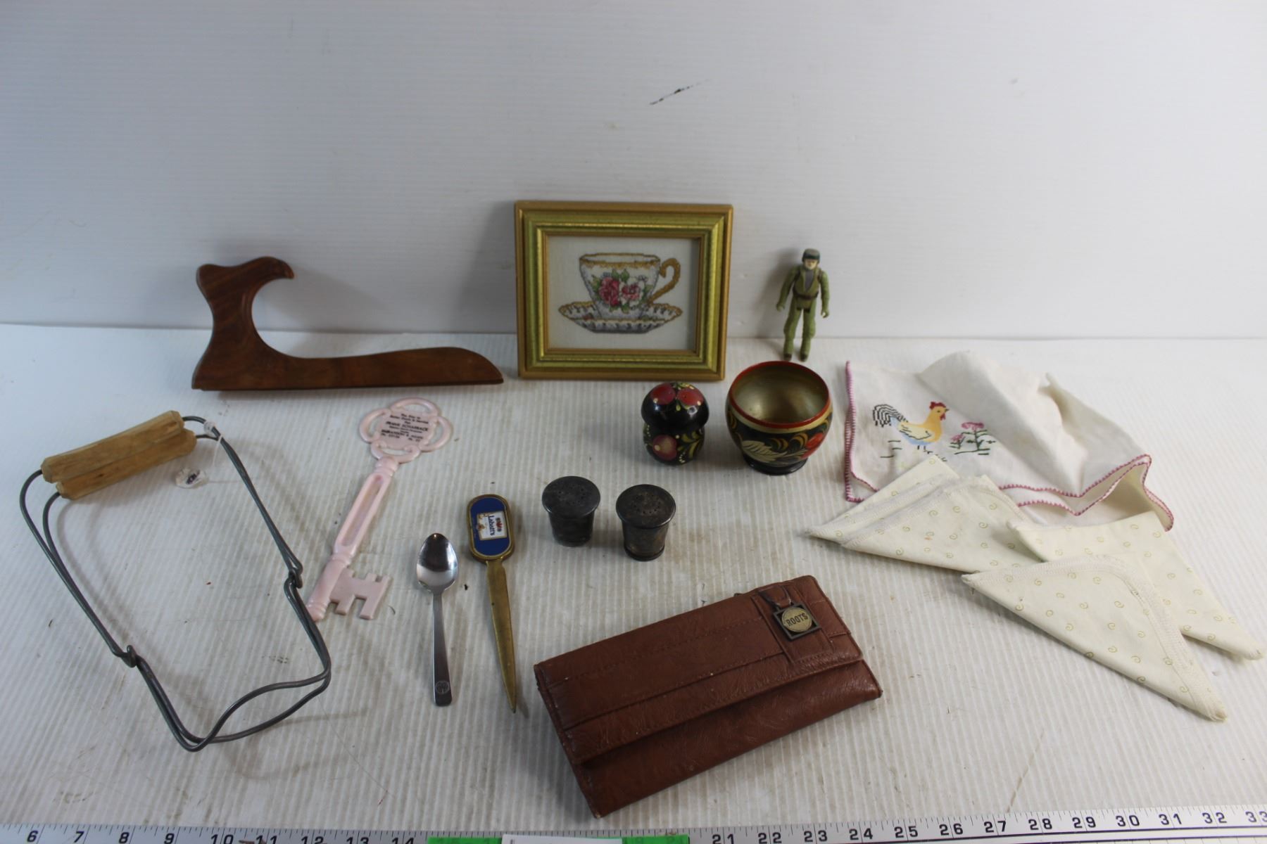 Jar Canner, Framed Needle Point Art, Labatt's Envelope Brass Opener, Salt & Pepper Shakers, Faux Leather Wallet and Assorted Items