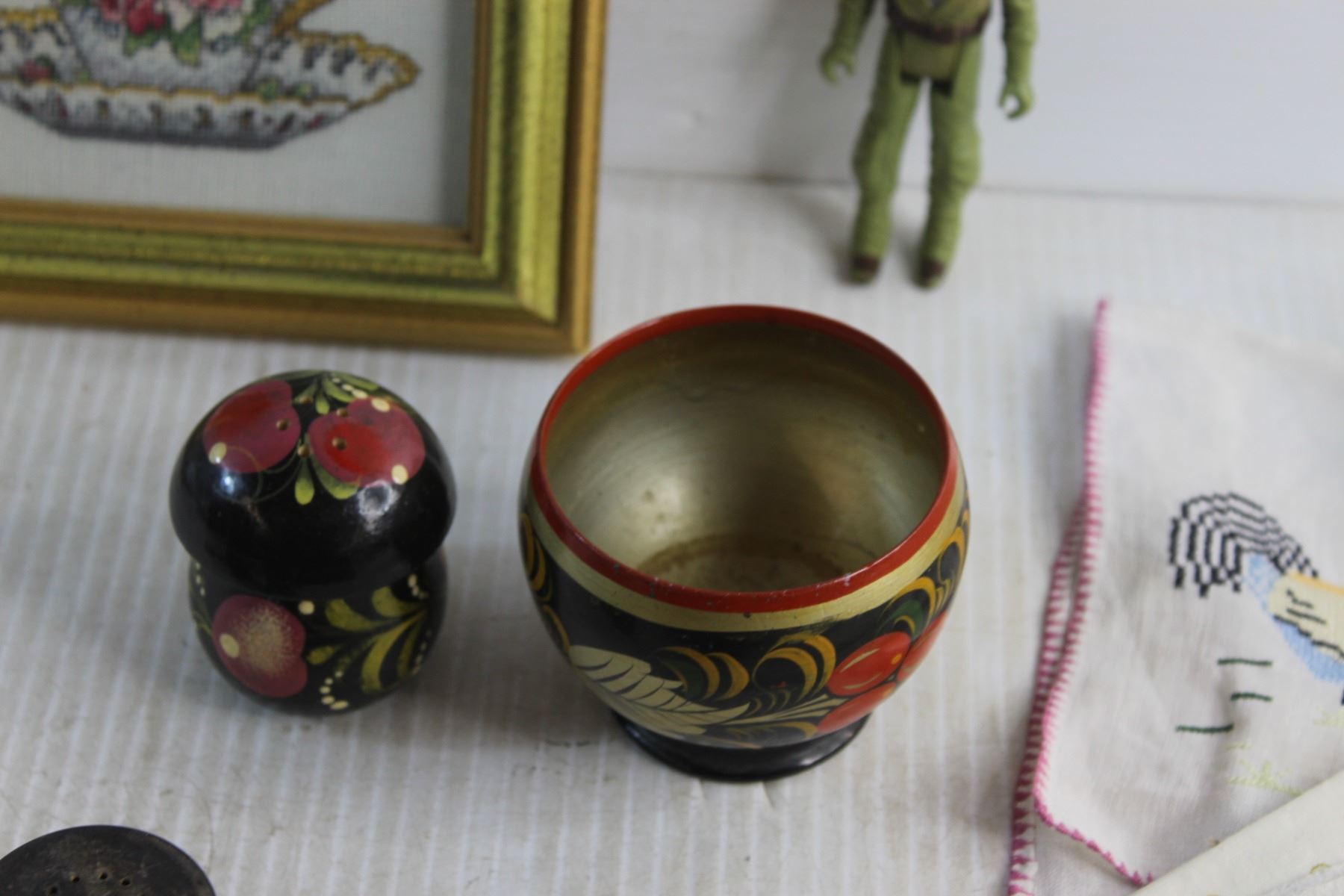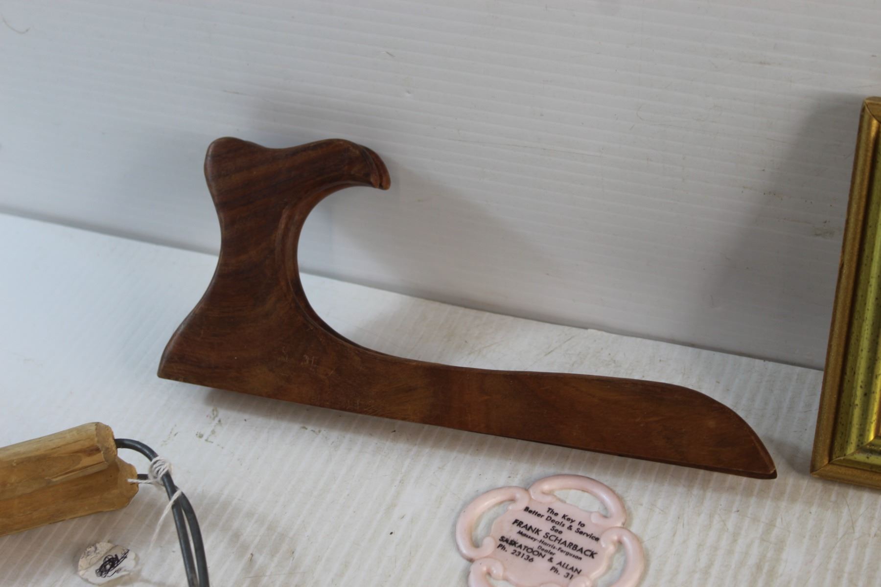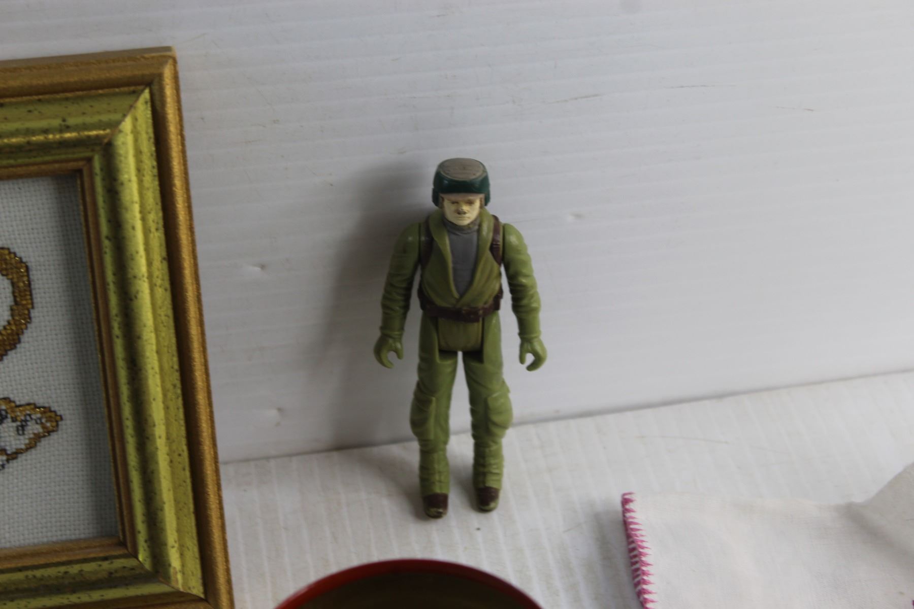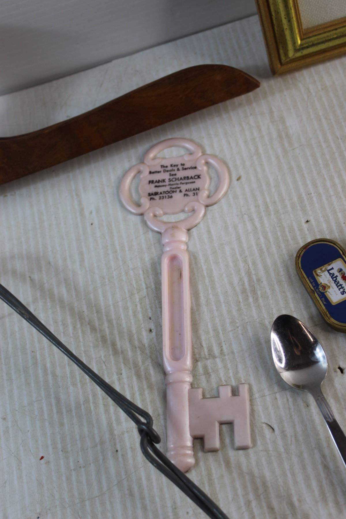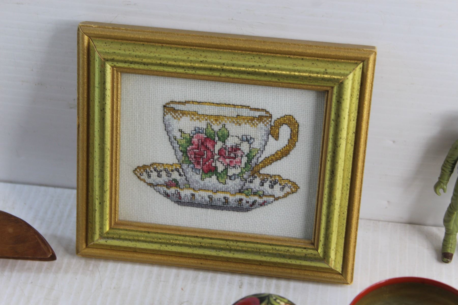 Jar Canner, Framed Needle Point Art, Labatt's Envelope Brass Opener, Salt & Pepper Shakers, Faux Leather Wallet and Assorted Items