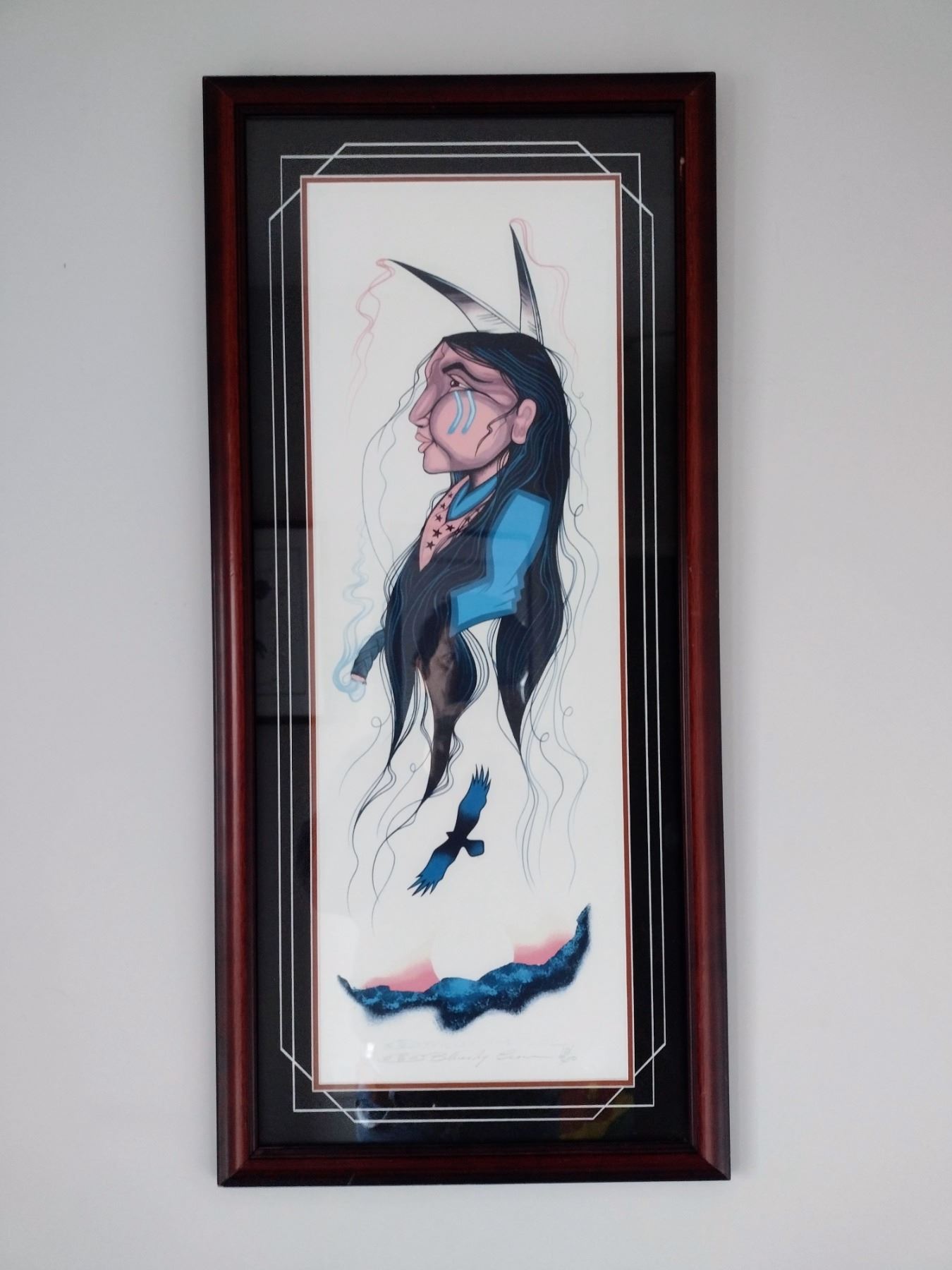 Jeffery Blue Sky Crow, Print, 10/300, untitled. 32 ½ in length, 15 inches wide. This Ojibwa artist has passed on to the spirit world and the worth of his art is rising.