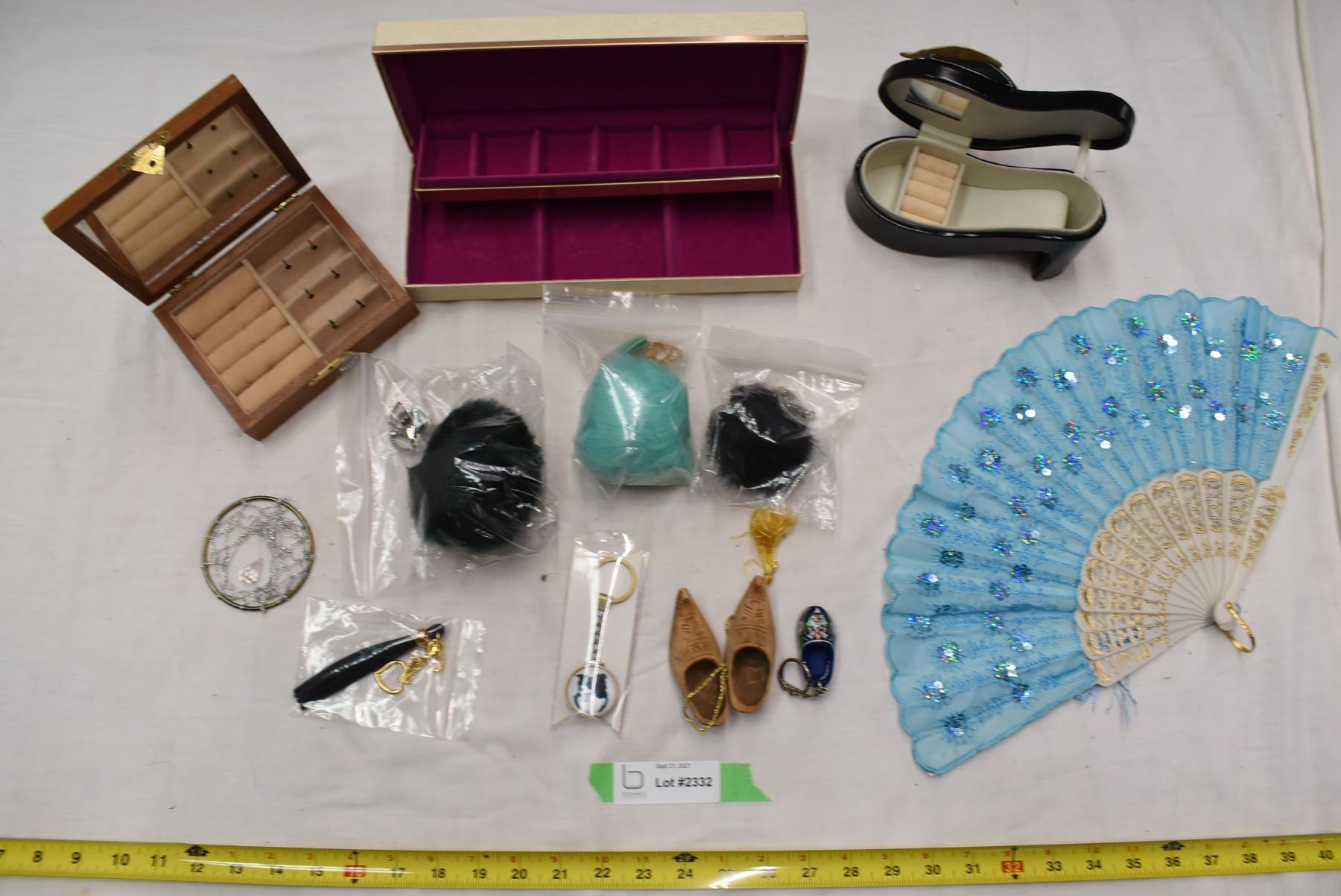 Jewellery boxes, wooden shoes, personal fan, misc. items