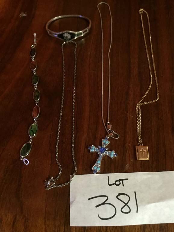 2 bracelets, chain, cross and chain, bible pendant and gold chain(Lords Prayer inside)