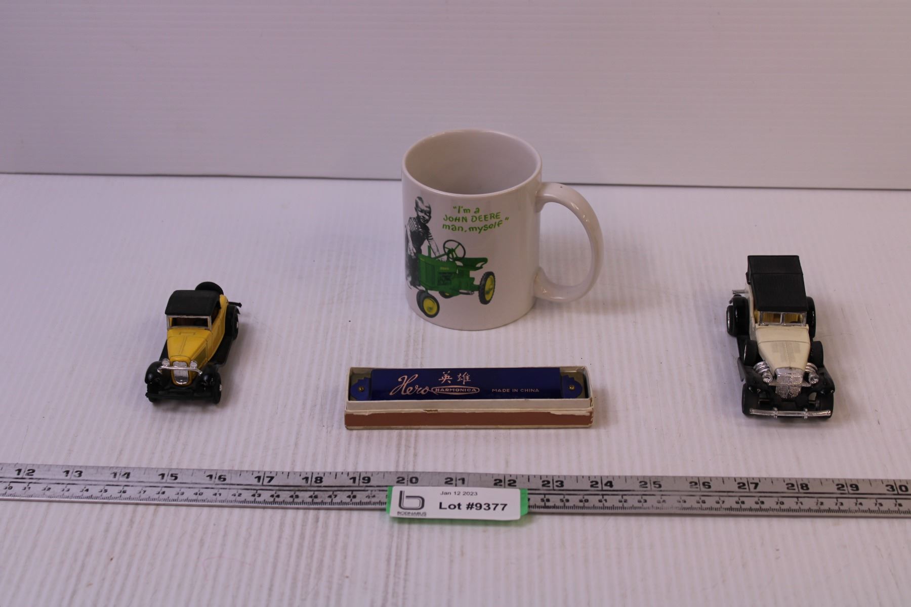 John Deere Coffee Mug, ERTL 1932 Ford Roadster Deluxe Die Cast, Wood Framed Hero Harmonica