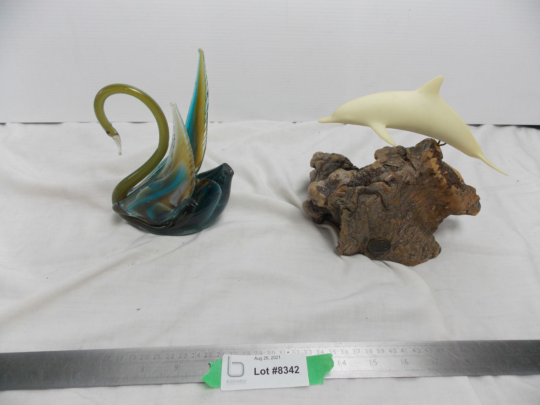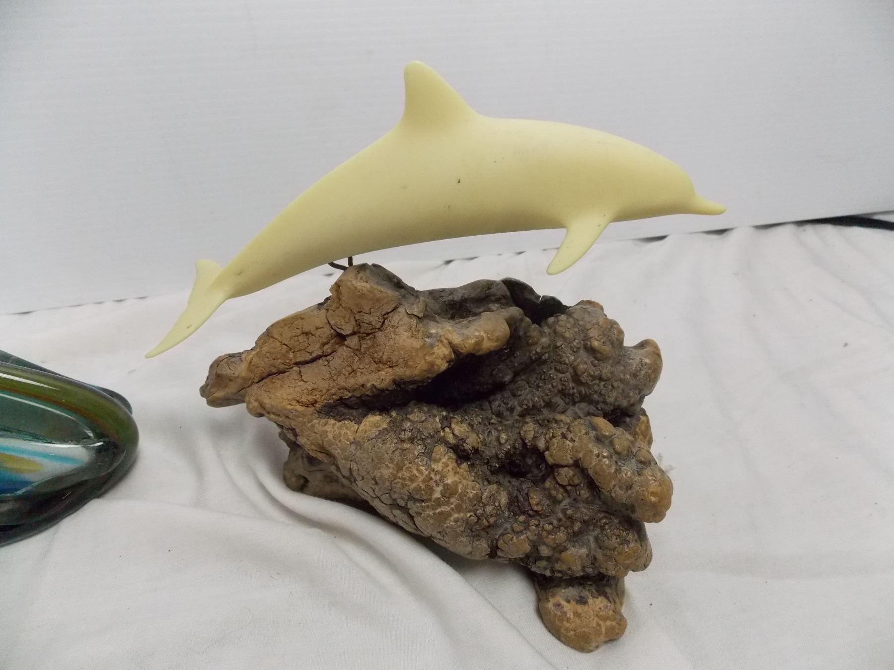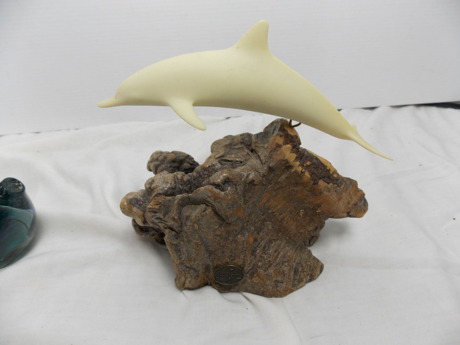 John Perry Dolphin carved statue, swan blown glass piece
