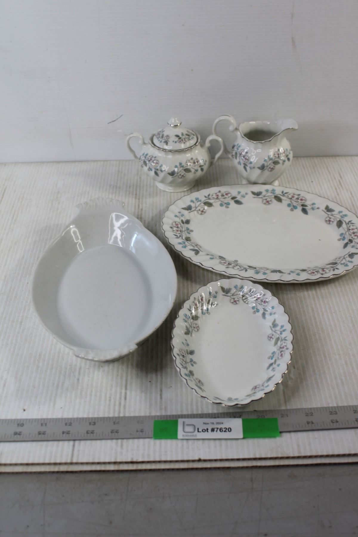 Johnson Bros Ironstone "Snowhite Regency" Cream and Sugar Set, (2) Serving Trays and a Misc. Tray
