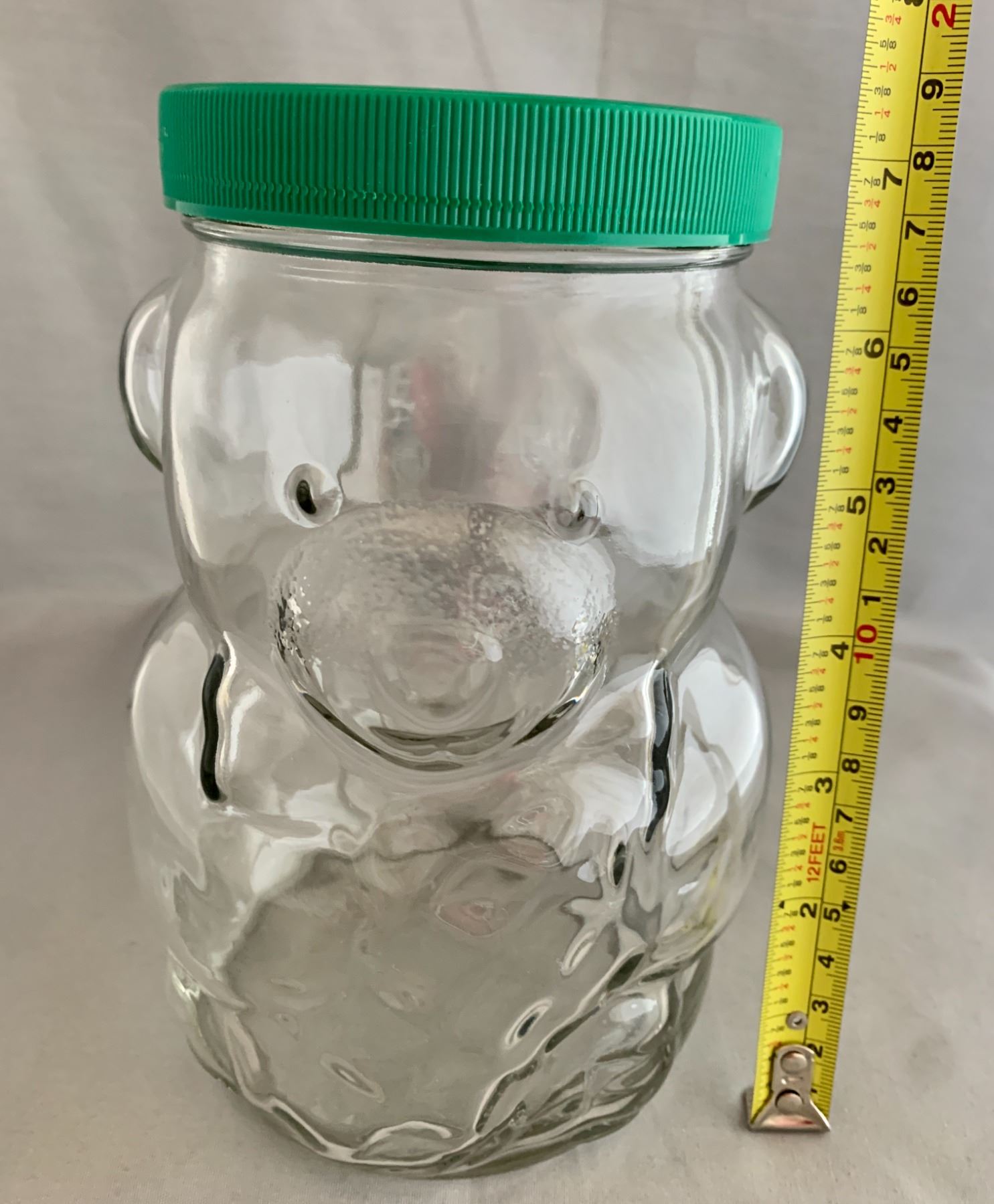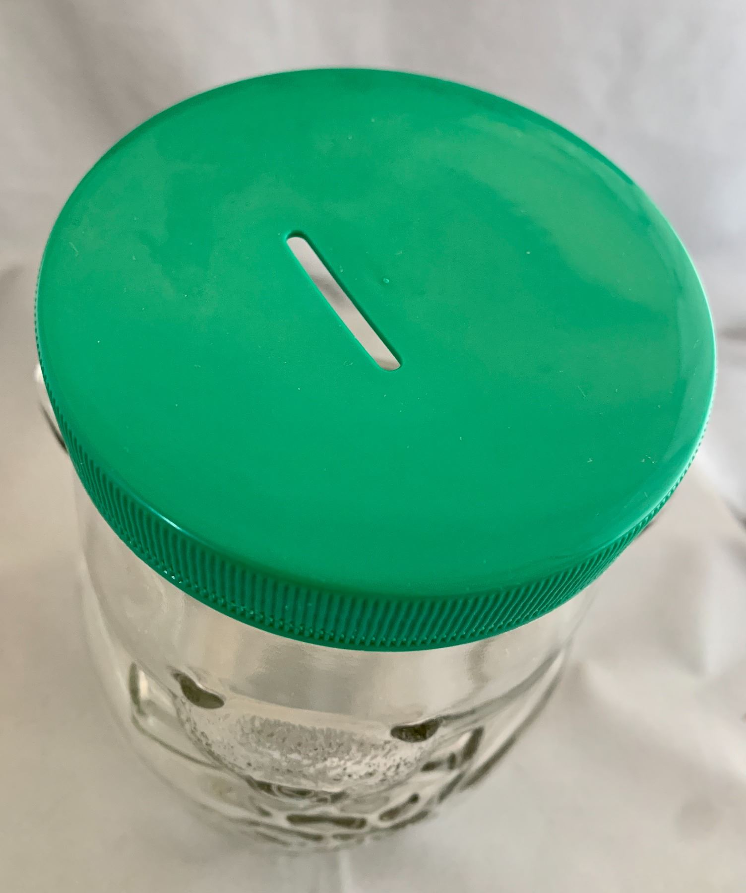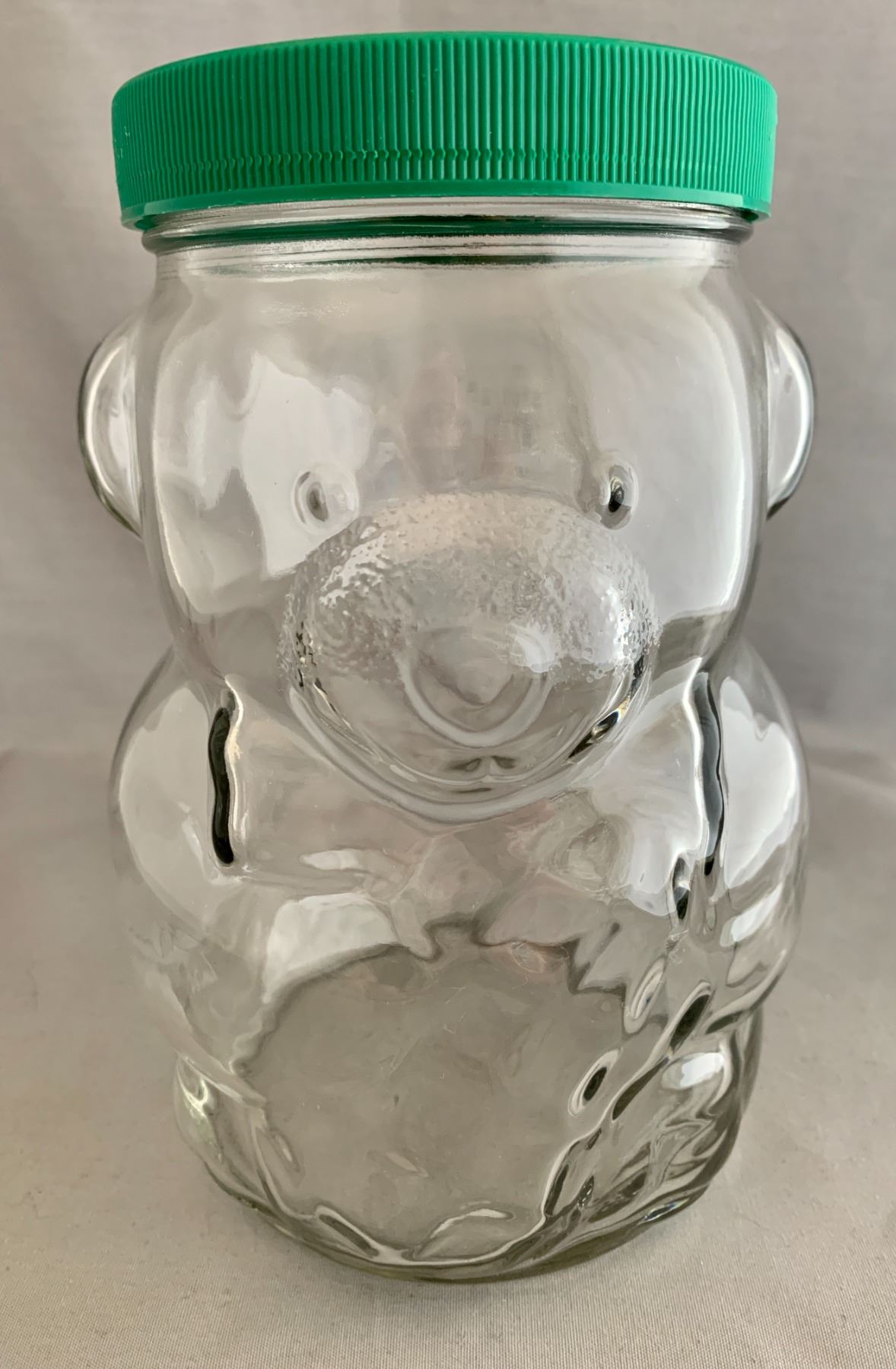 KRAFT Large Glass Bear Peanut Butter Jar with RARE Original Green Piggy Bank Slot Lid (1988)
