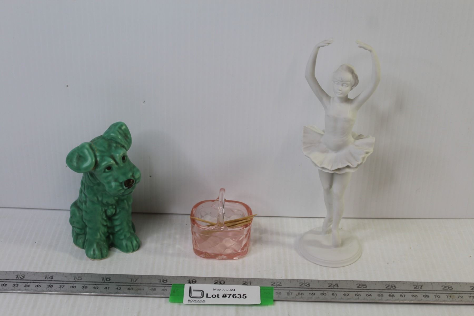 Kaiser W. German Figurine - Pink Glass Basket - Green Ceramic Dog (ear has damage)