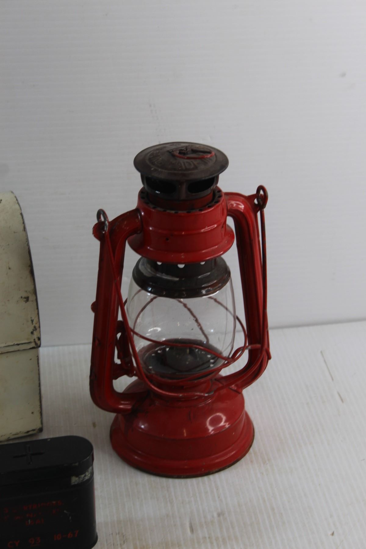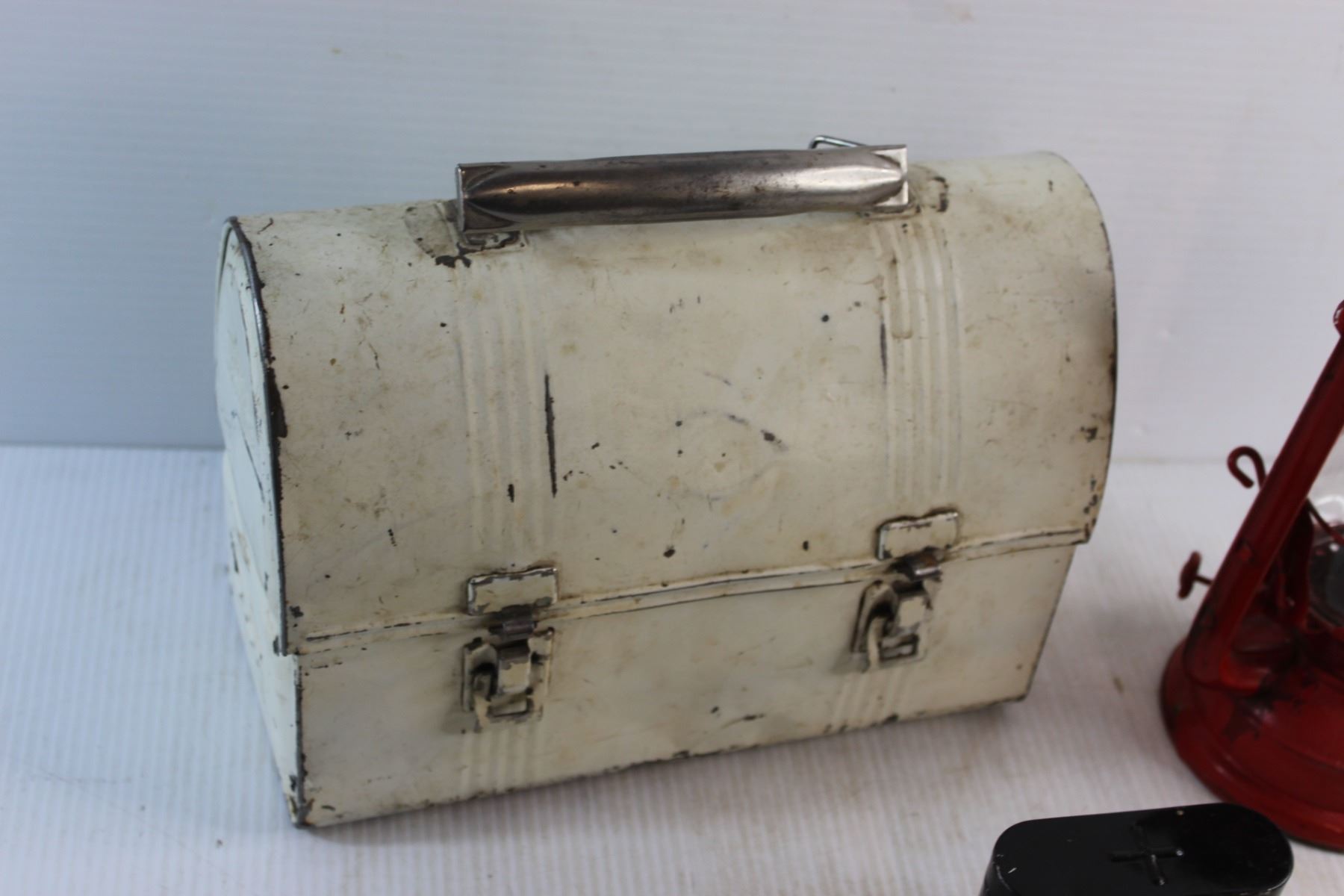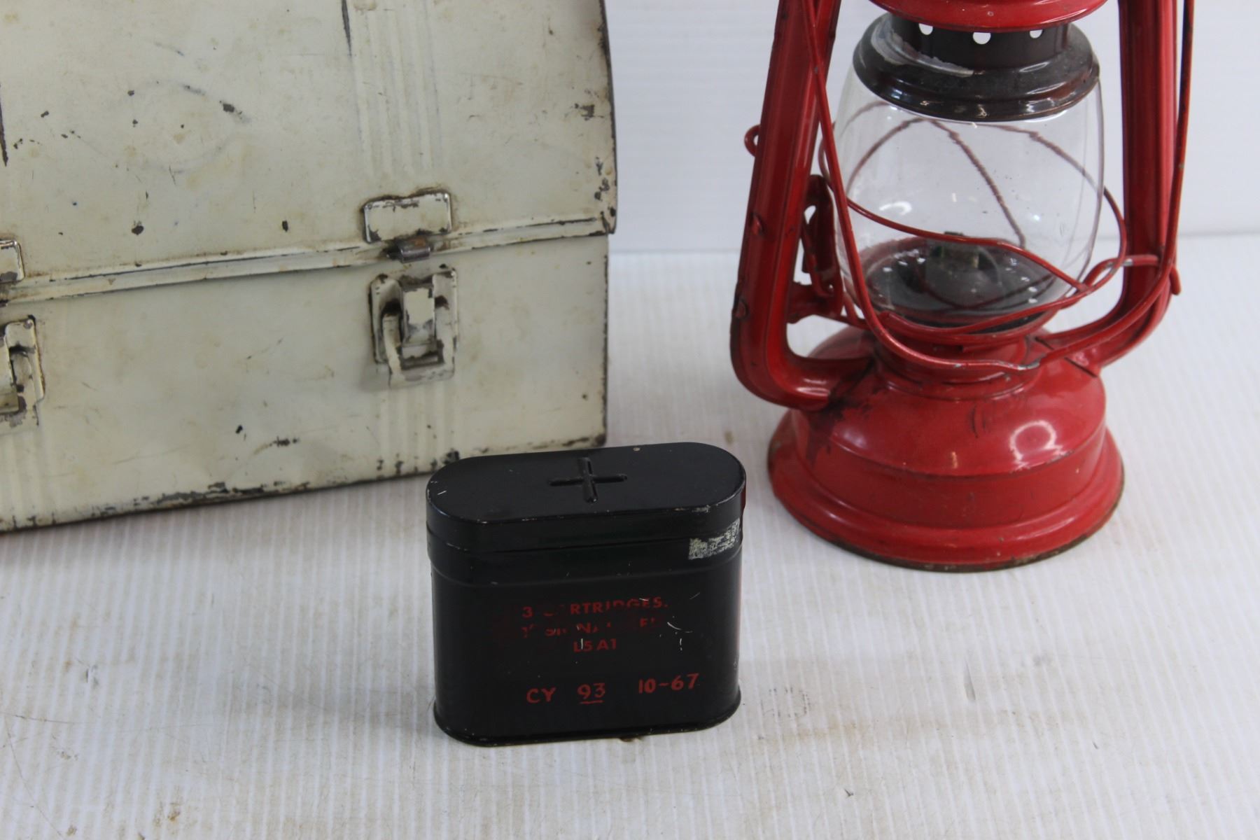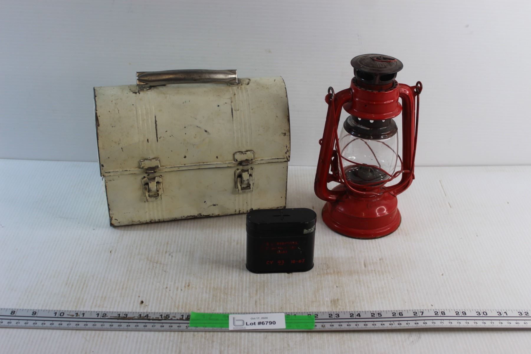 Kerosene Lantern, Thermos Lunch Box and Tin