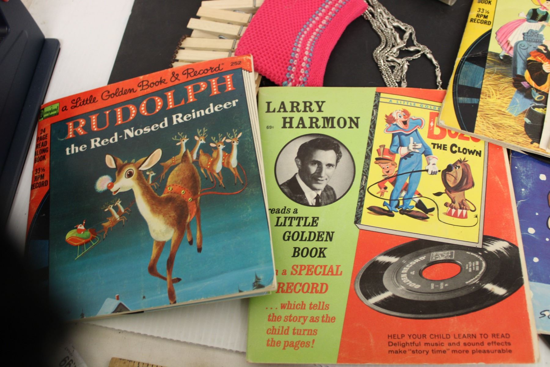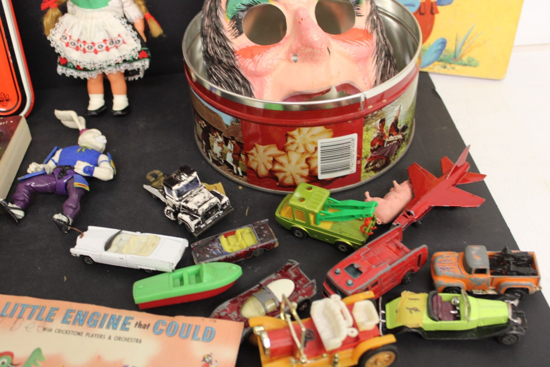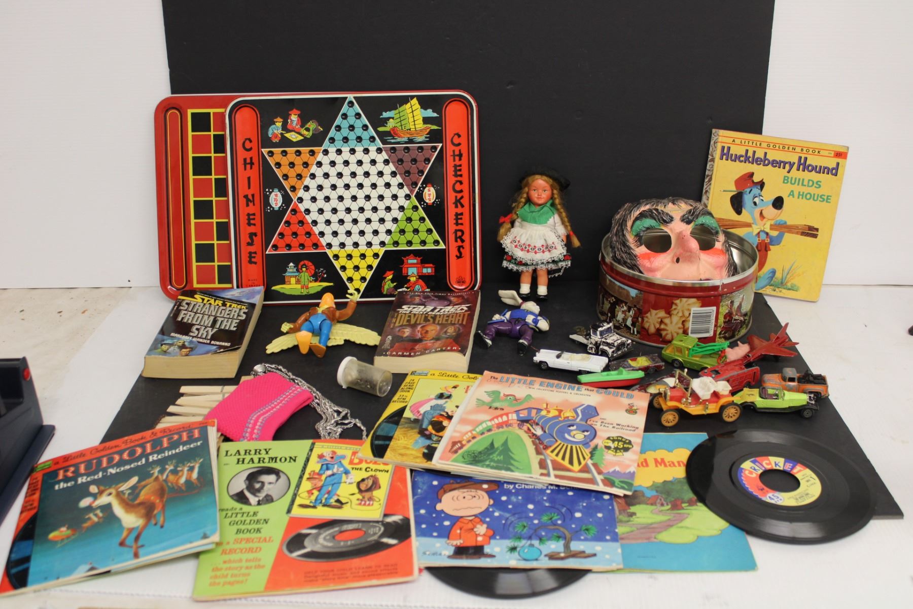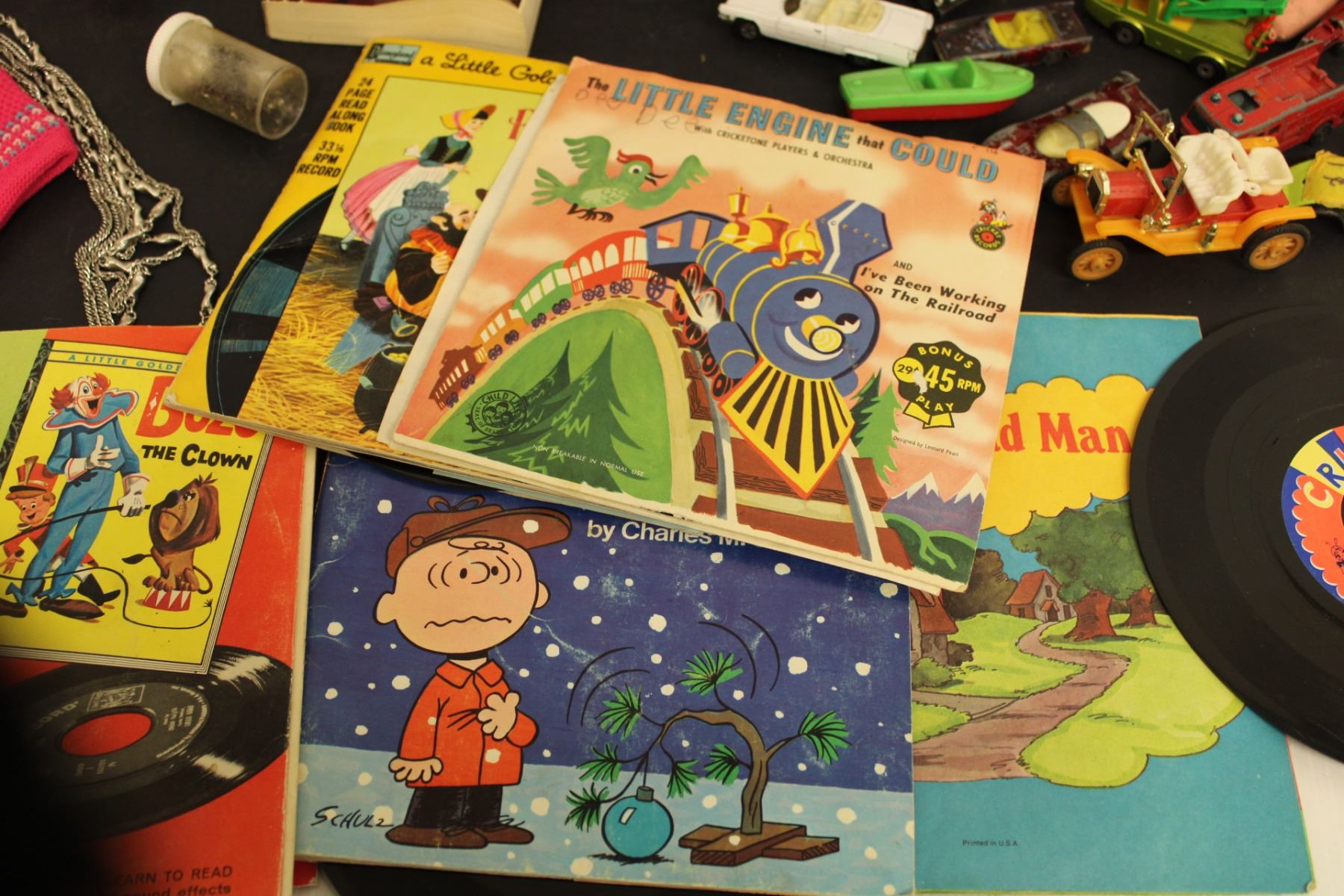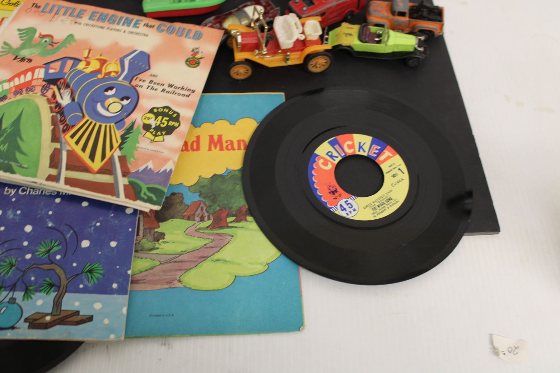 Kids Lot- (5) Books, Cars, (6) 45s, Misc.