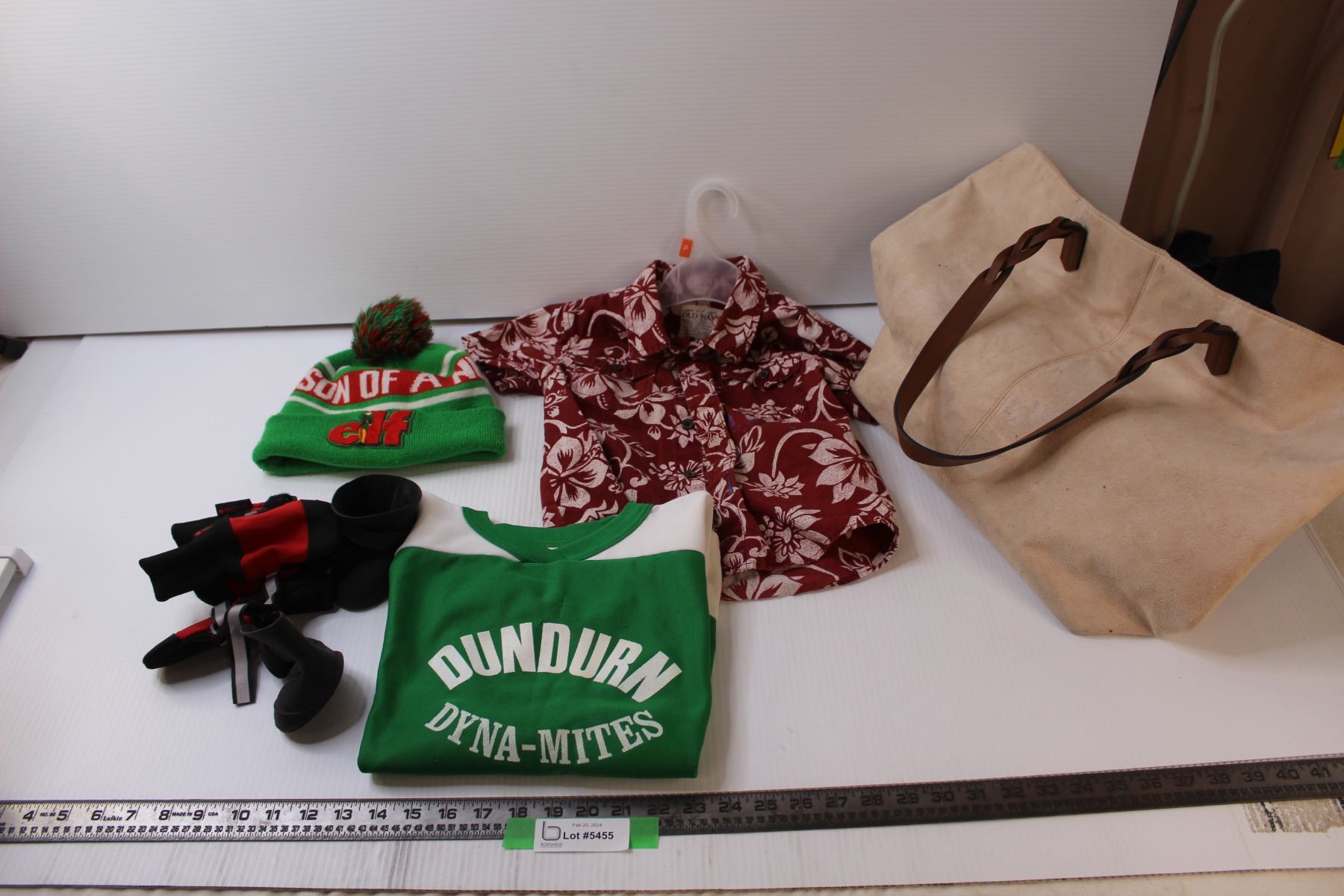 Kids Old Navy Hawaiian Shirt (few Paint Stains), Pet Booties and Mittens, Elf Toque, Dundurn Hockey Jersey & Handbag