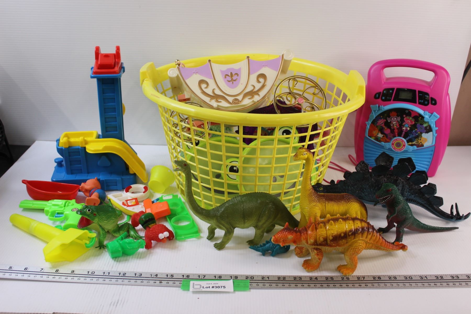 Kids Toy Lot: Dinosaurs, Bathtime Toys, Trolls Karaoke Machine, Princess Carriage, Misc. in Basket