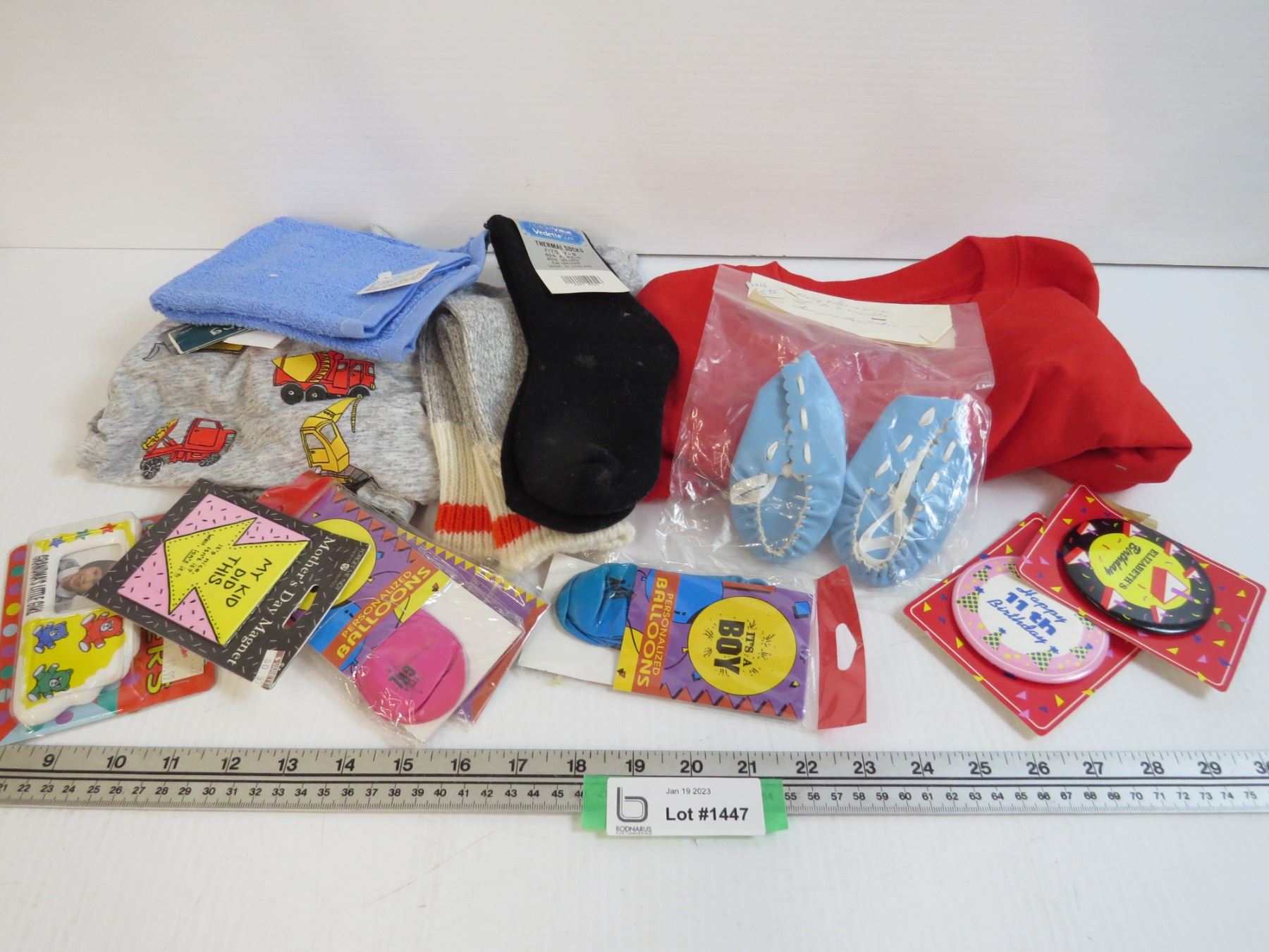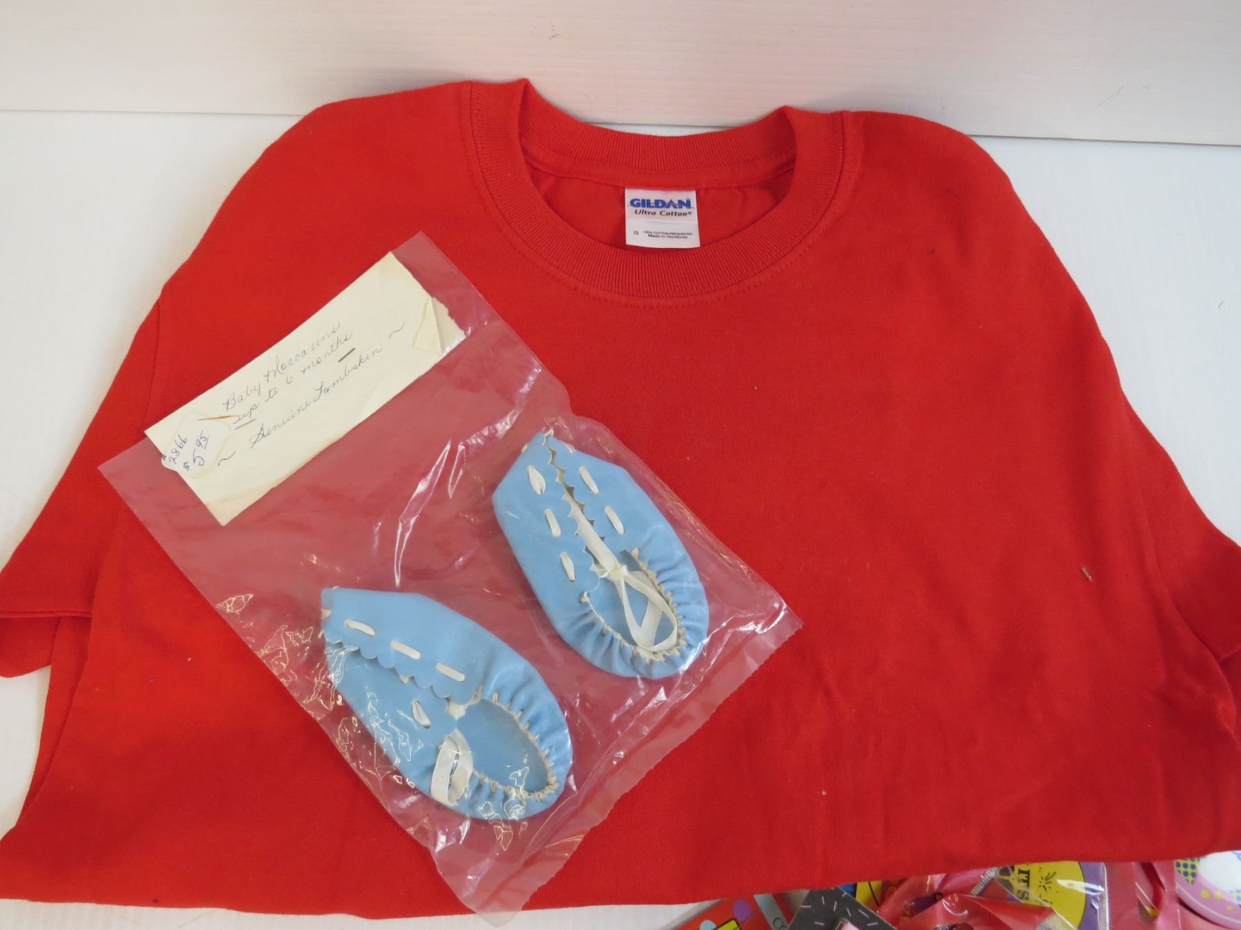 Kids (size 3) Sweat-Shirt & Sweat Pants - Red T-shirt (size Sm) - Baby Lamb Skin Moccasins - (2) Pair of Kids Socks - Misc Items