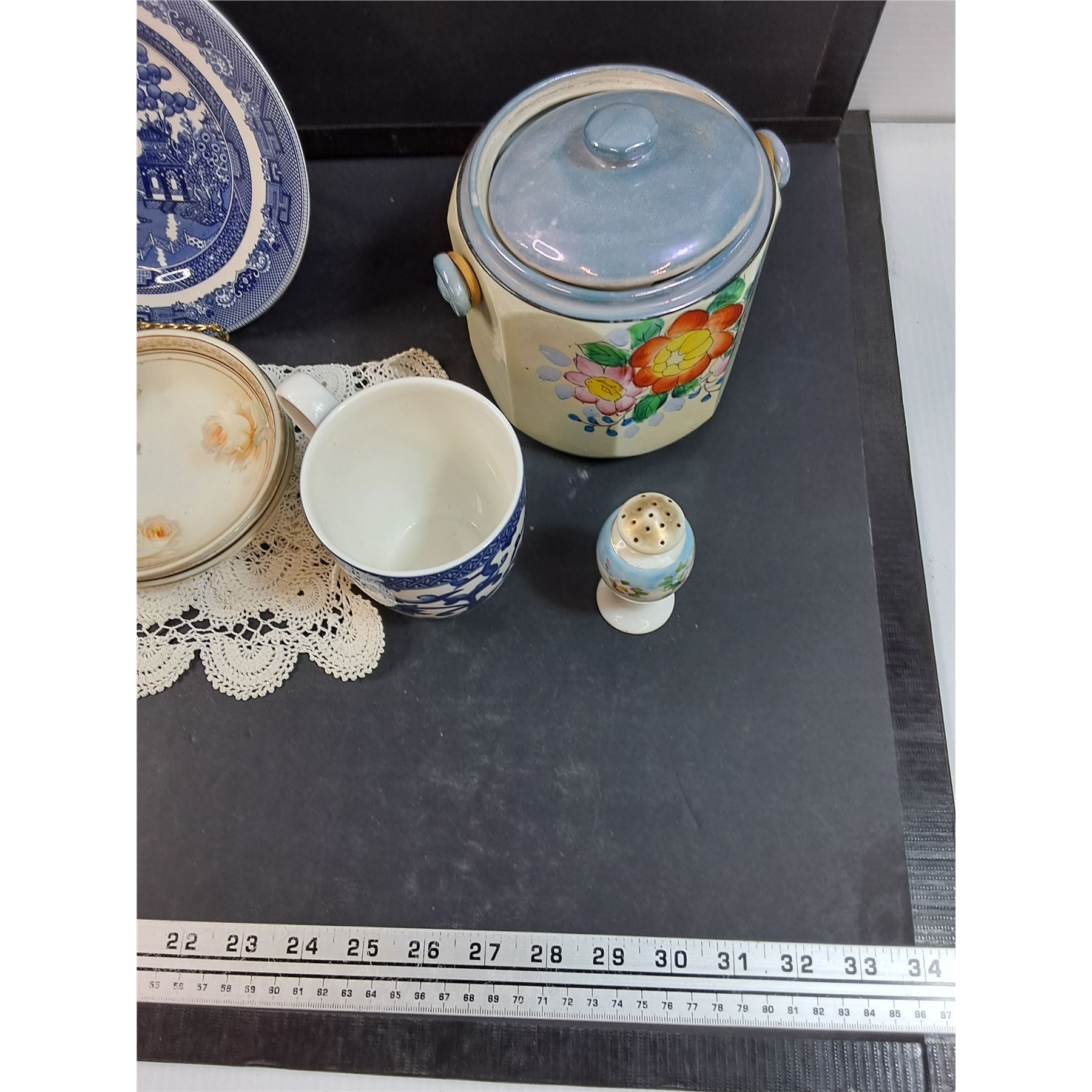 Kitchen Canister,Plate Holder w/Plate, (3) Dollies, Salt Shaker, (3) Dessert Plates,(3) Dessert Bowl