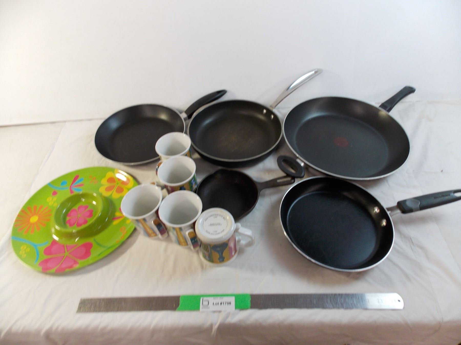 Kitchen Pans, Coffee mugs, plastic serving tray