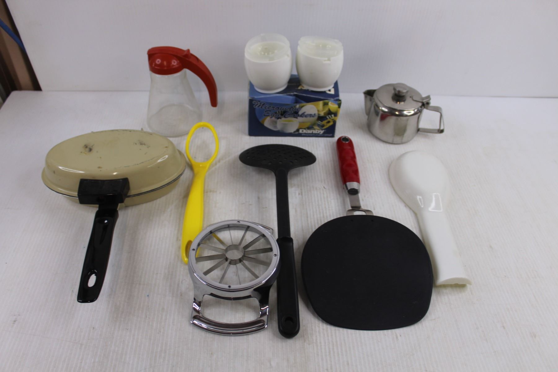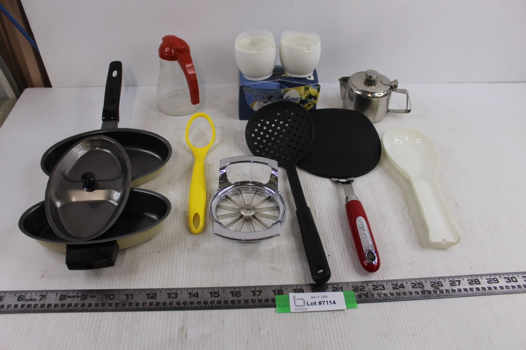 Kitchen Utensils Lot (Teapot, Apple Slicer, Egg Cookers, Vintage Fry Pan, Misc.)