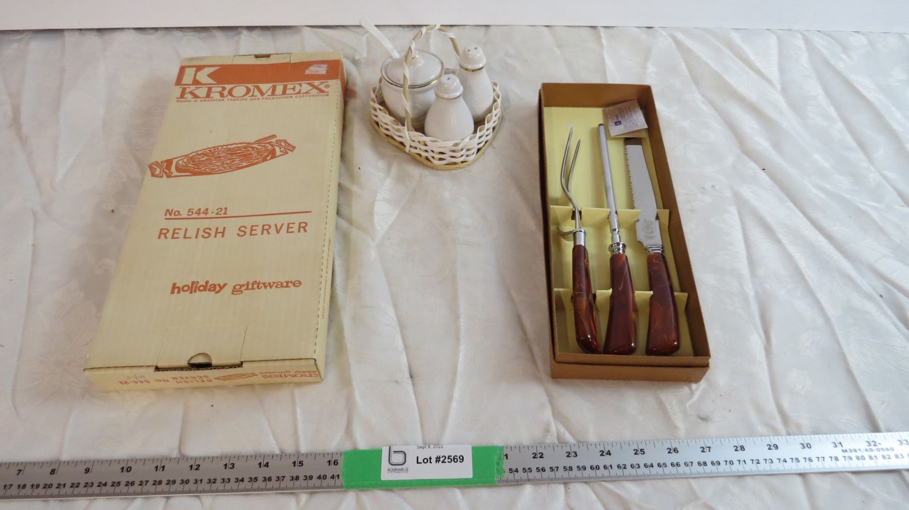Kromex Relish Server + Glo Hill Carving Set + White salt and pepper basket