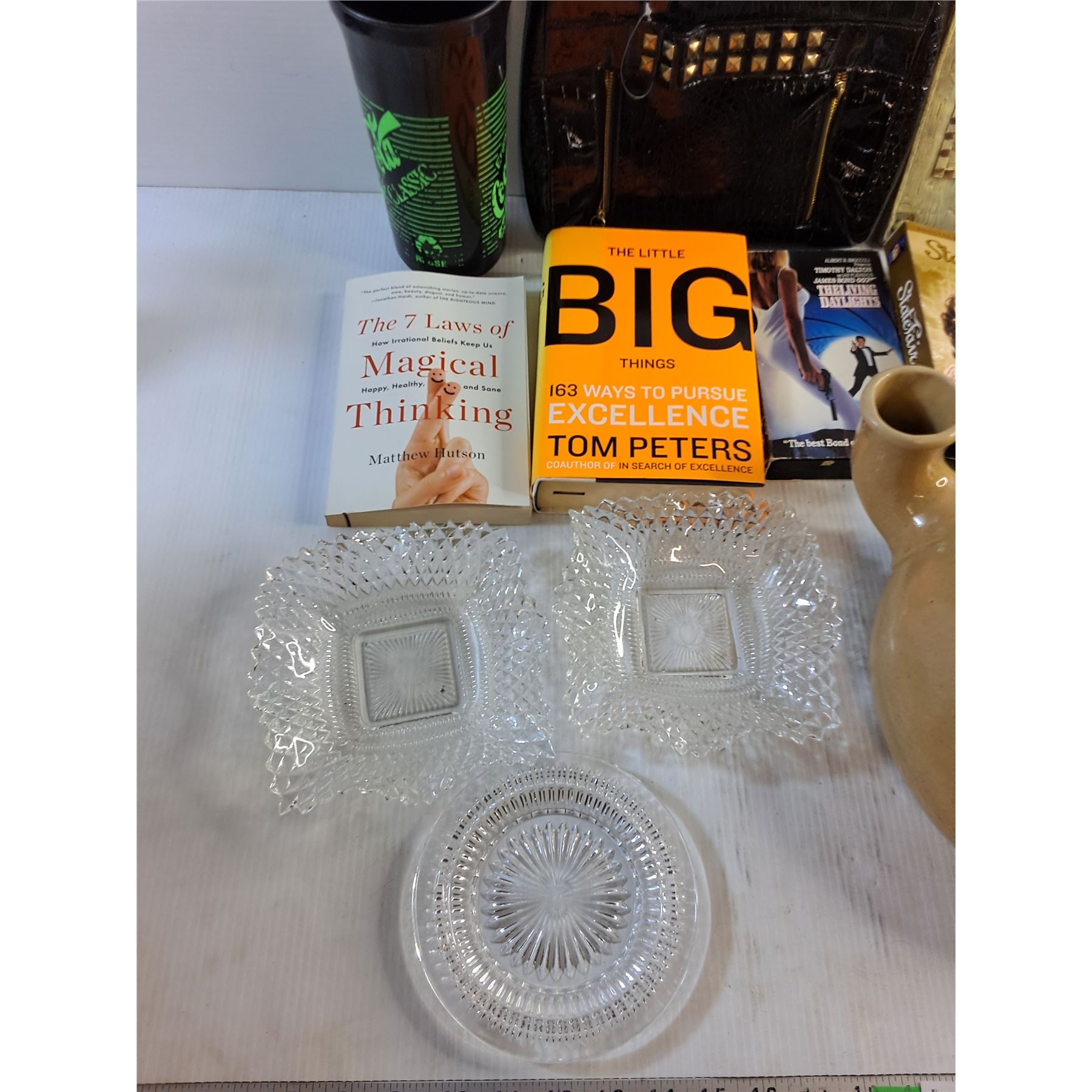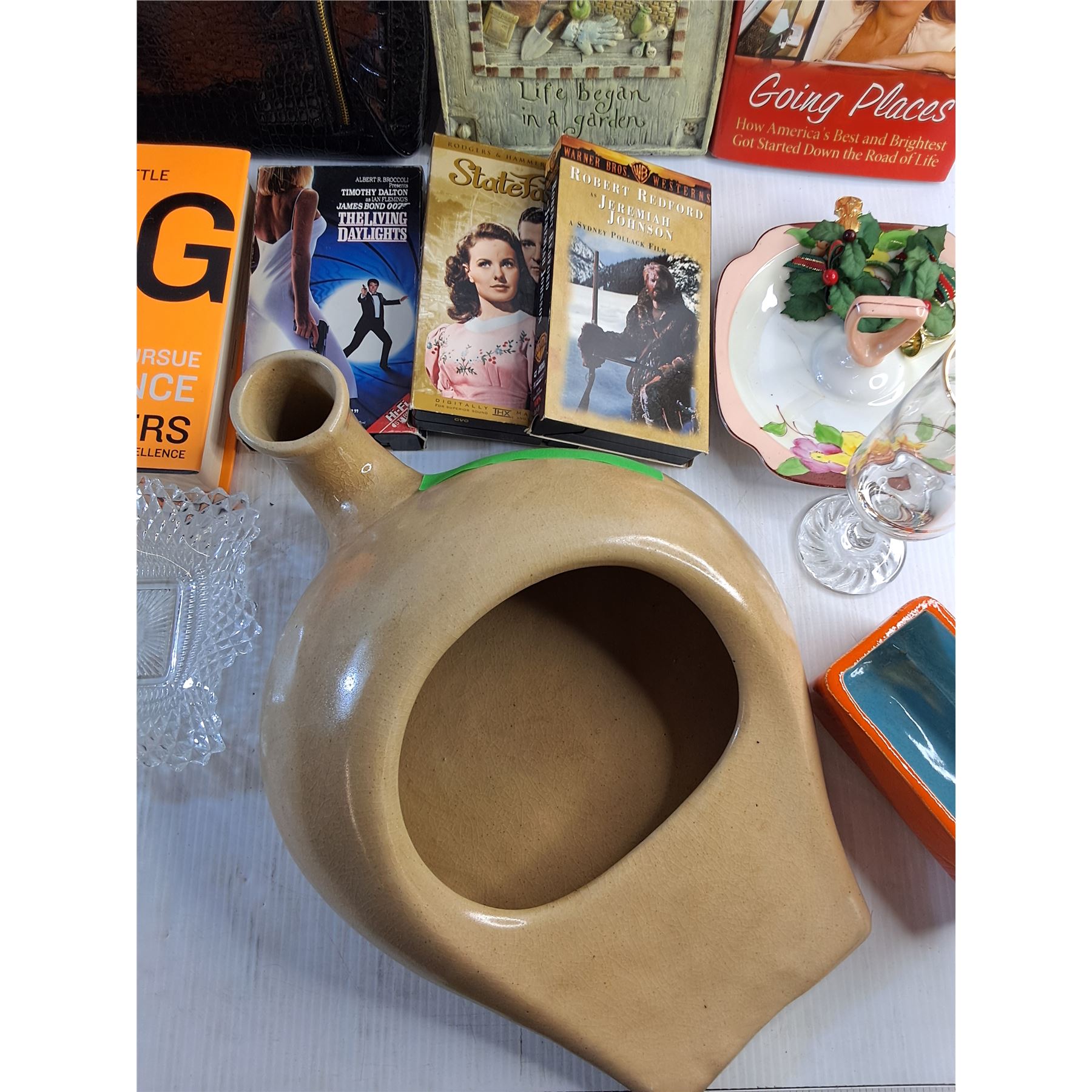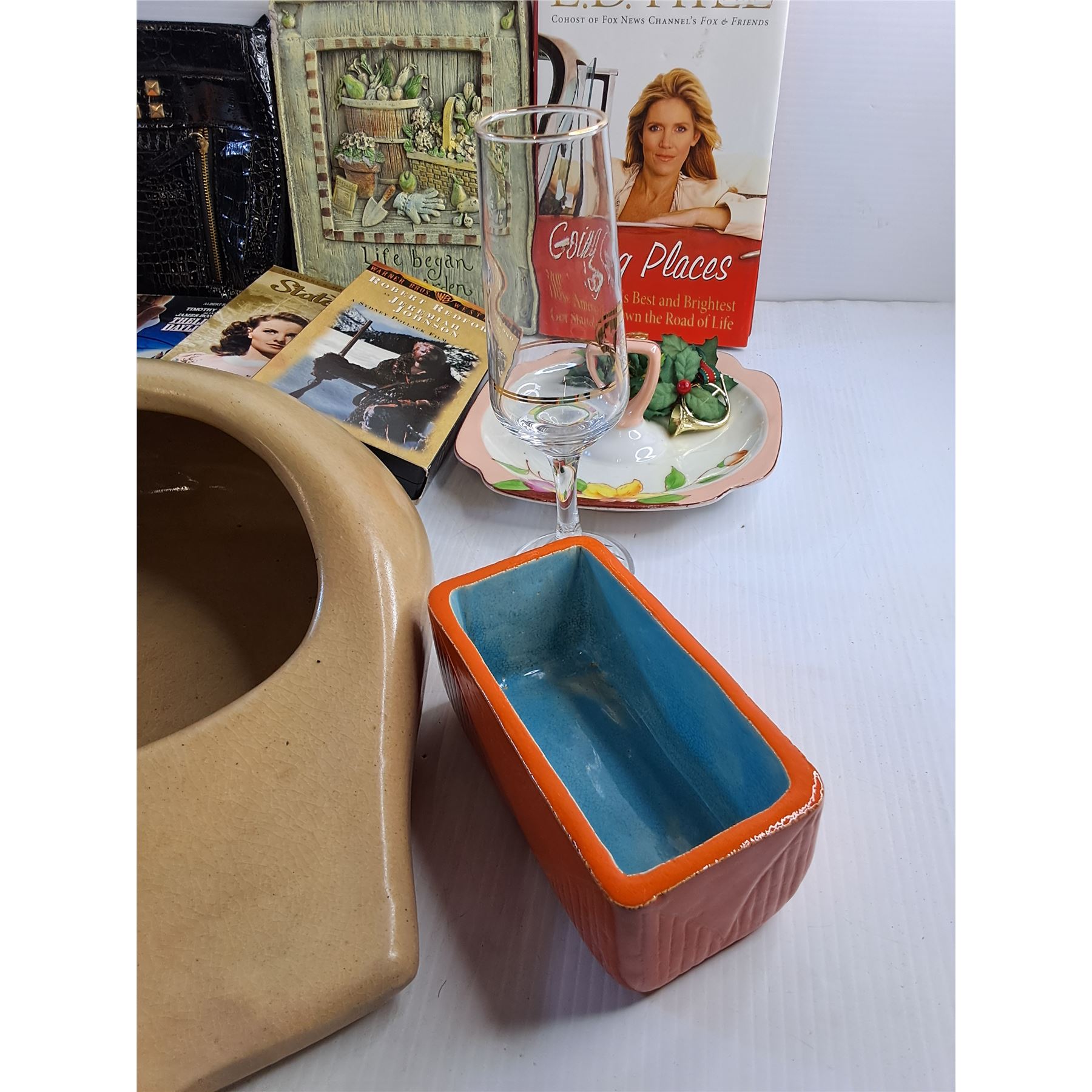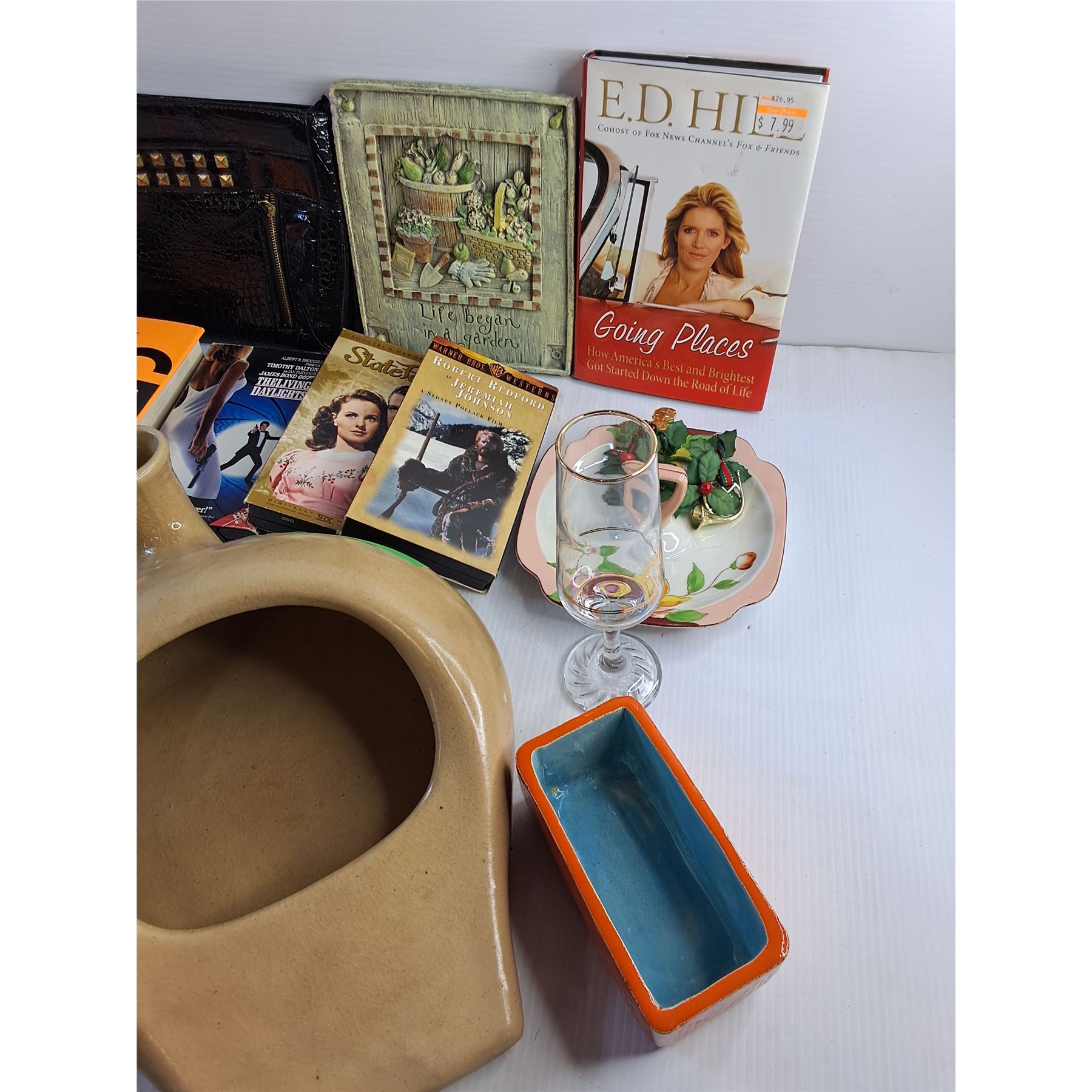 Ladies Bag, Various Books, Bed Pan, Glass Goblet, Glass Dishes, Wall Decor and Misc