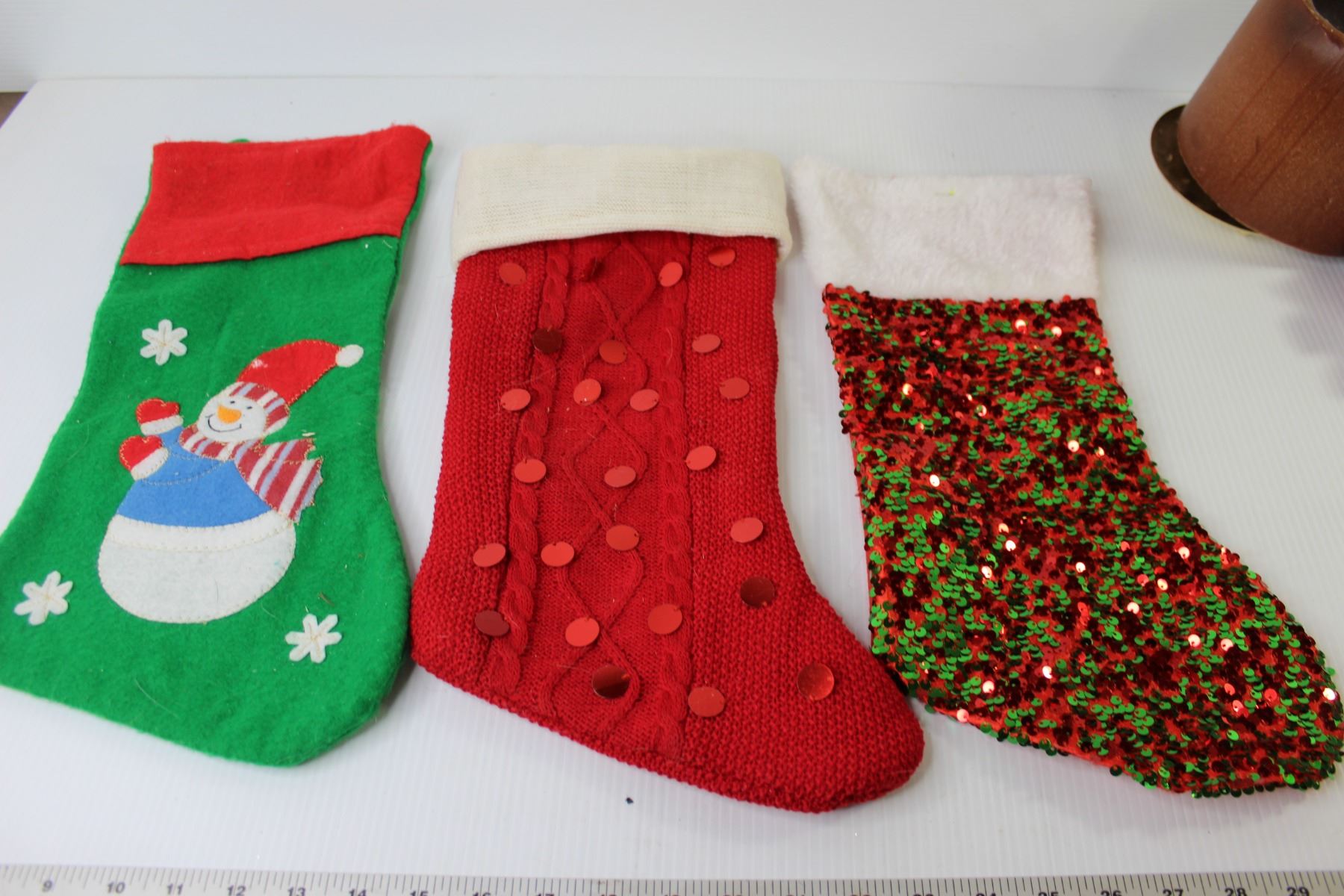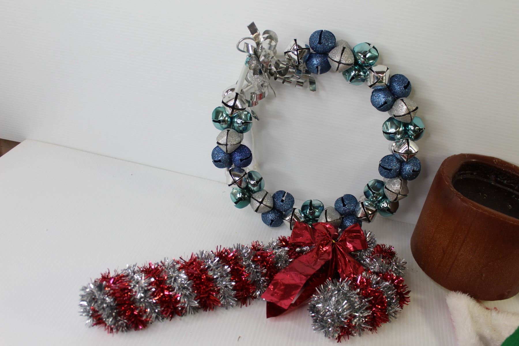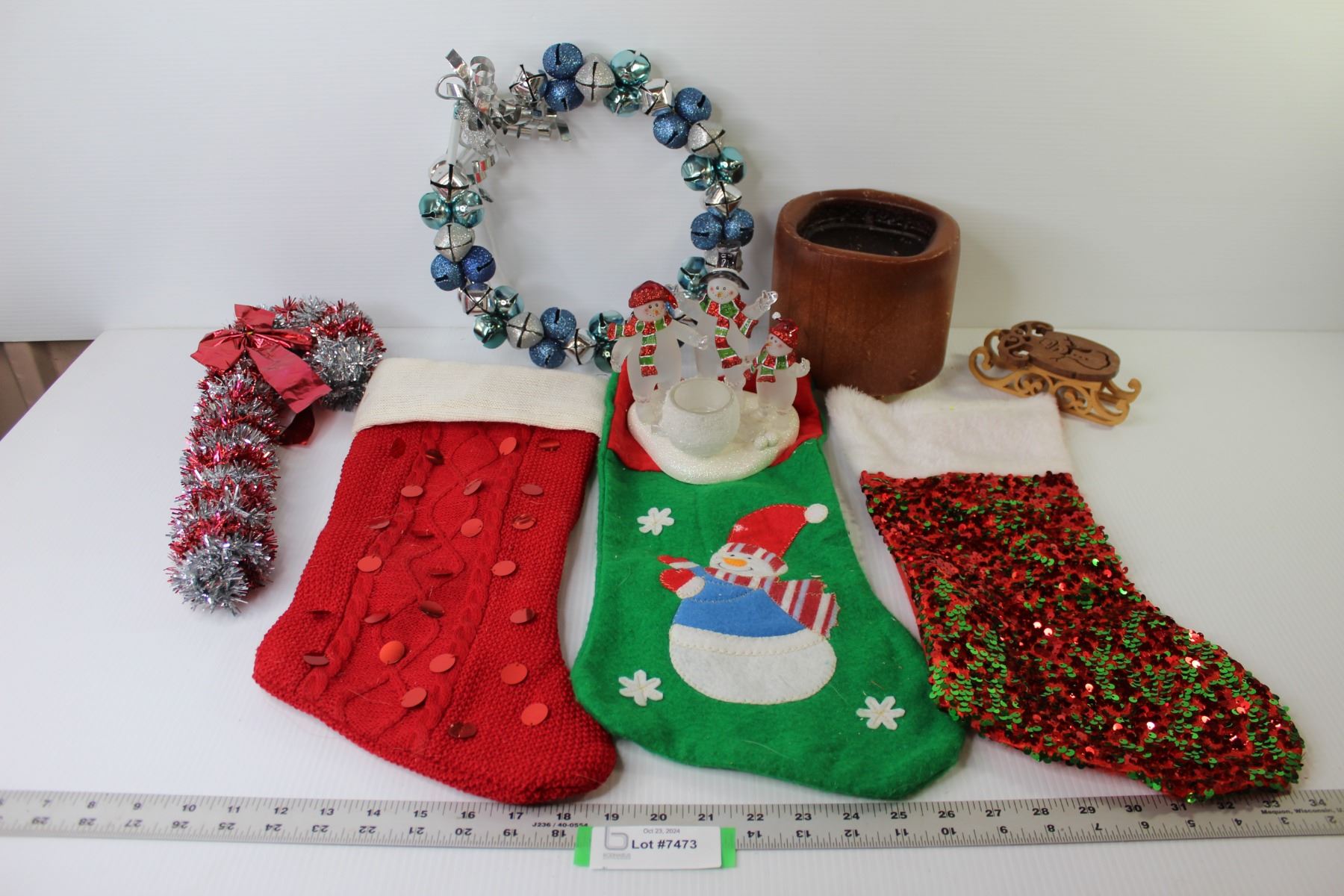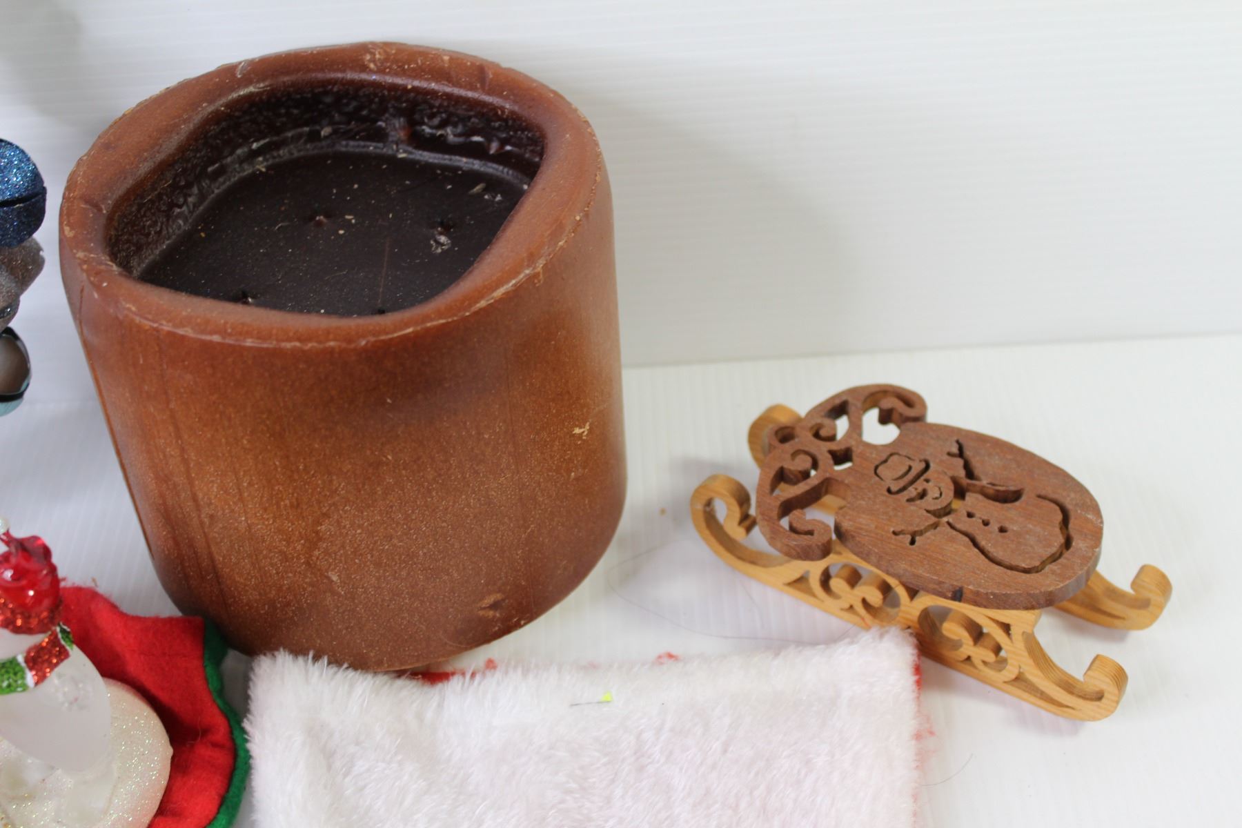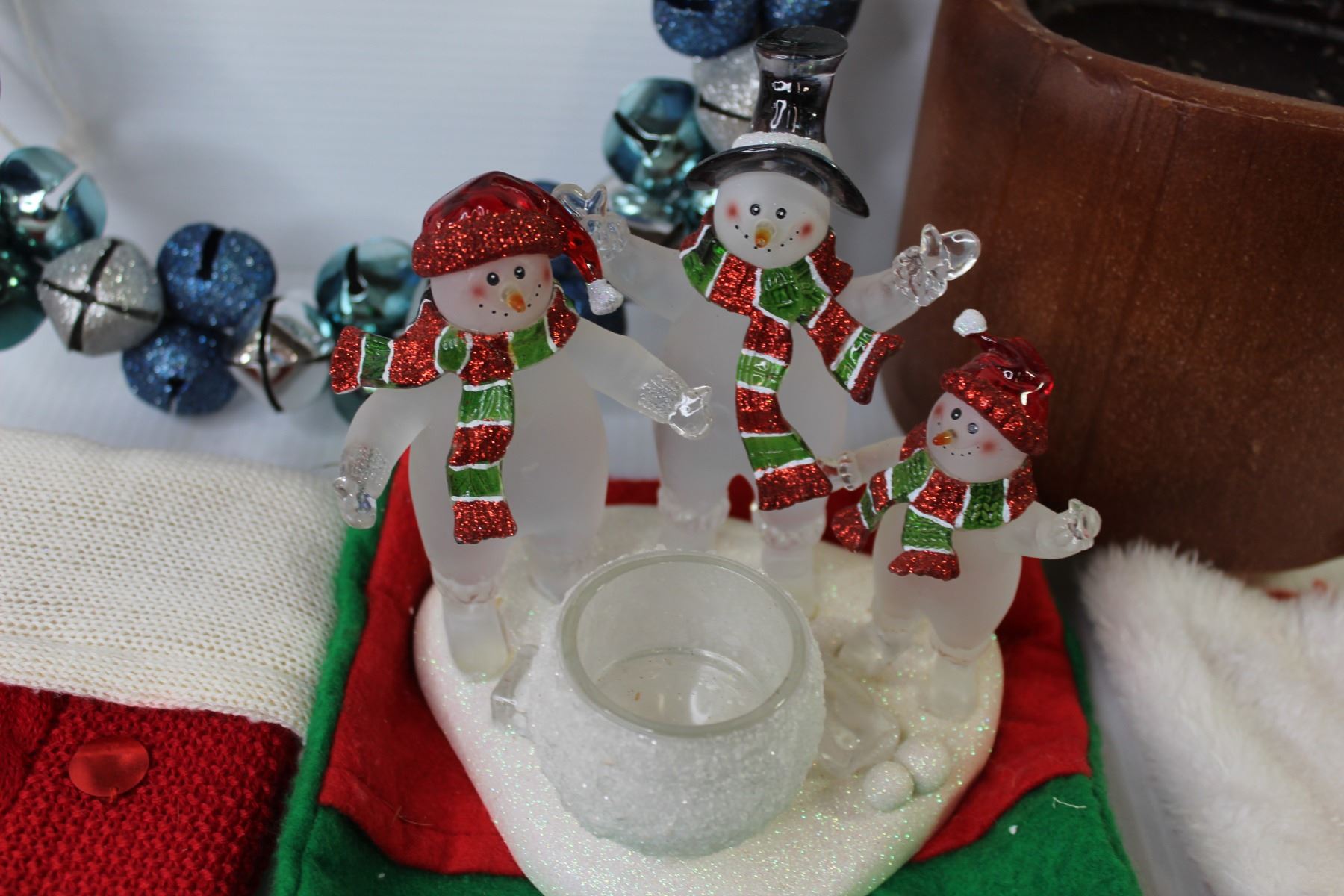 Large Candle - Wood Crafted Decoration - (3) stockings - Ring of Bells - Glass Snowmen Candle Holder