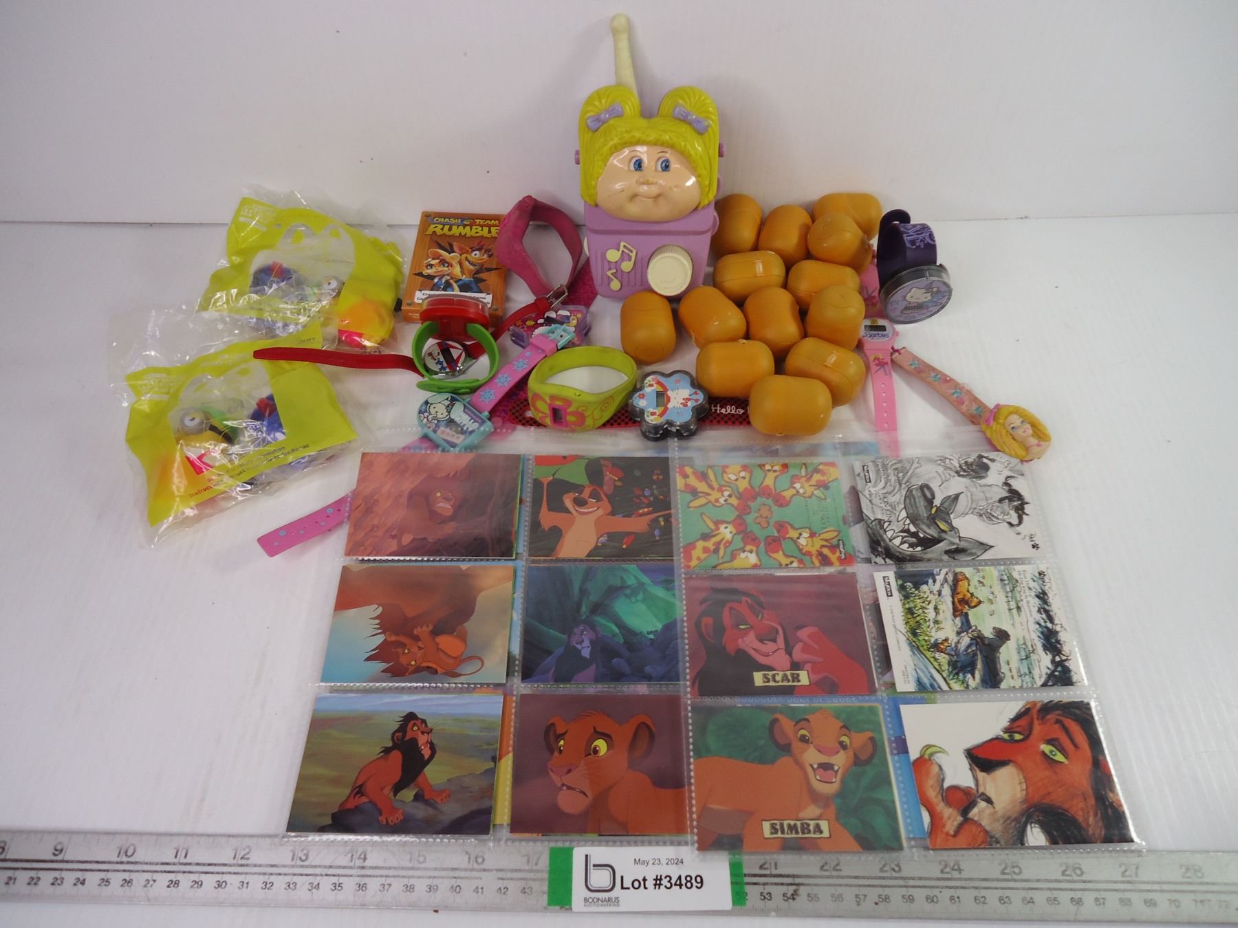 Large Lot of Kinder Surprise(unopened),(10) Watches,(5) Sheets of Lion King Cards,(2) Minions Toys(unopened) Cabbage Patch Radio and card game