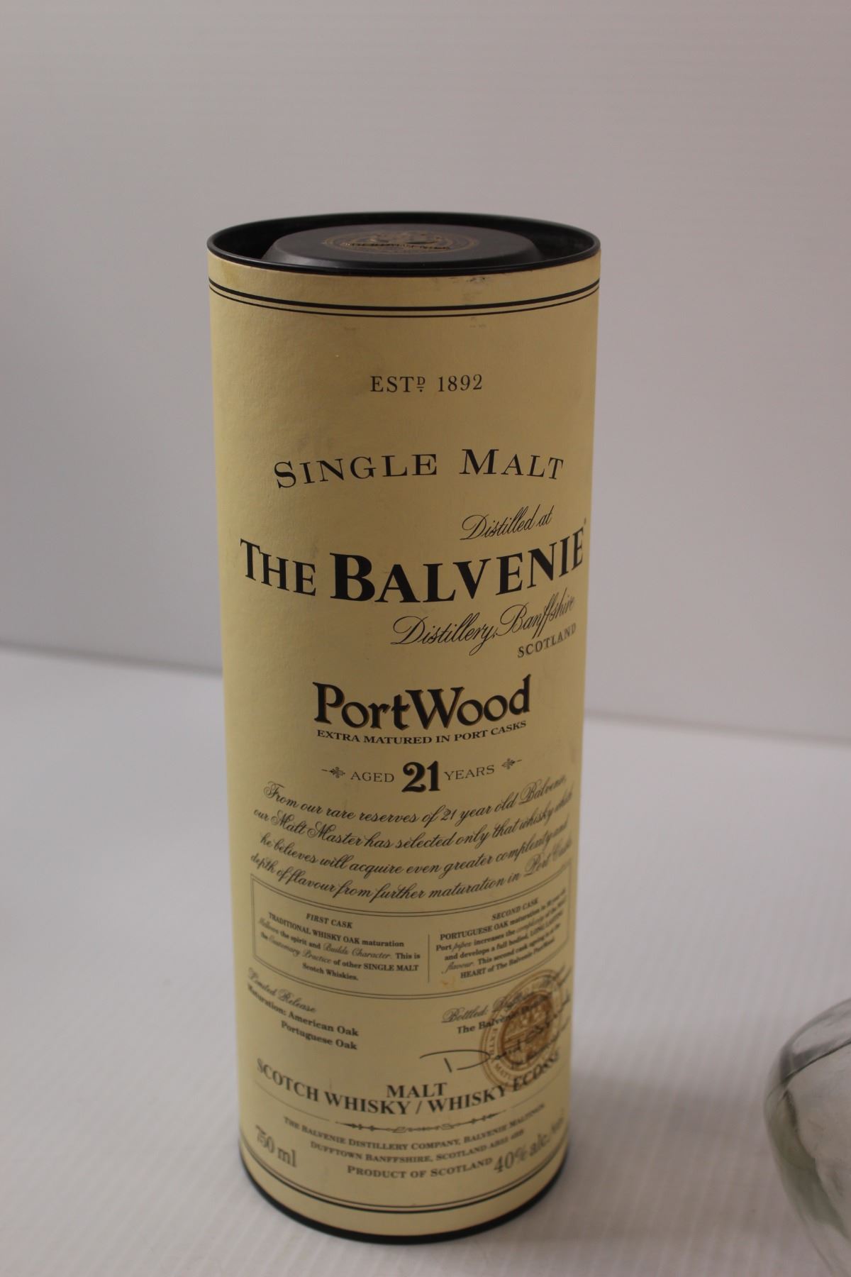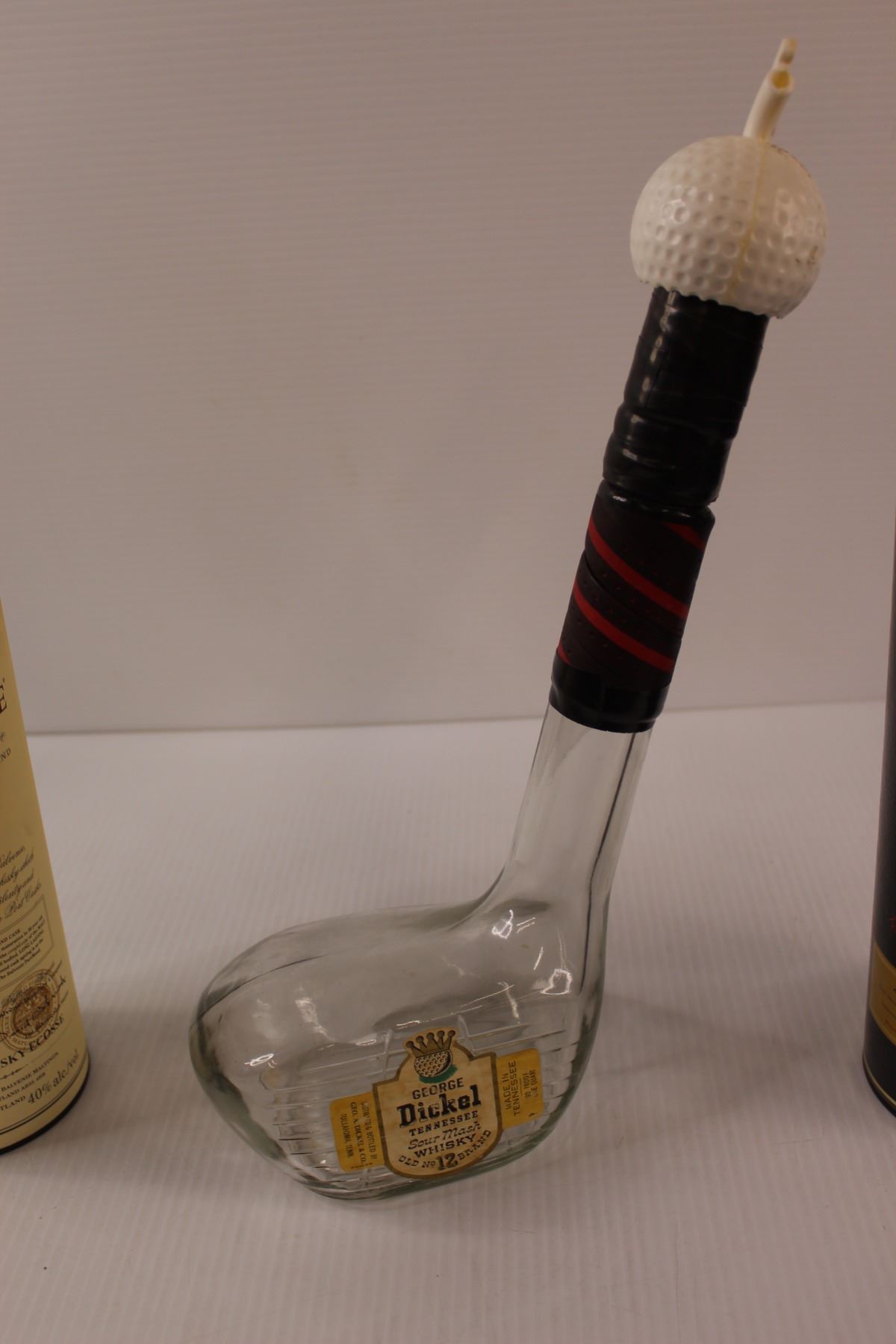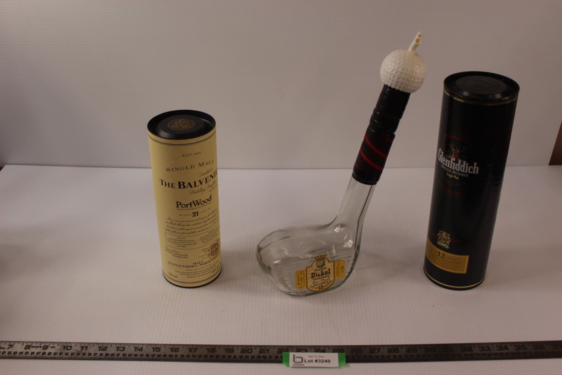 Large Vintage "George Dickel Tennessee Sour Mash Whiskey" 1960's Golf Club Glass Bottle w/ Golf Ball Pour Cap, Balvenie Portwood 21 Years Aged Box & Glenfiddich Box