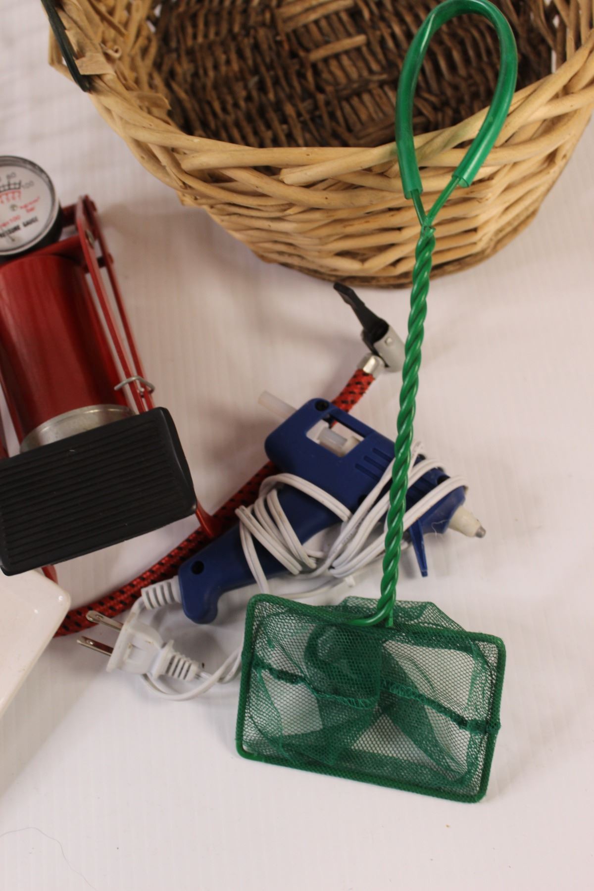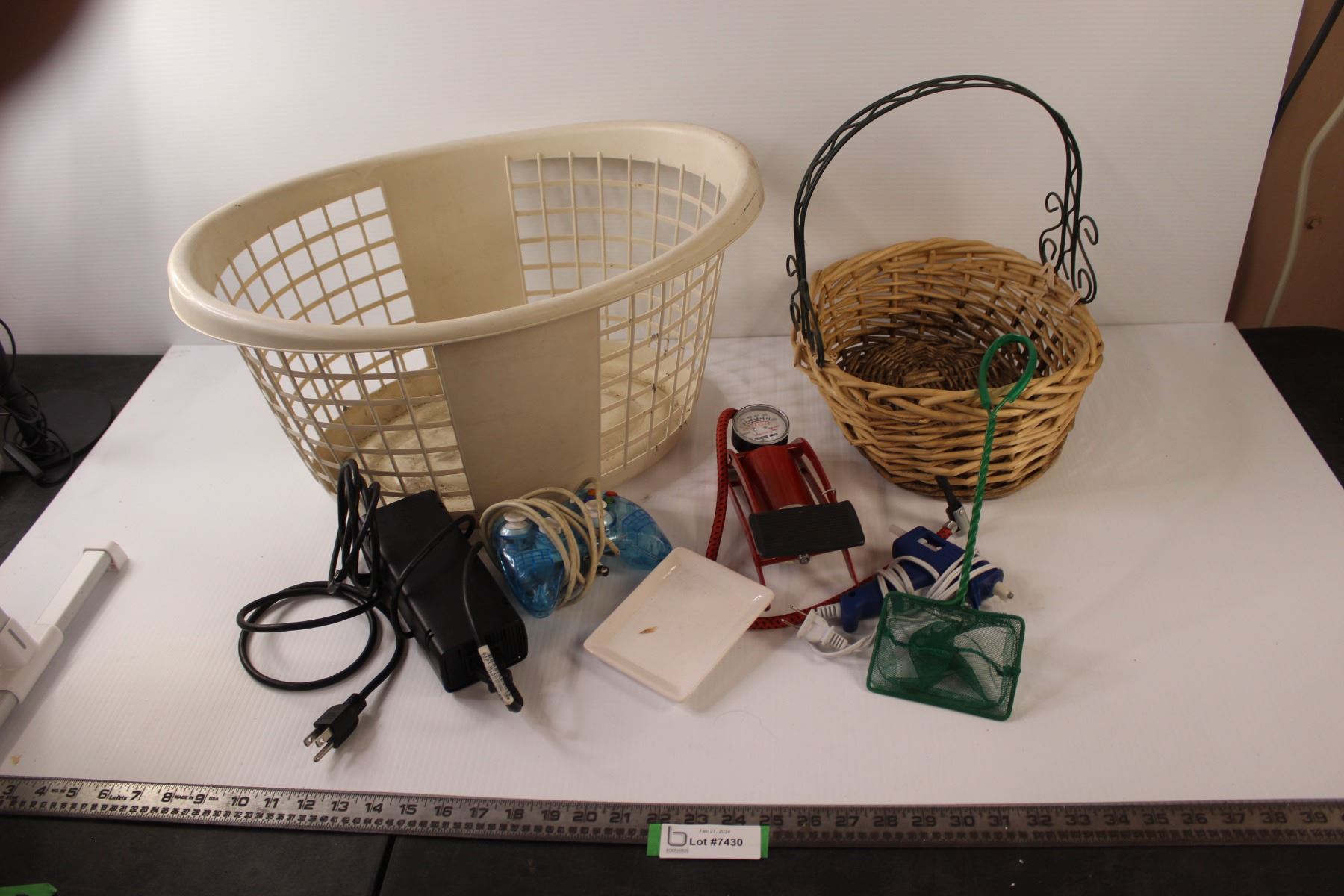 Laundry Basket, Rock Candy XBOX Controller (Corded), Wicker Basket, XBOX 360 Power Cable , Bicycle Tire Pump, Hot Glue Gun, Small Fish Net