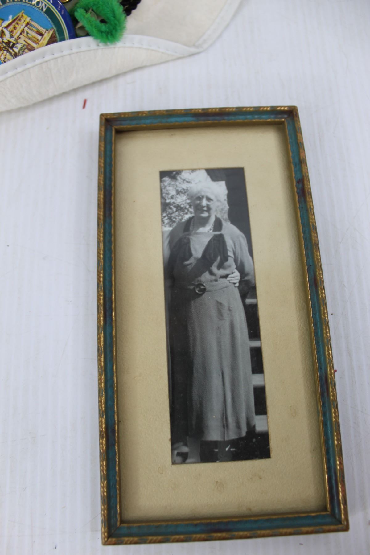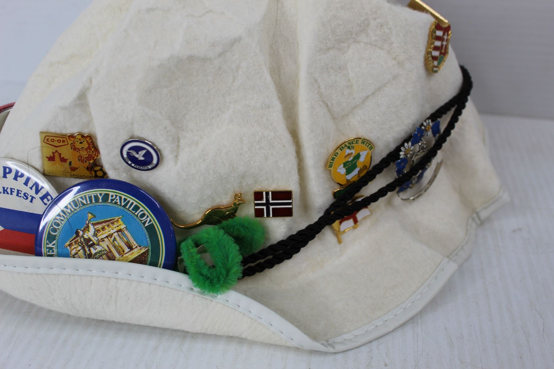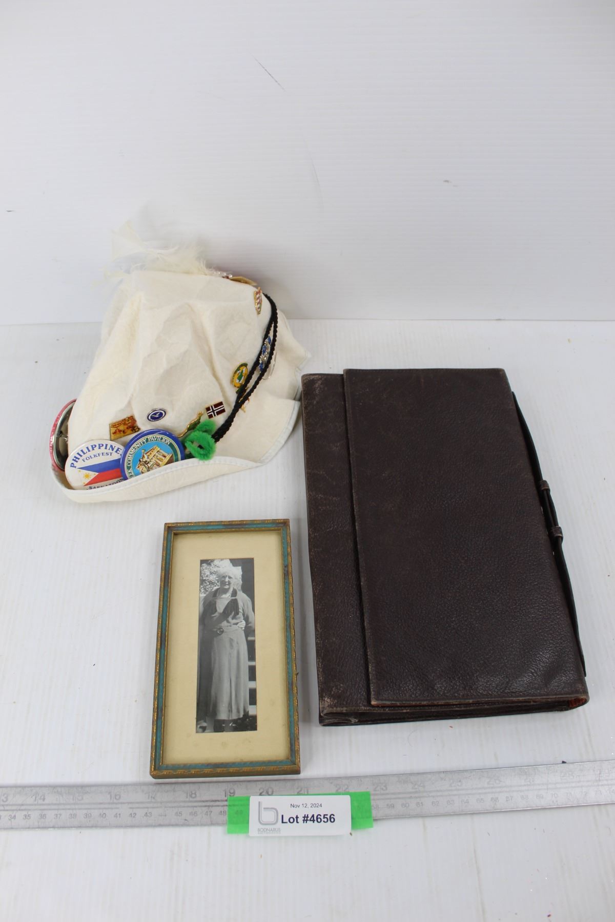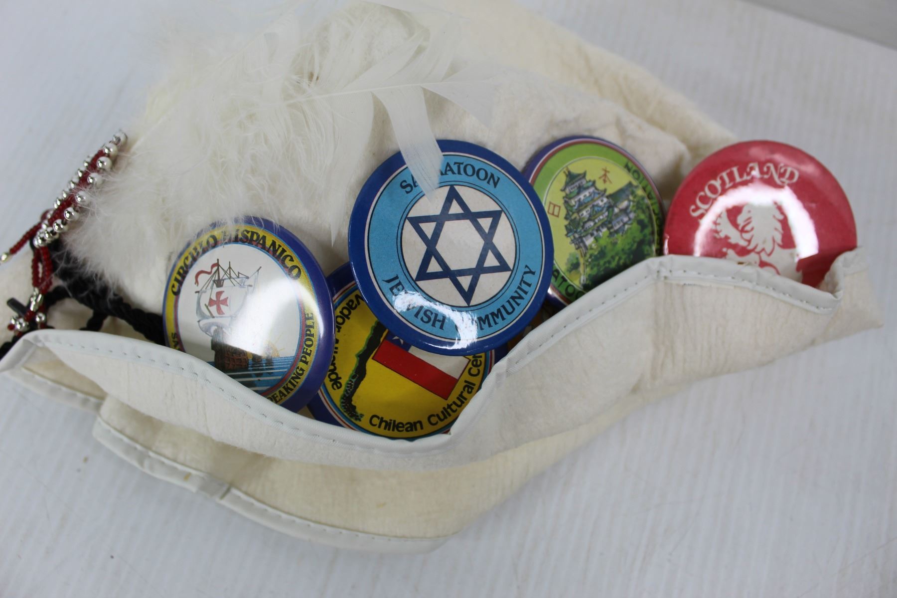 Leather Hand Bag/ Case, White Feathered Hat w/ Various Pins, Misc.