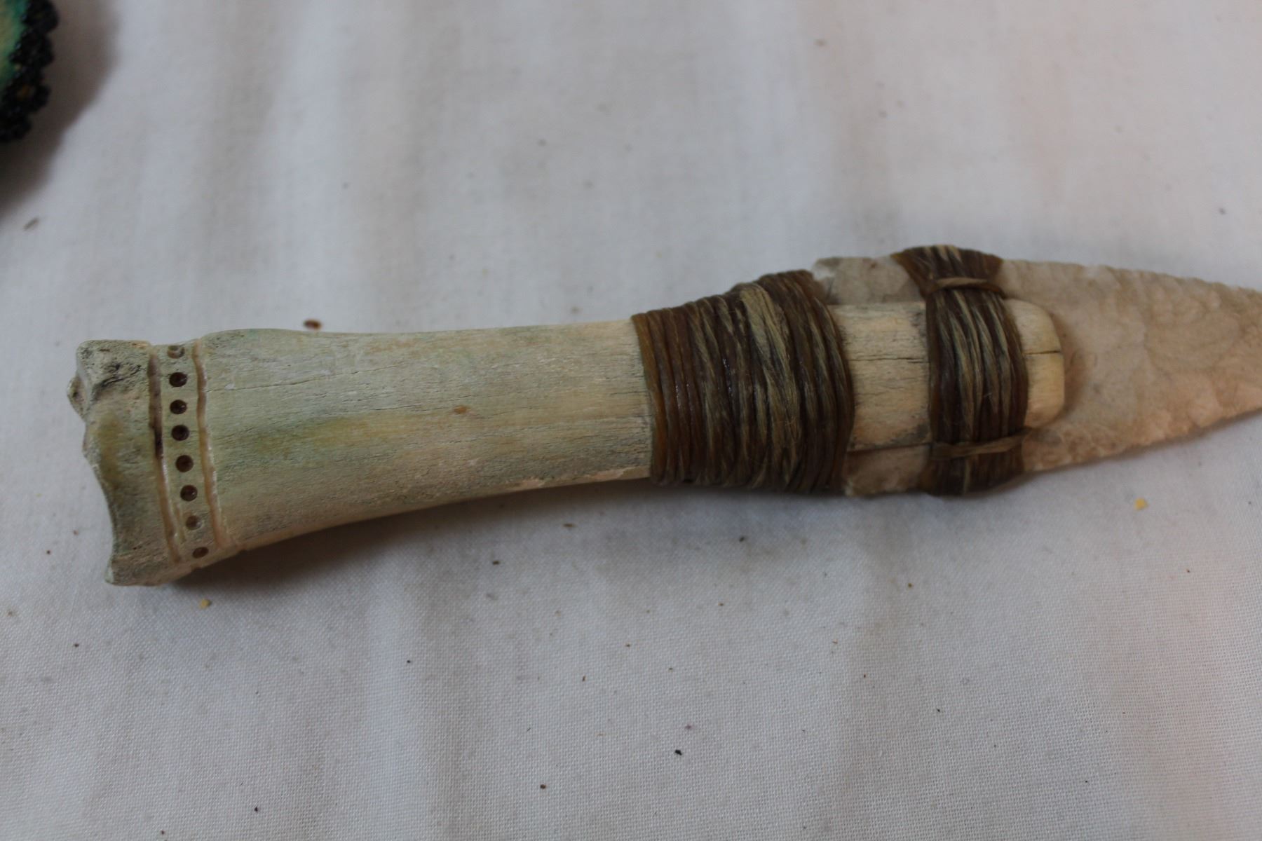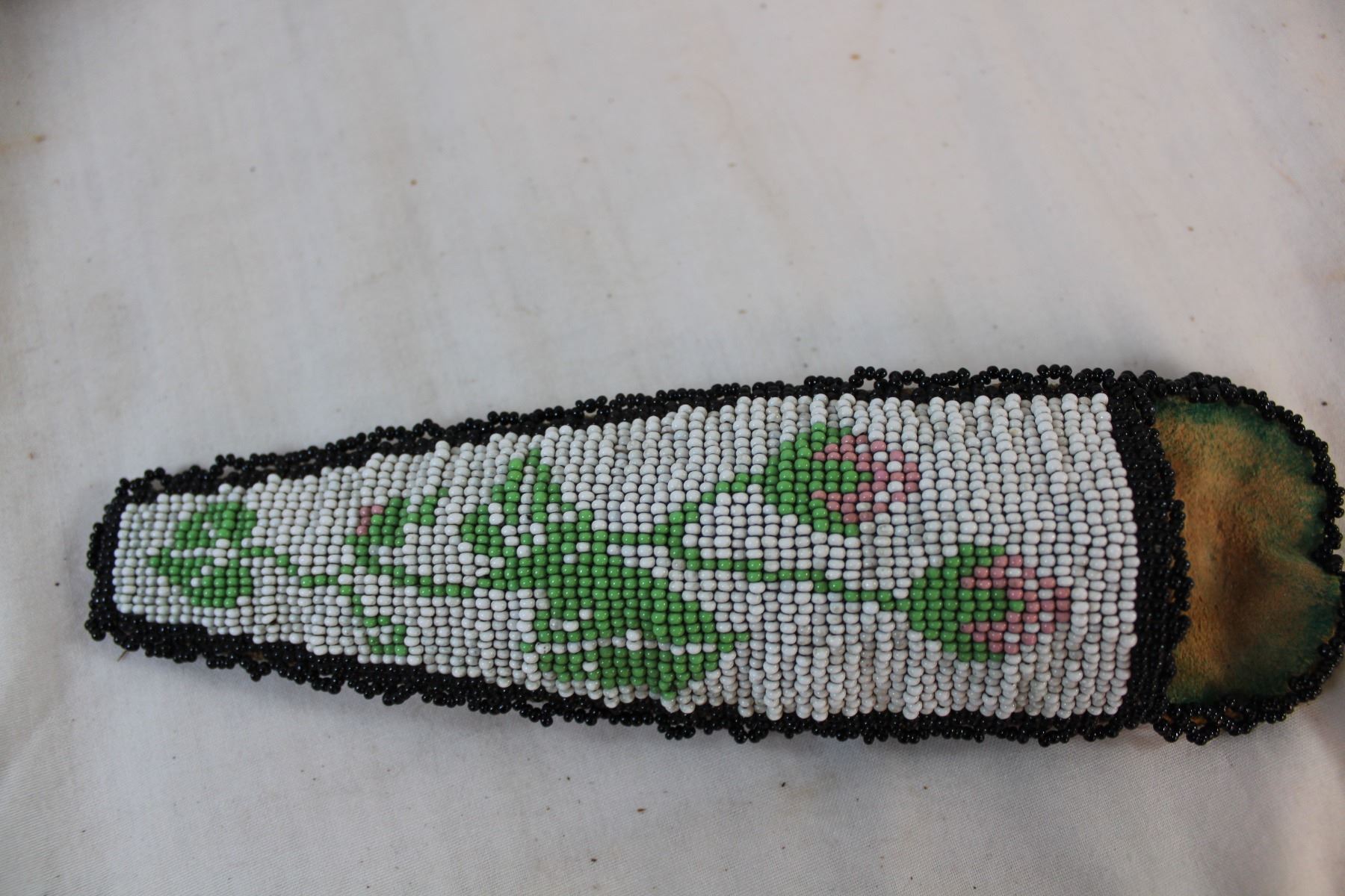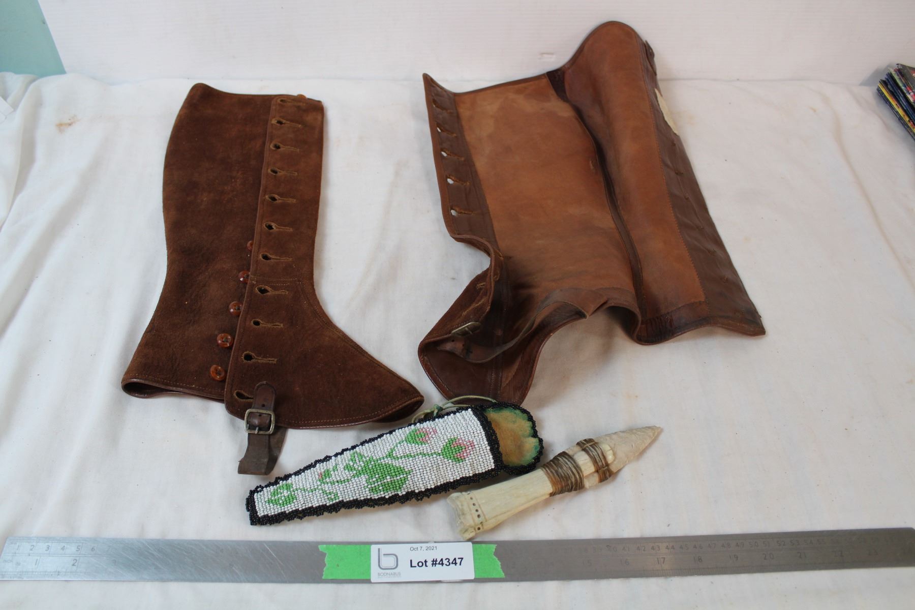 Leather spats, antique stone knife in beadwork case