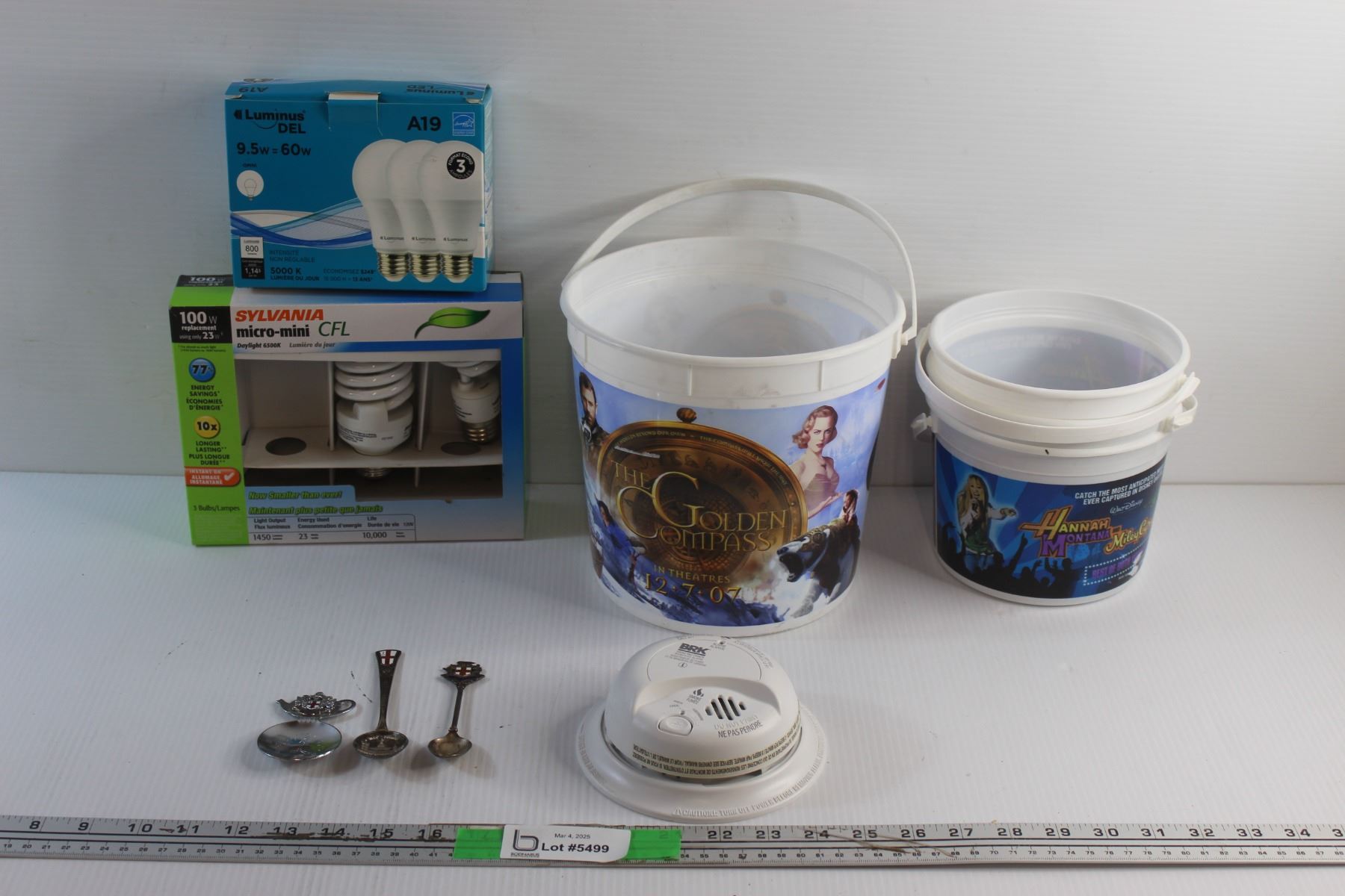 Light Bulbs, Souvenir Spoons, Smoke Alarm, (3) Hannah Montana & (1) The Golden Compass Plastic Buckets