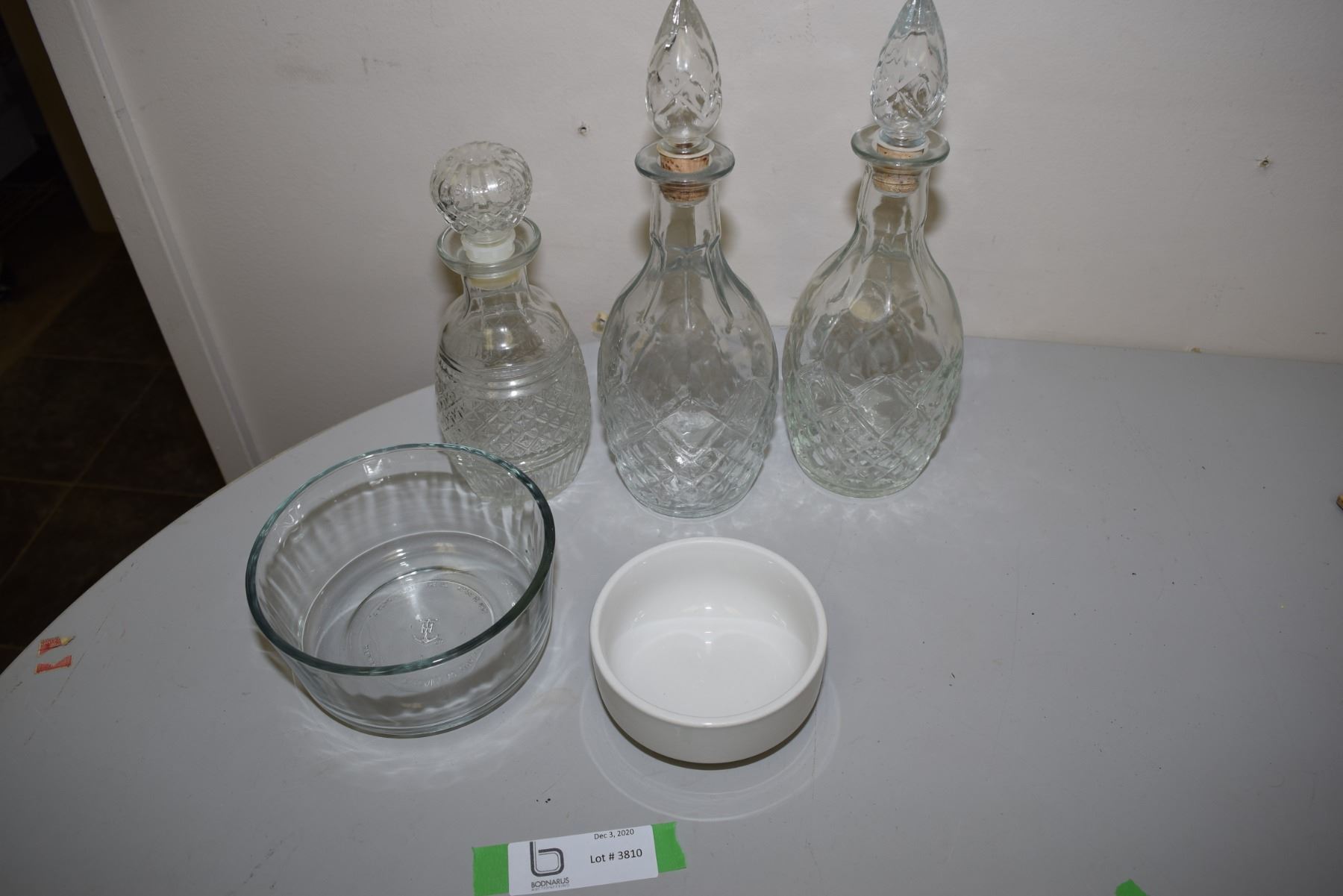 Liquor Pressed Glass Bottles, and Anchor Hocking Bowl