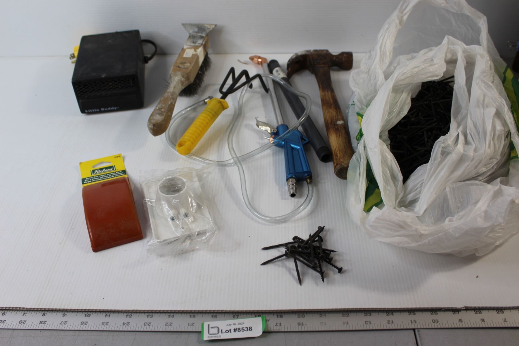 Little Buddy Heater, Hammer, Rubber Sander, Wire Brush, Bag of Screws, Misc.