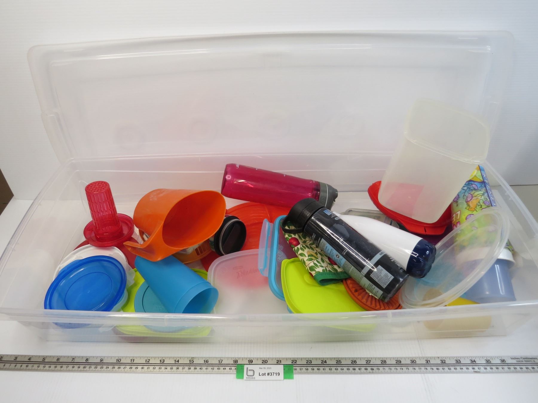 Long Tote w/Assorted Plastic kitchen Items - Water Bottles