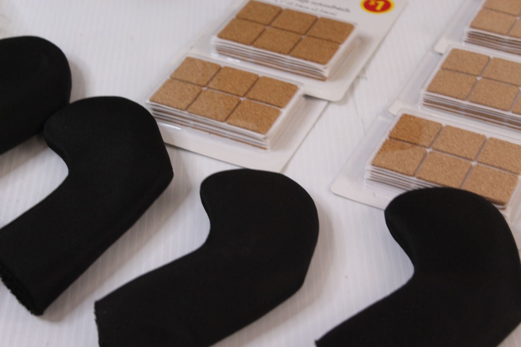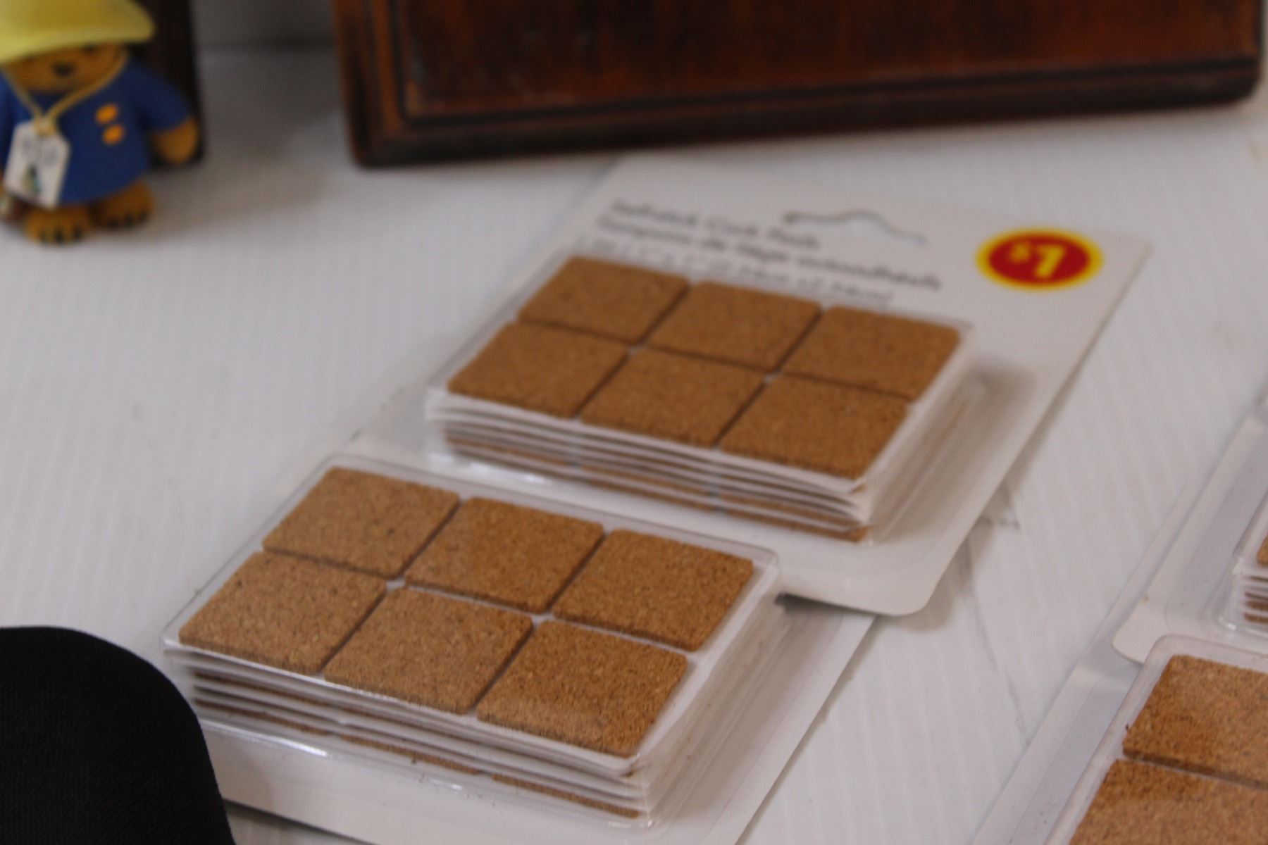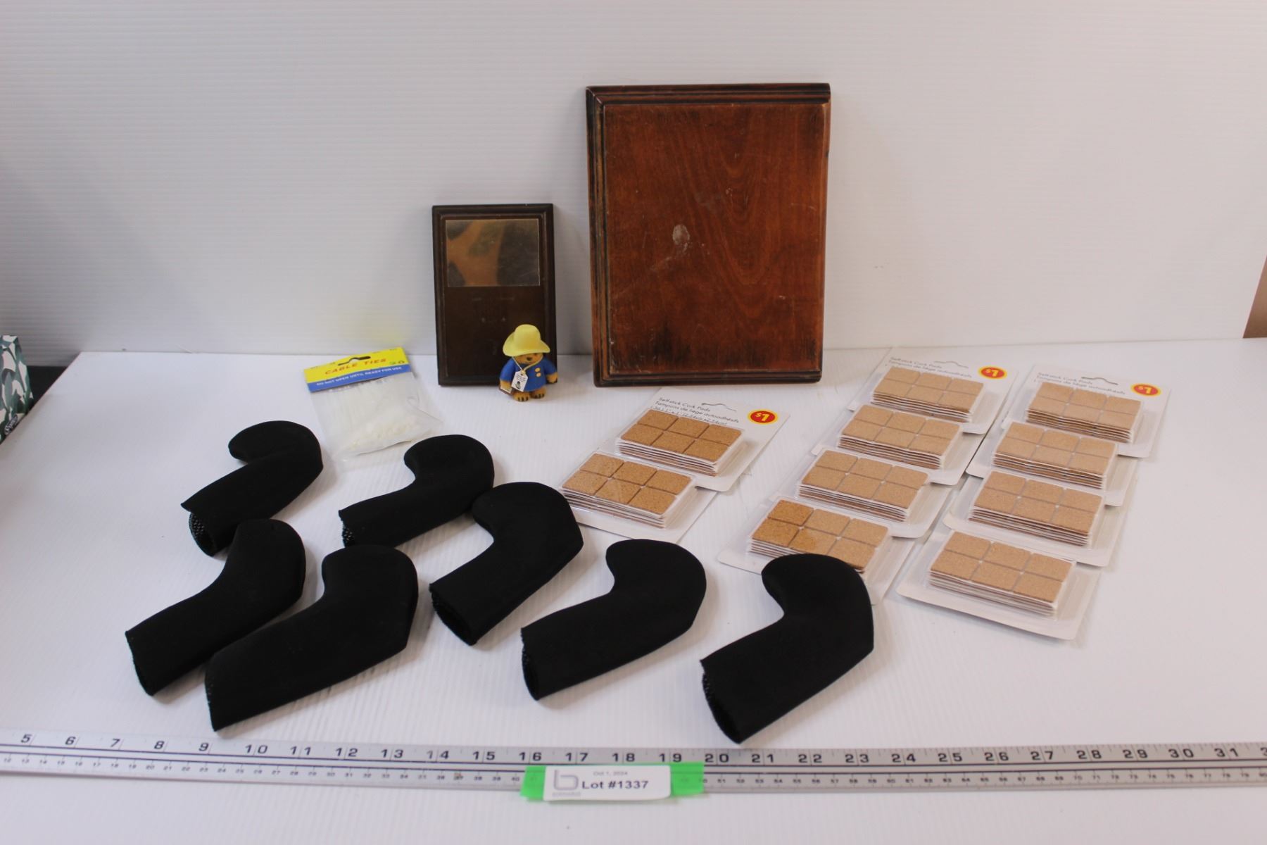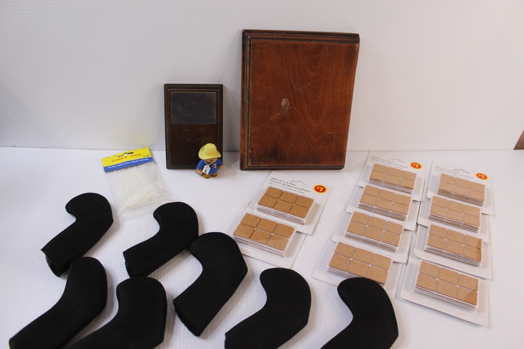 Lot: (10) Self Stick Cork Pads, Cable Ties, (7) Golf Club Covers, Paddington Bear Figurine, (2) Wood