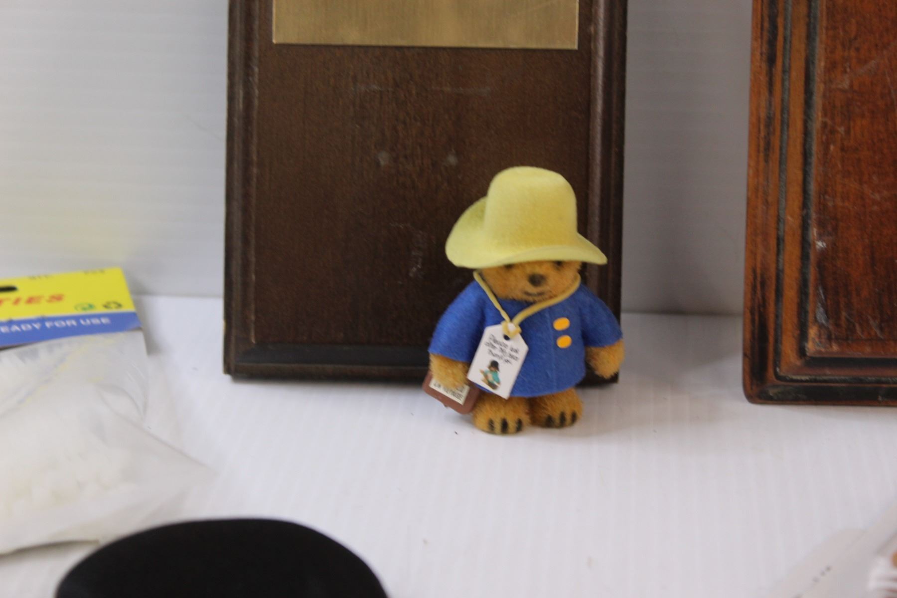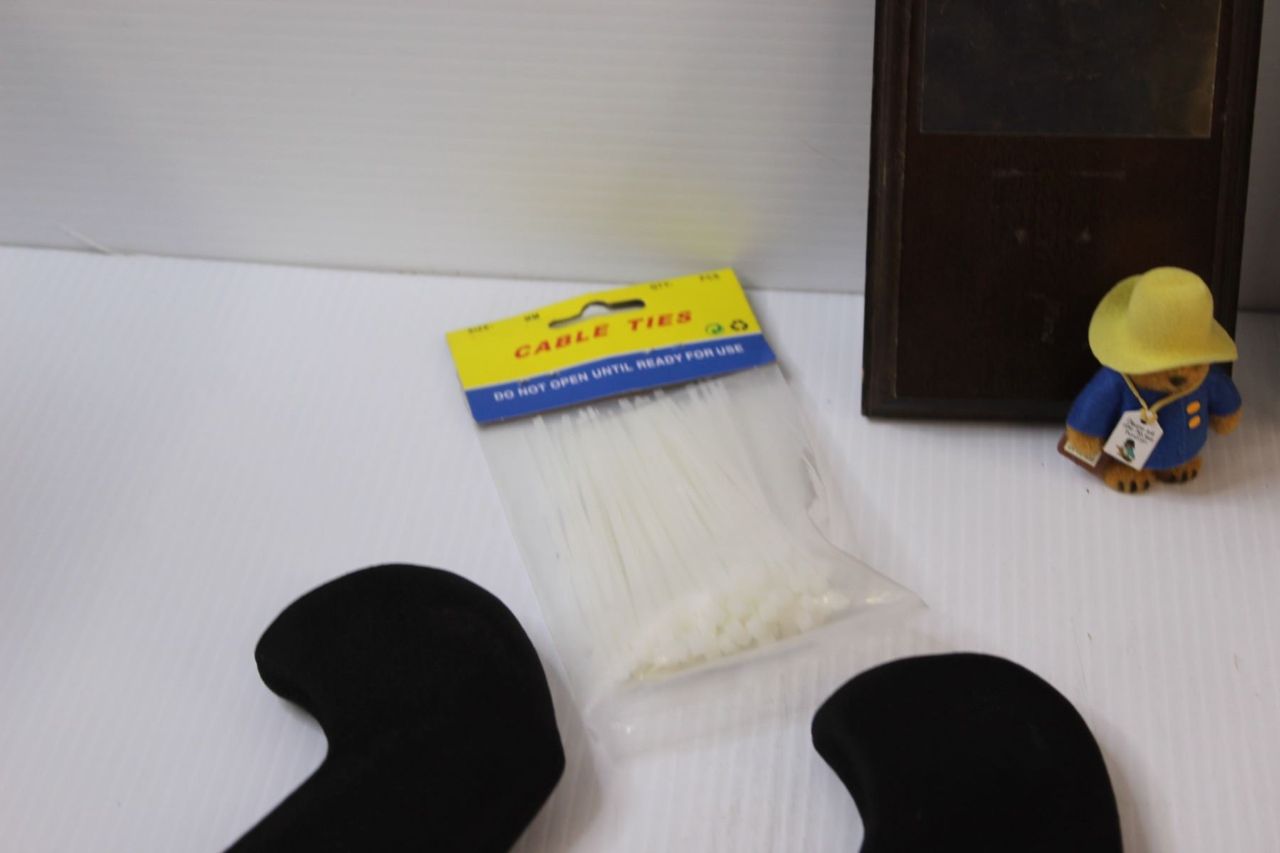 Lot: (10) Self Stick Cork Pads, Cable Ties, (7) Golf Club Covers, Paddington Bear Figurine, (2) Wood Wall Plaques