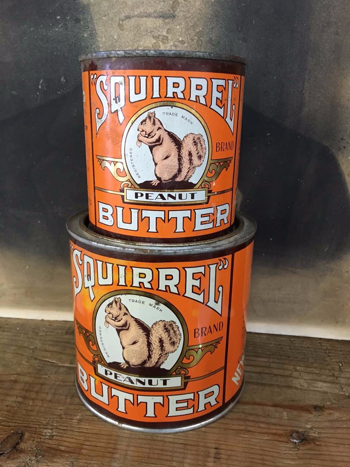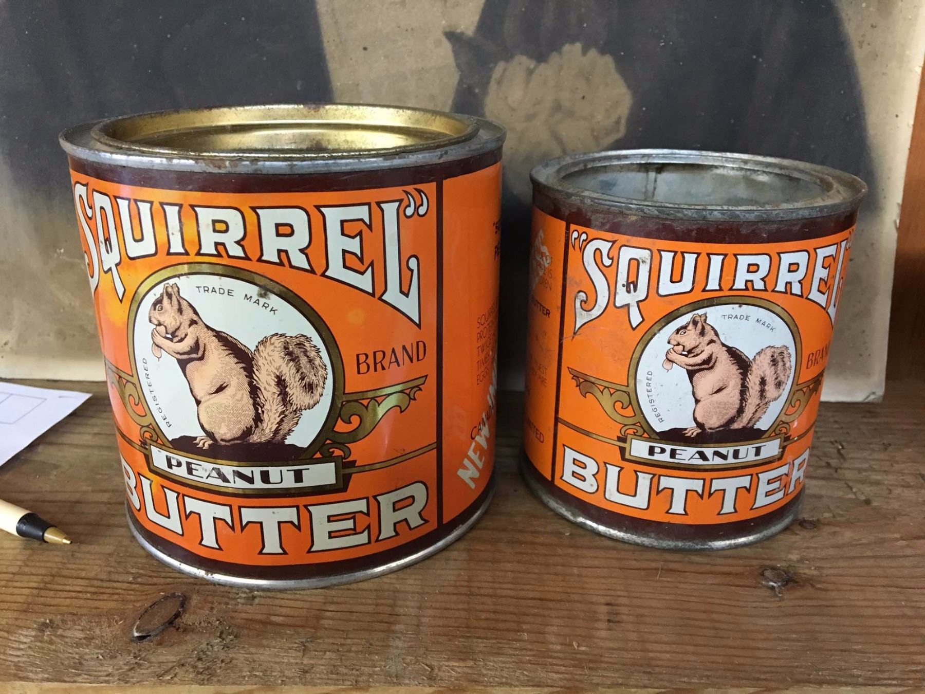 Lot (2) Squirrel Peanut Butter Tins 48oz & 26oz