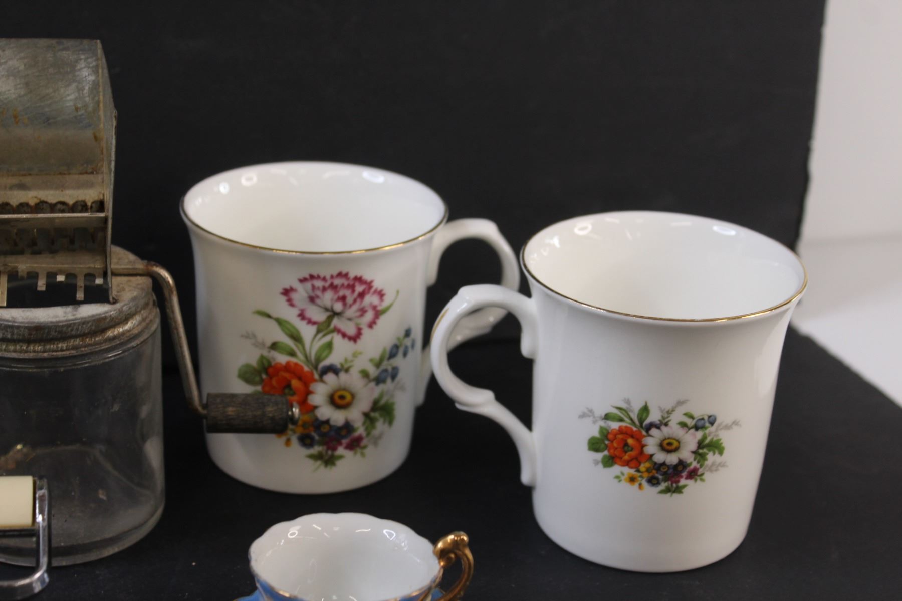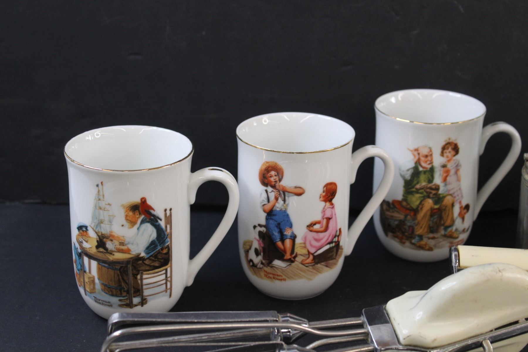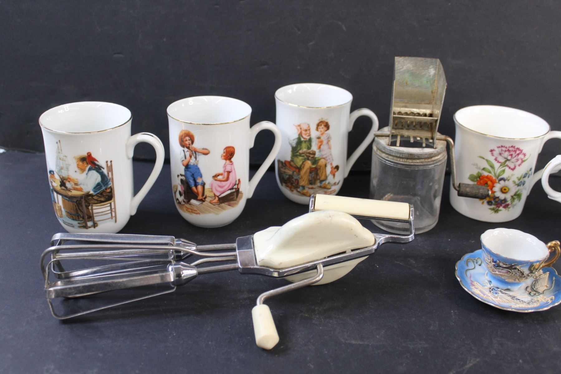 Lot: (3) Norman Rockwell Mugs, Vintage Wisk Beater, Vintage Grater & Dragon Mini Tea Set, (2) Floral Tea Mugs