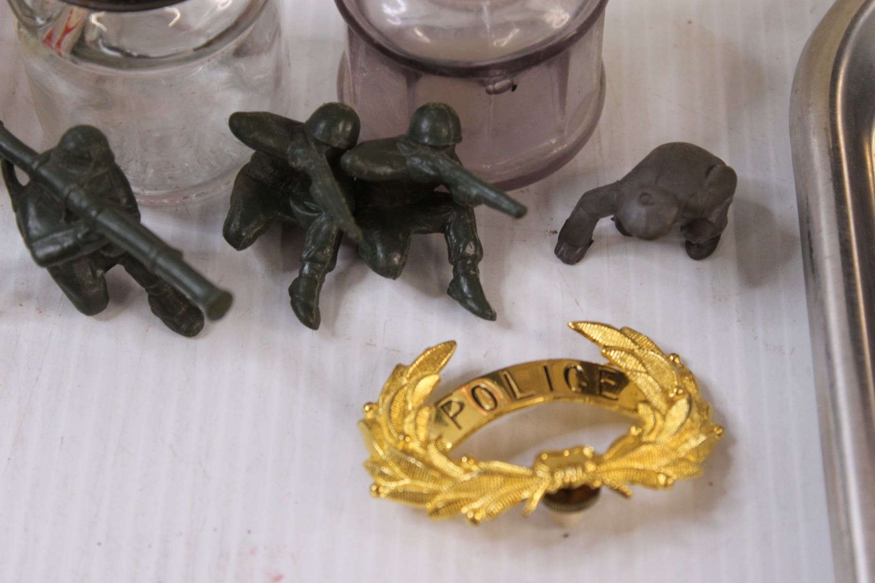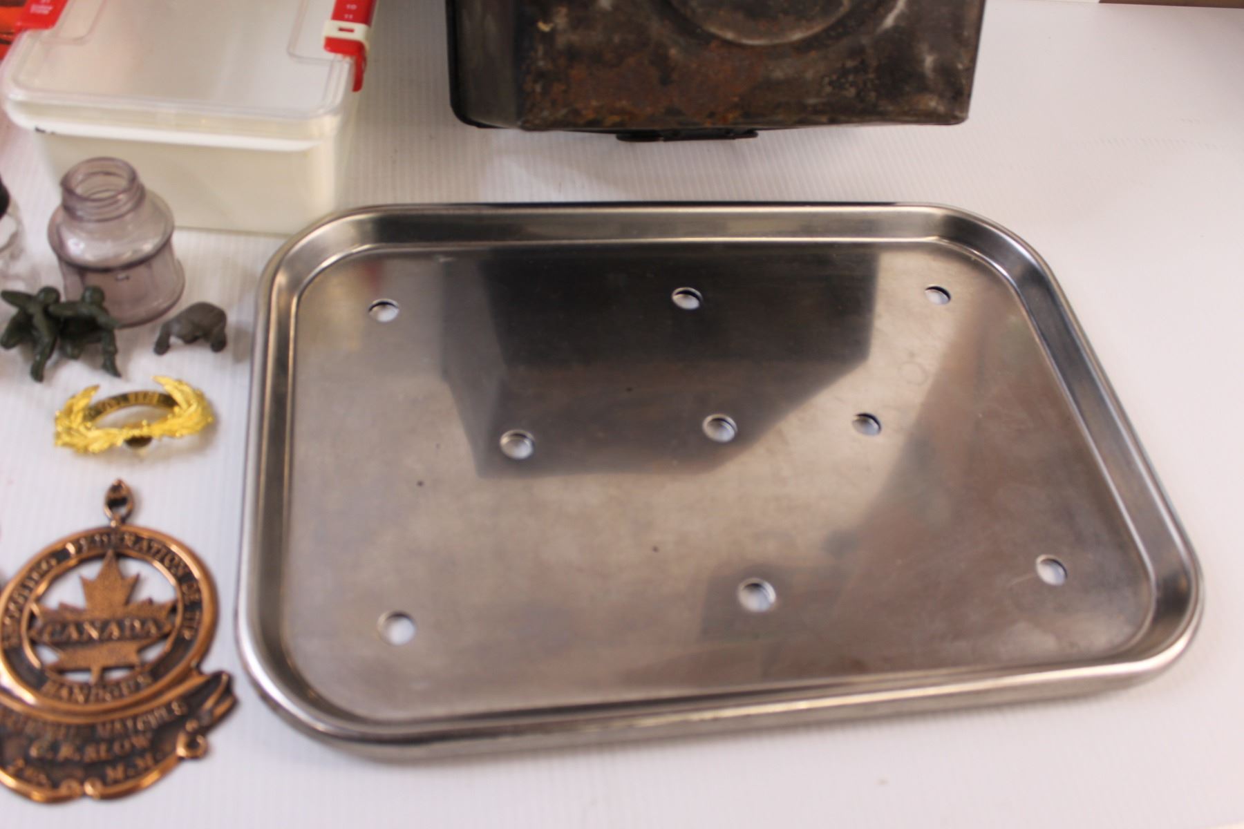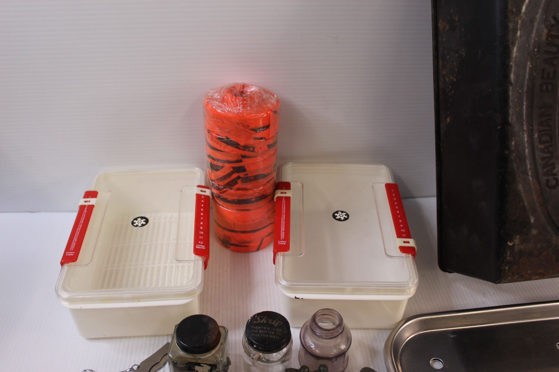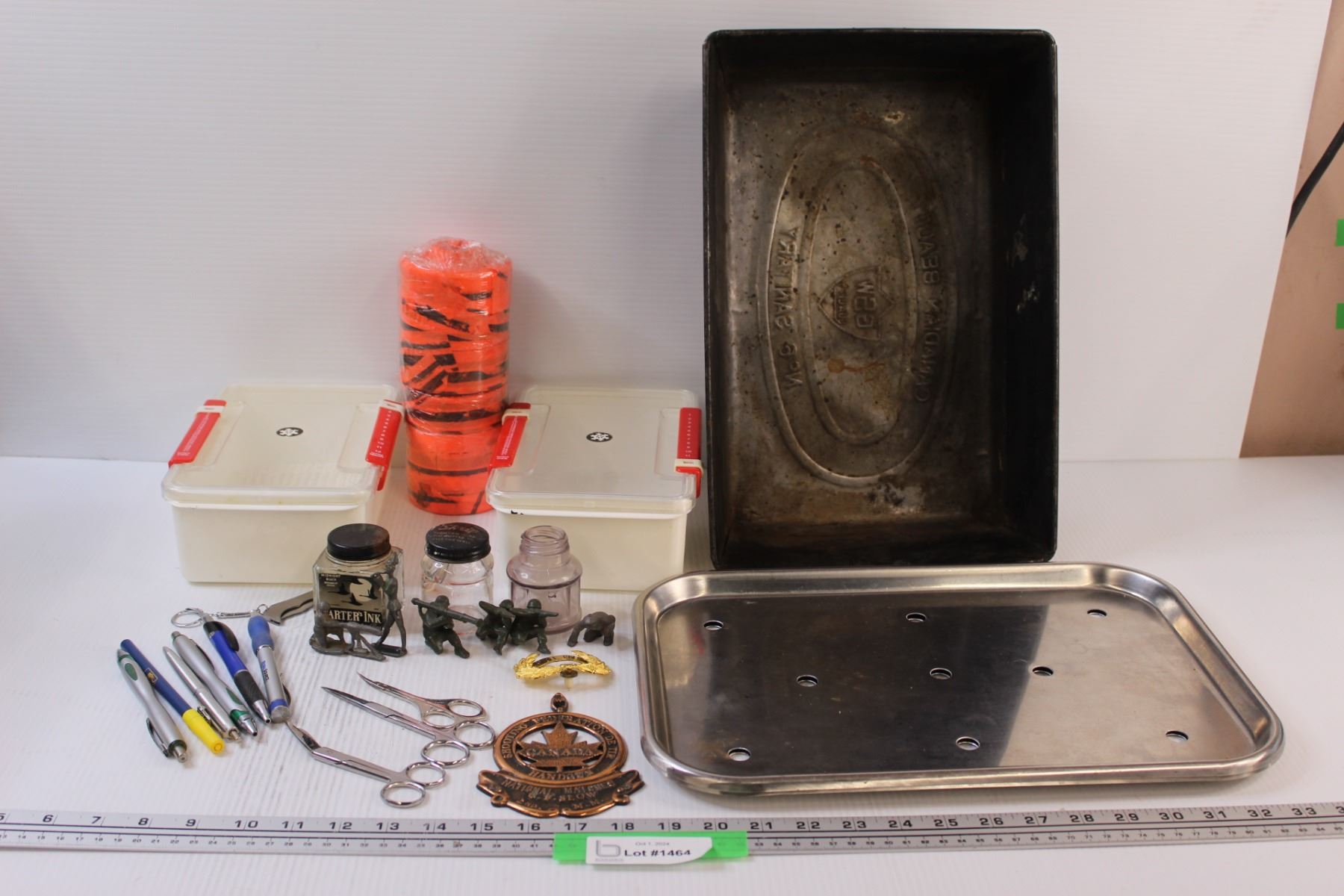 Lot: Canada Shooting Medal, Toy Soldiers, Medic Scissors, Ink Glass Jars, Vintage Baking Pan - 9" x 12". (2) Refrigerator Containers, Orange Flag Tape Rolls, Misc.