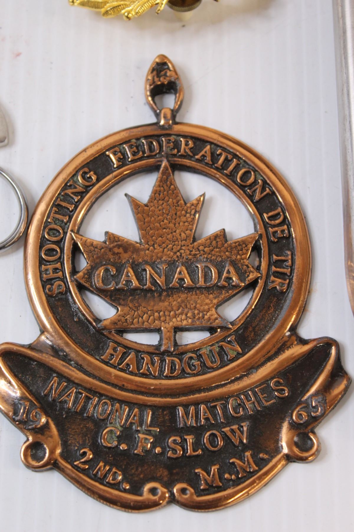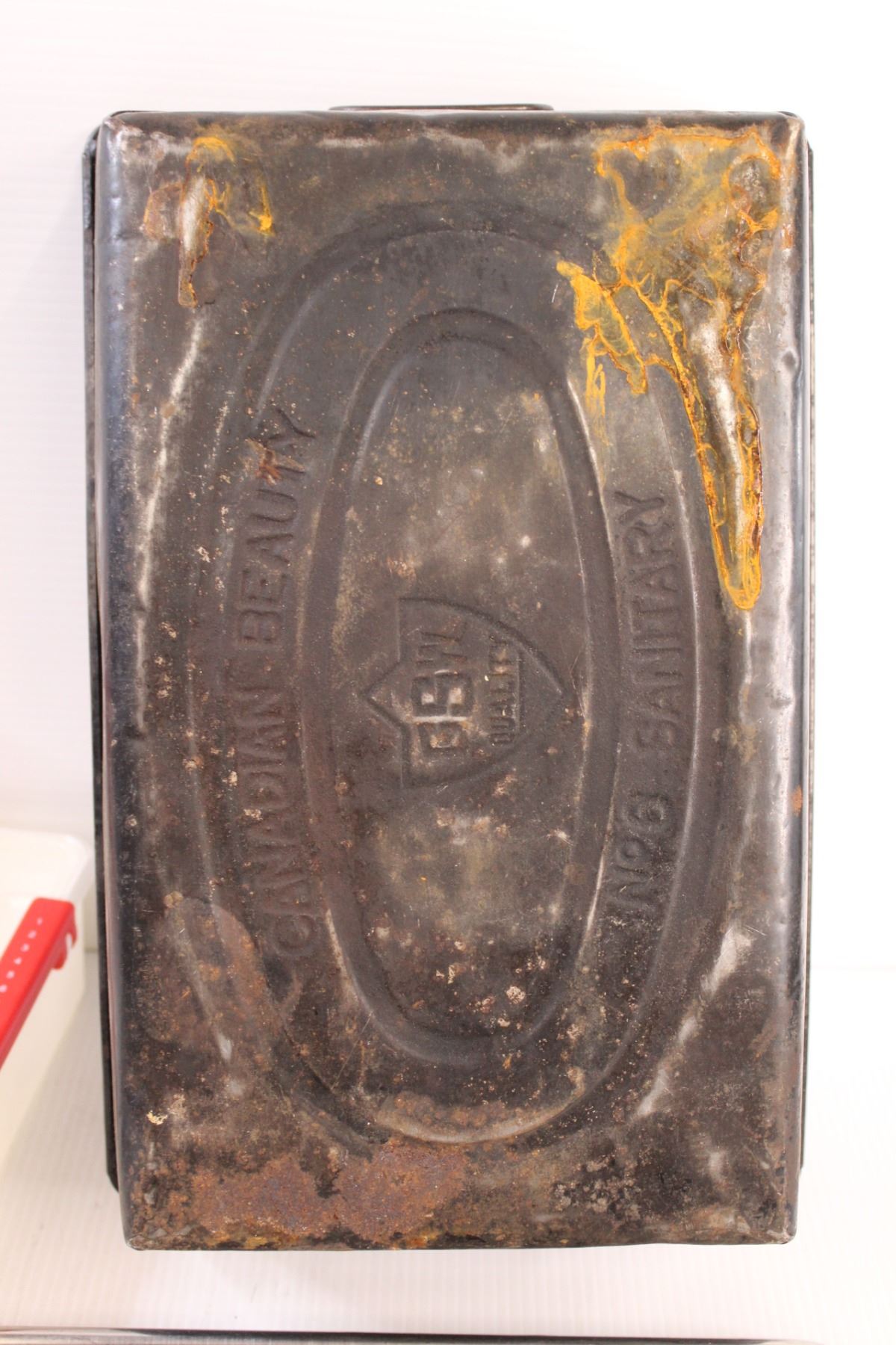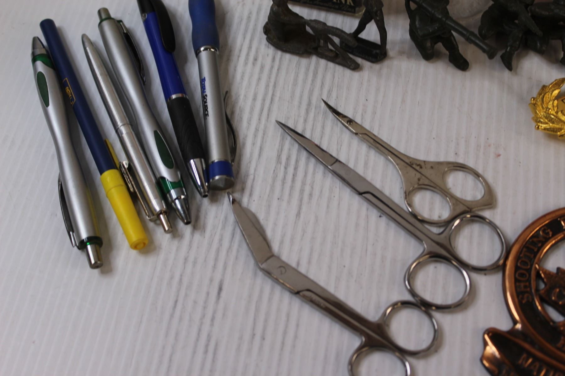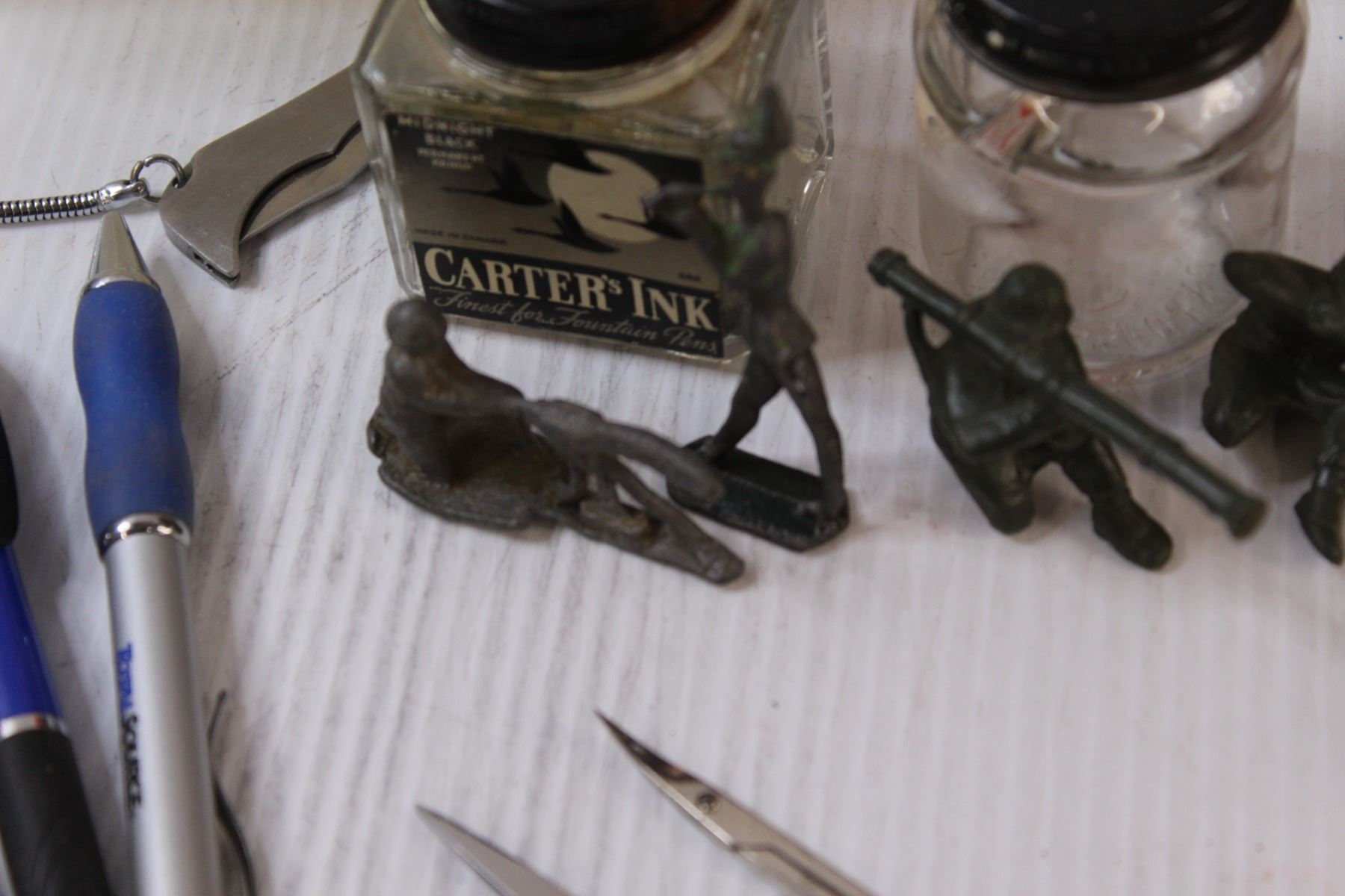 Lot: Canada Shooting Medal, Toy Soldiers, Medic Scissors, Ink Glass Jars, Vintage Baking Pan - 9" x 12". (2) Refrigerator Containers, Orange Flag Tape Rolls, Misc.