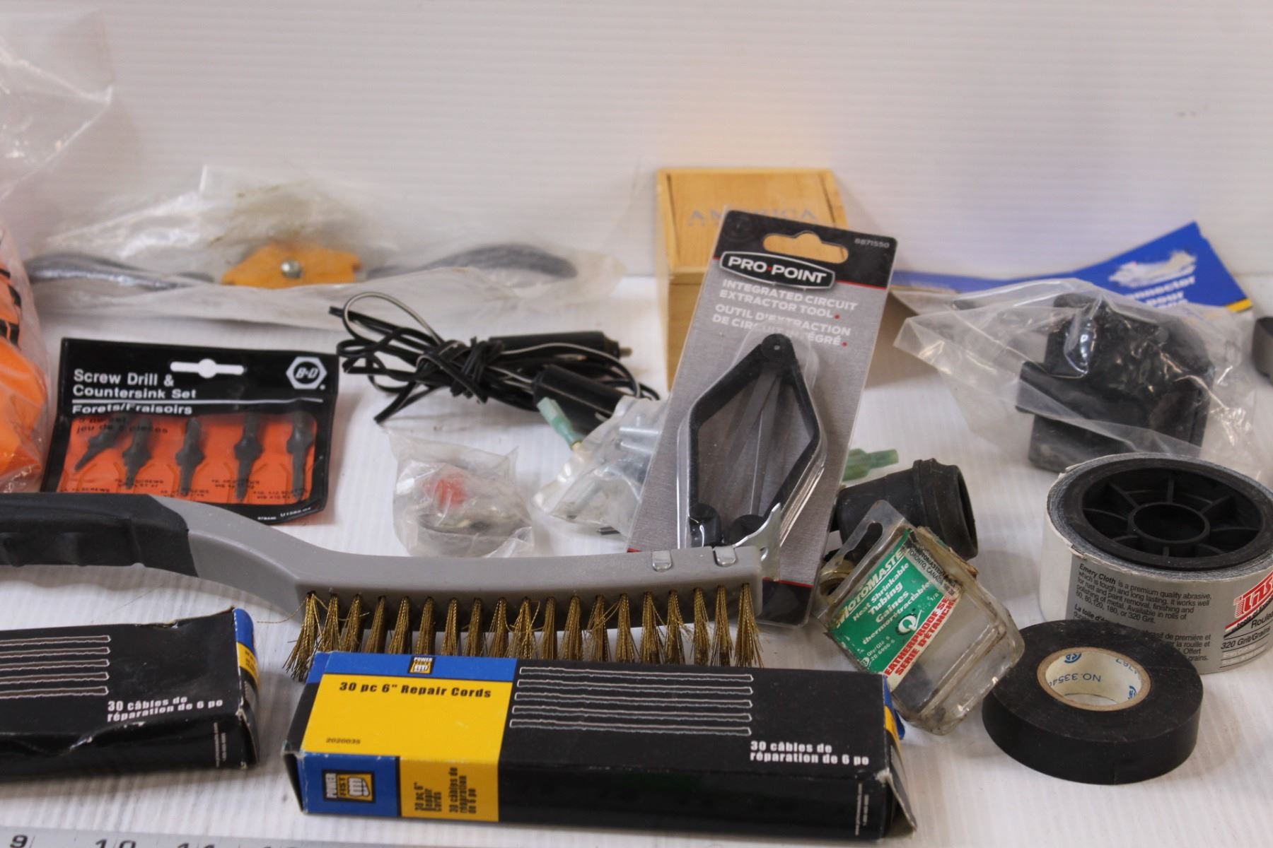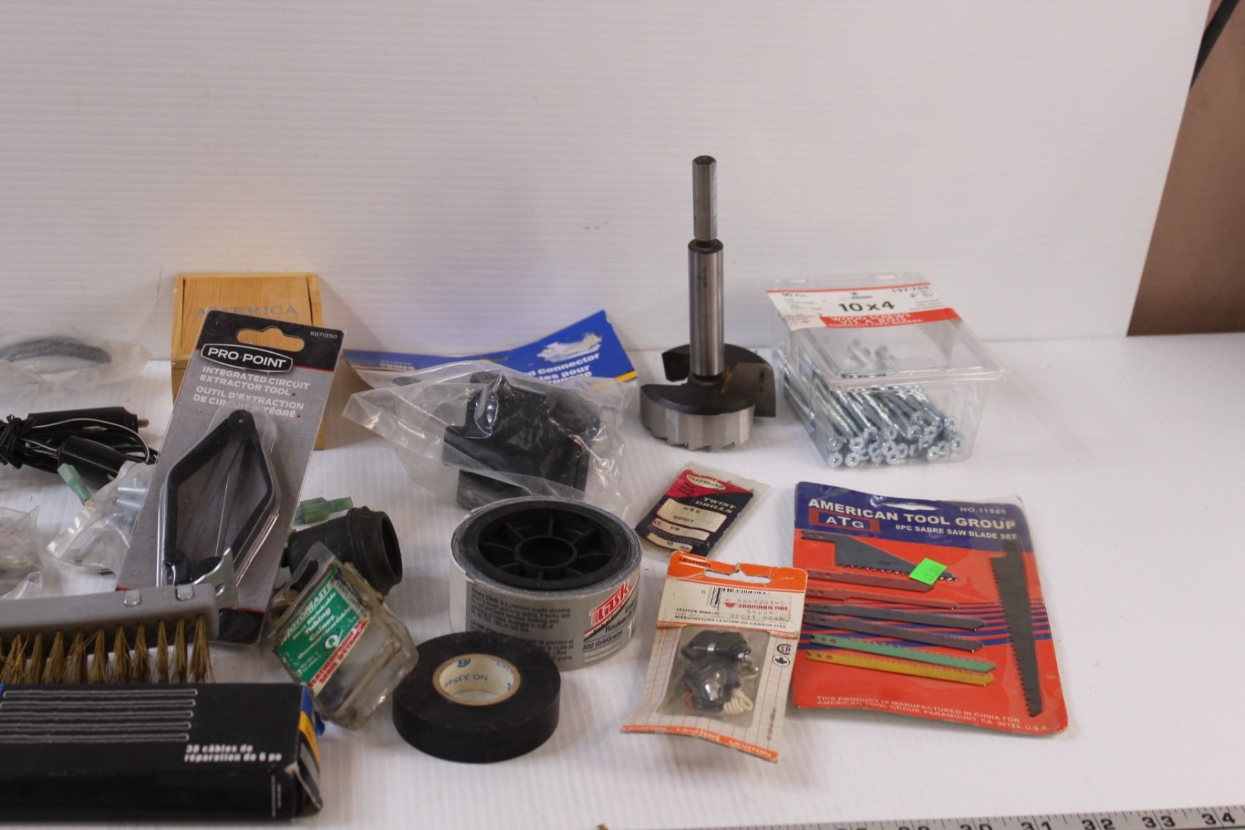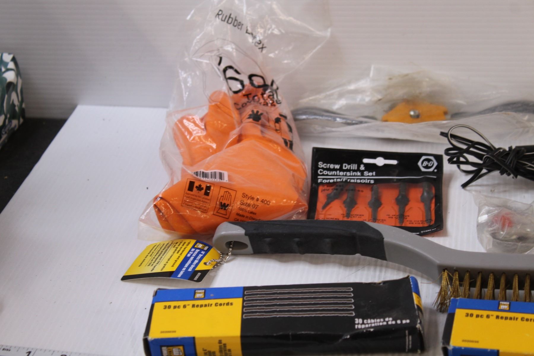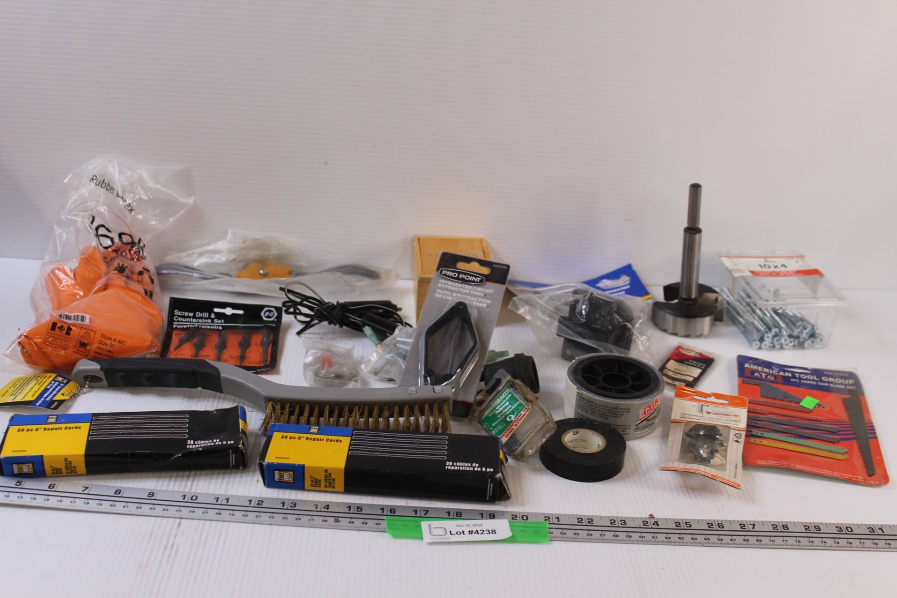 Lot: Chemical Gloves, Welding Brush, Jigsaw blades, 3" Hole Saw Bit, 4" Screws, Misc.