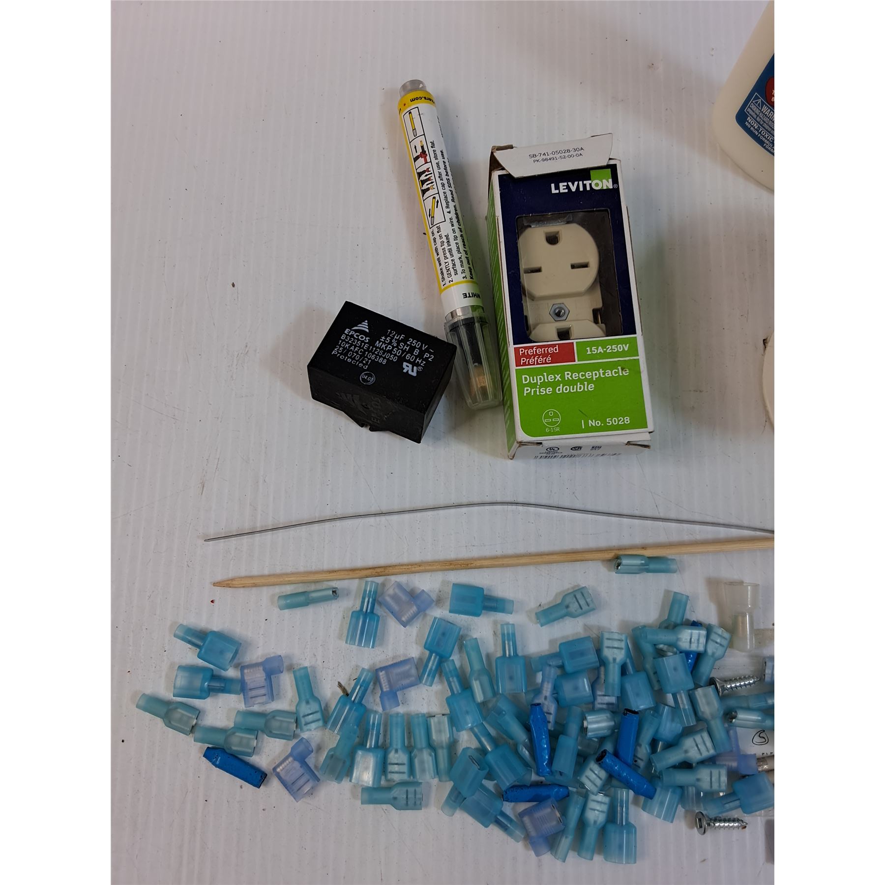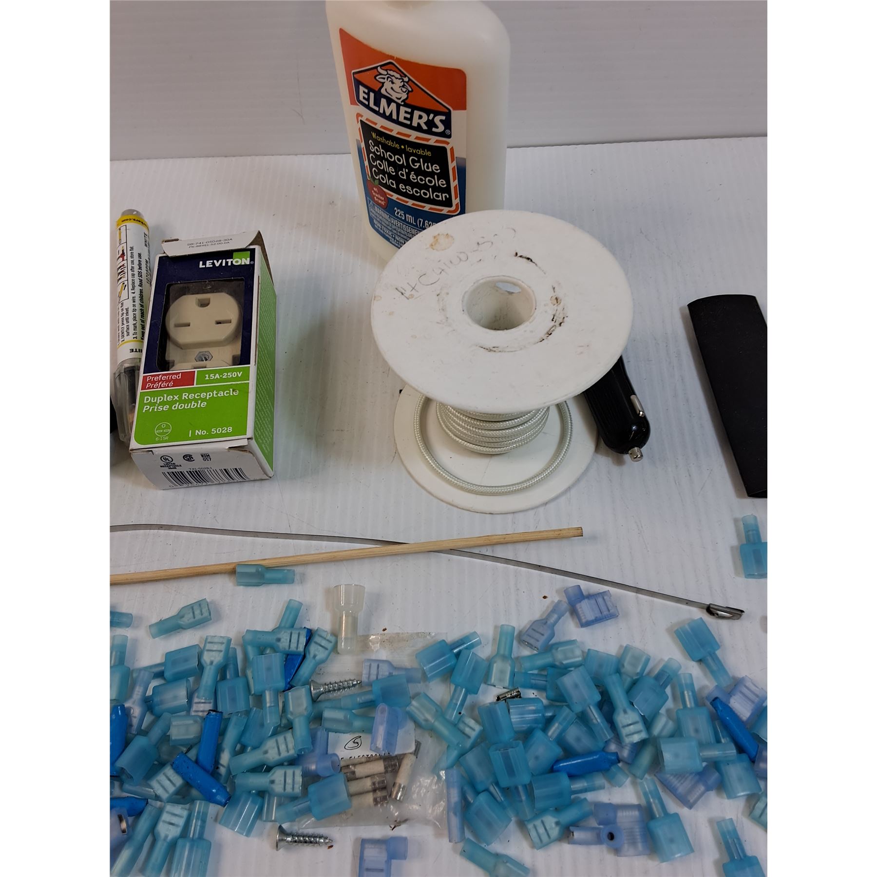 Lot: Elmer's Glue, Various Electrical Ends, Electrical Outlet, Misc