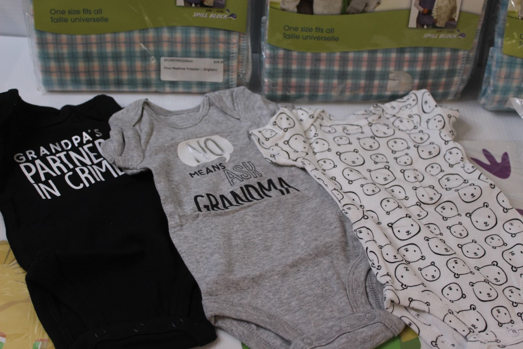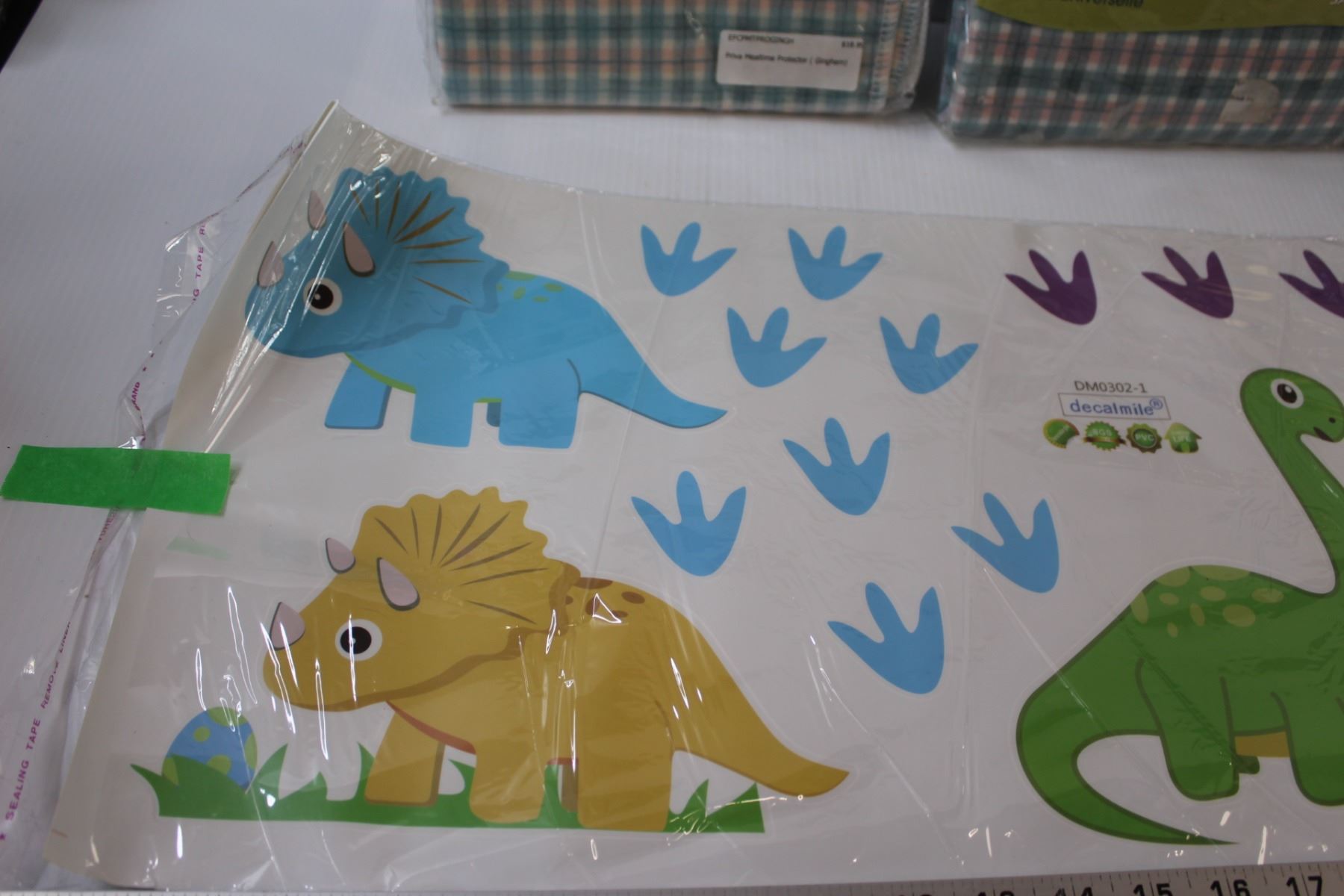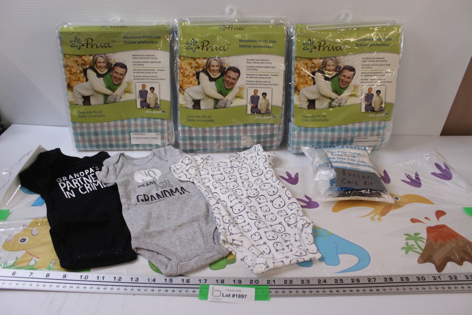 Lot: Newborn Baby Onesies (NIB), Dinosaur Wall Decor Sticker Set, (3) Meal Aprons, Bunion Care Kit,