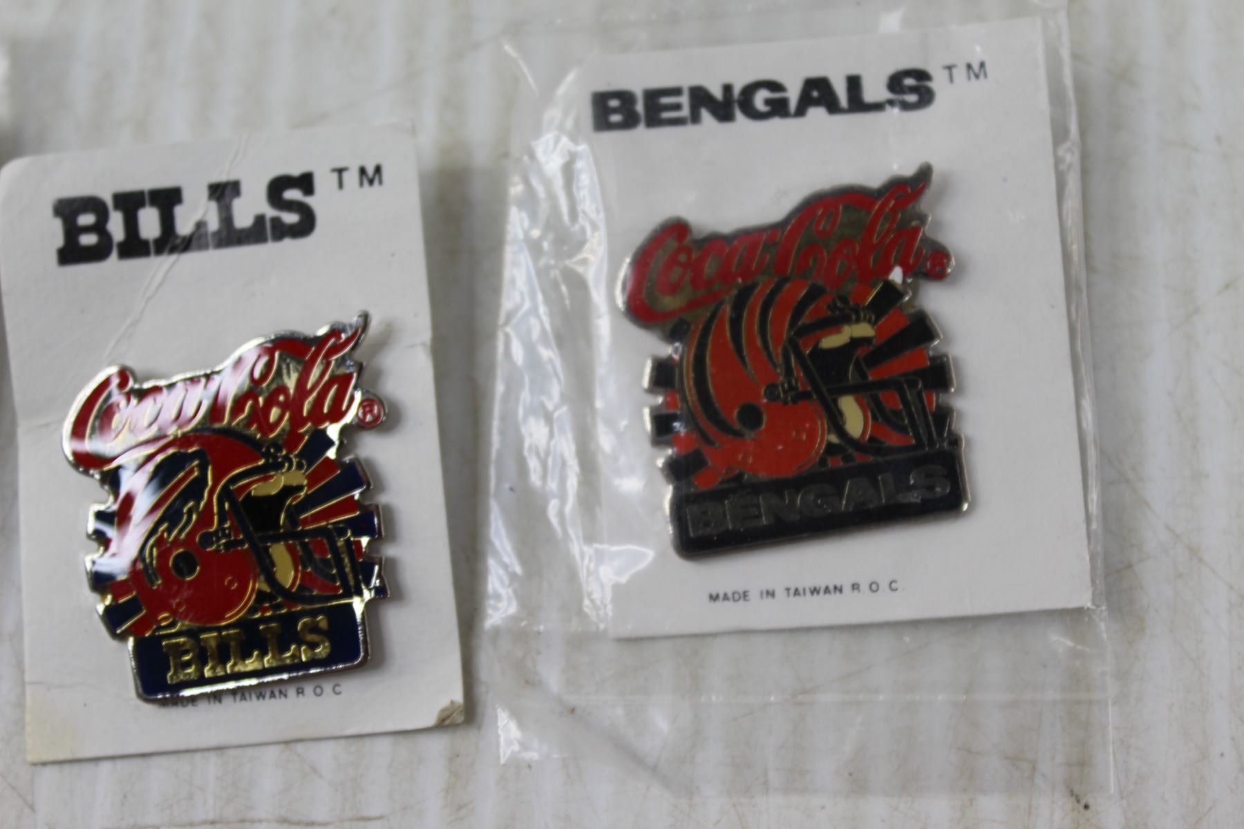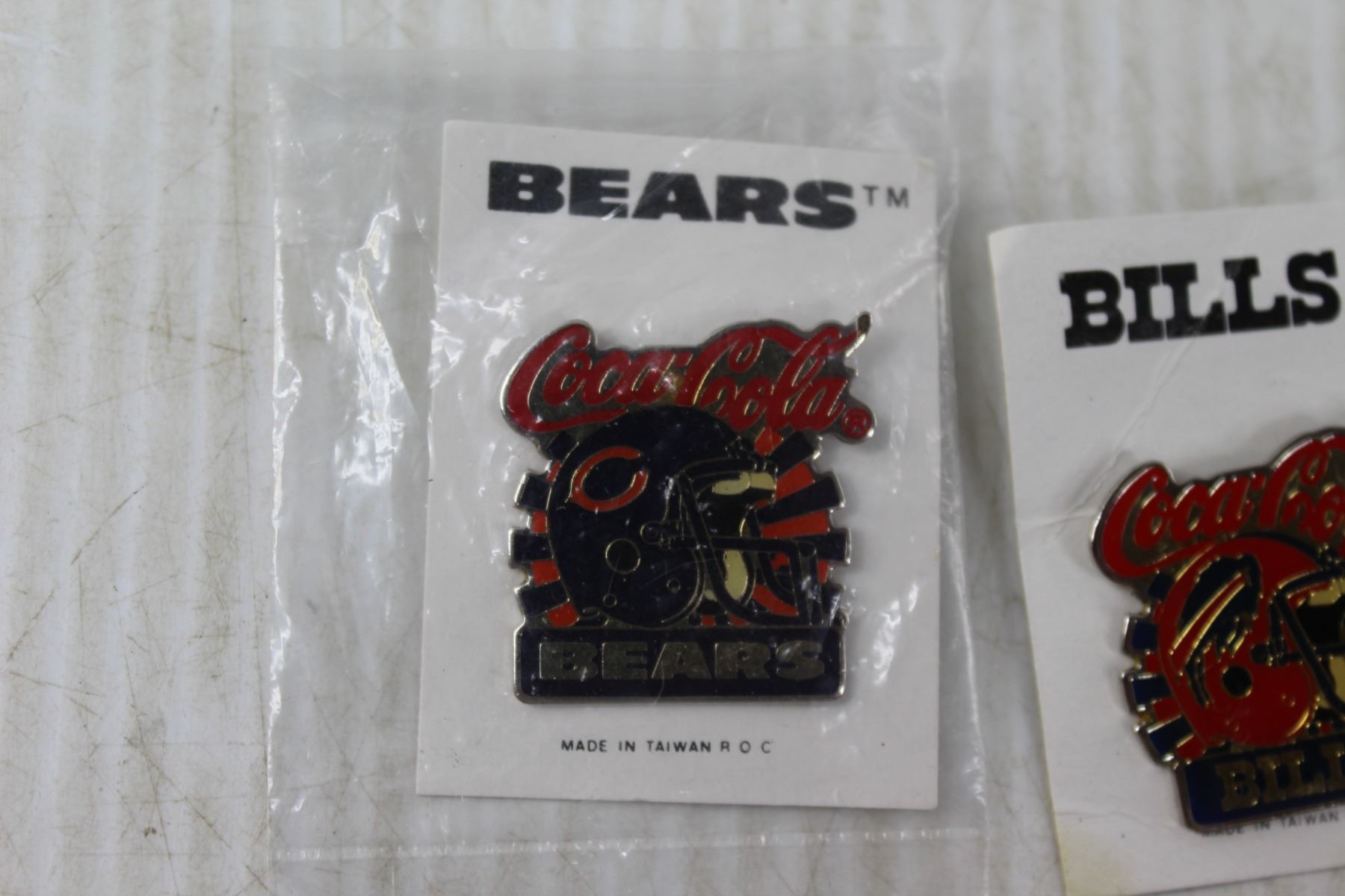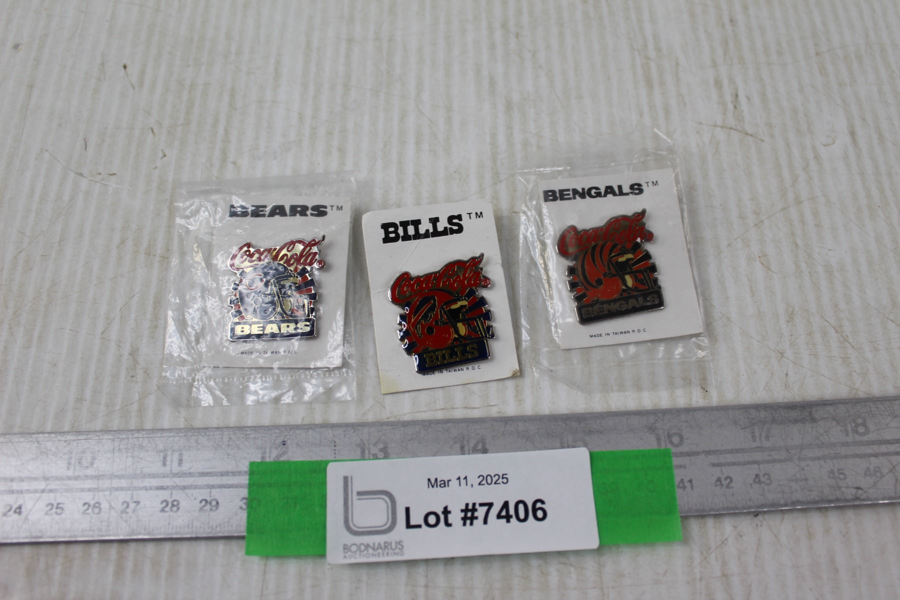 Lot Of (3) NFL Coca- Cola Sponsored Team Pins, Bills, Bears, Misc