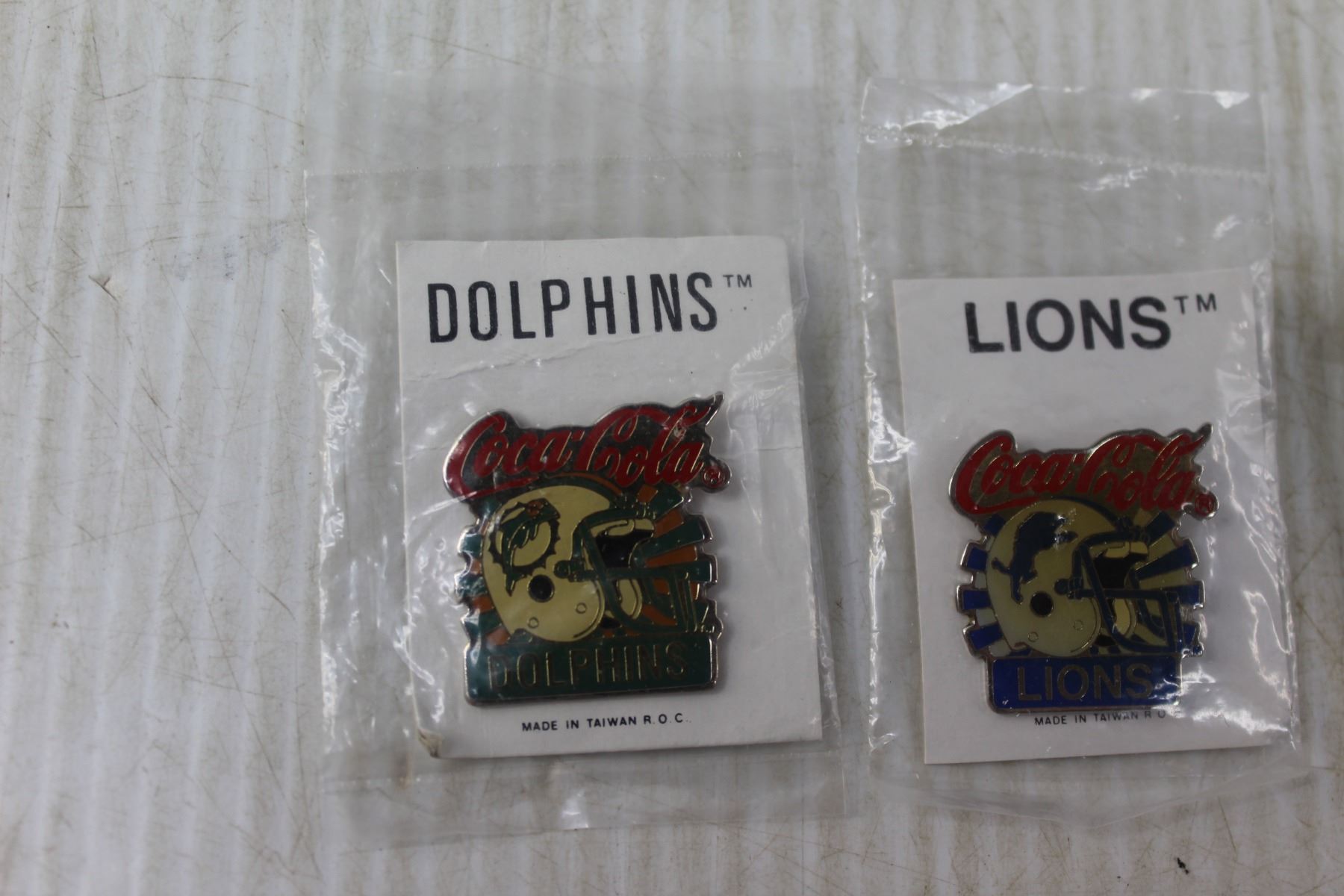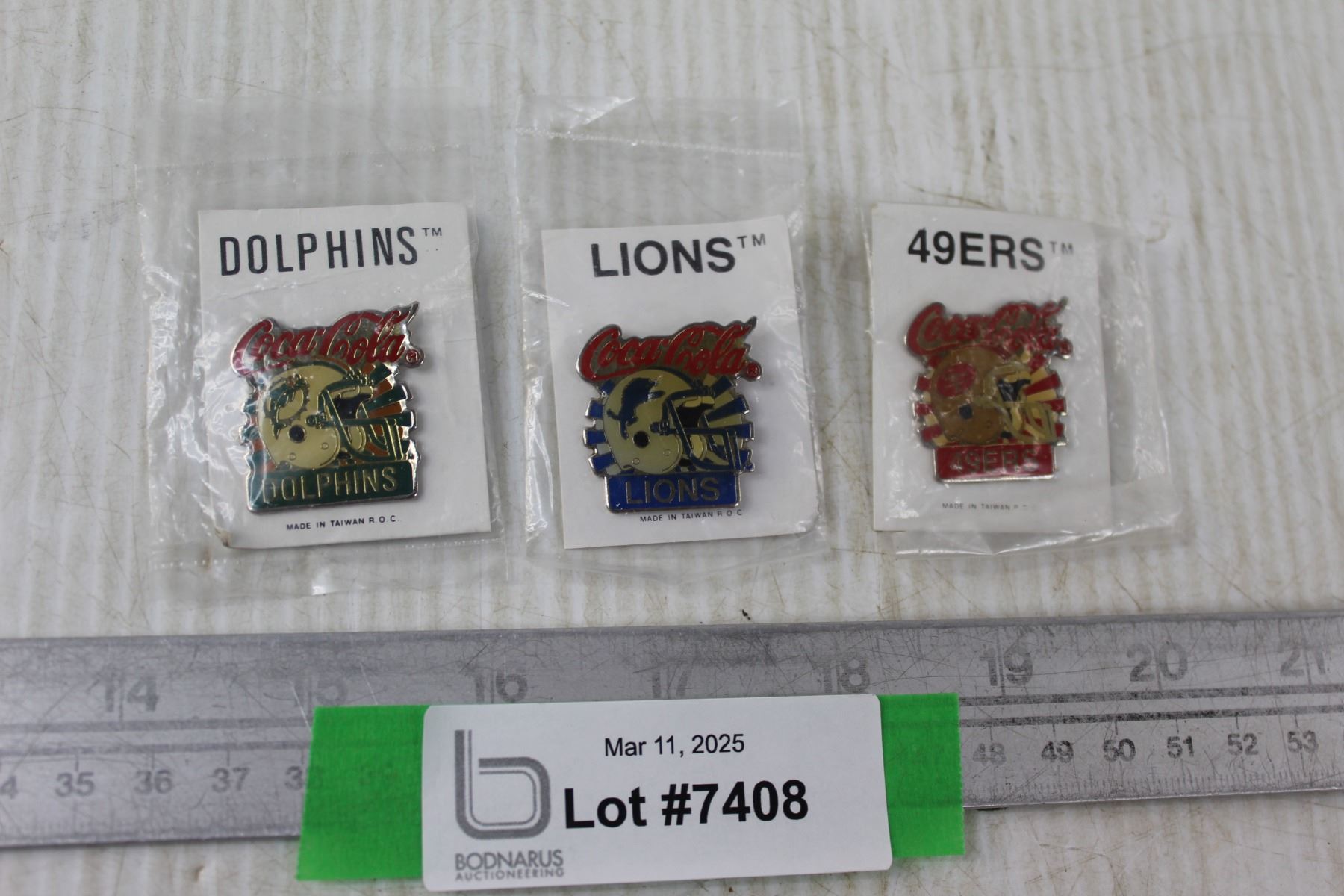 Lot Of (3) NFL Coca- Cola Sponsored Team Pins, Lions, 49ers, Misc