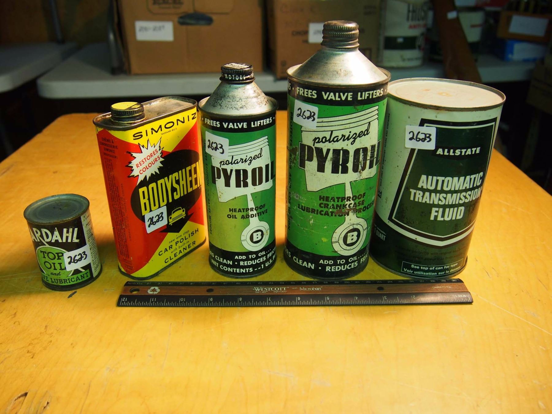Lot Of Assorted Vintage Automotive Lubricant Tins With Contents (Simoniz, Pyroil, Allstate, Bardahl)