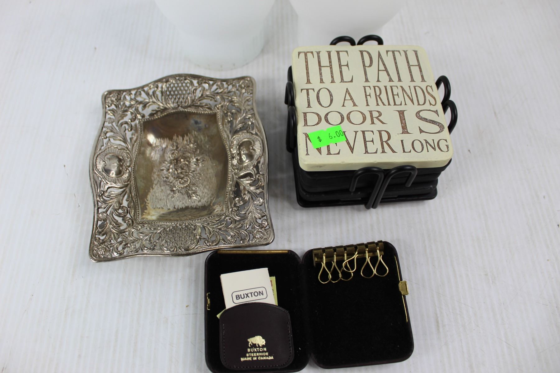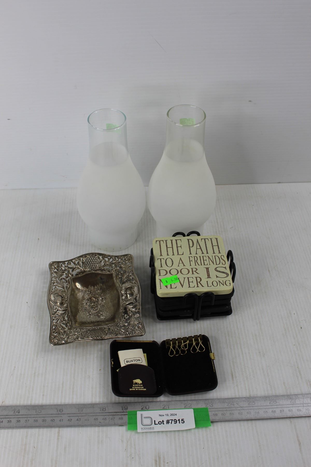 Lot Of Various Items, Coasters, (2) Frosted Glass Lamp Globes, Misc.